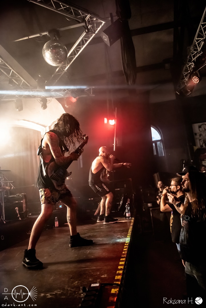 Die zweite Vorband, Archspire, eine kanadische Progressive- und Technical-Death-Metal Band, bespielte um 20.45 Uhr die Bühne und heizte das Publikum an. Zu Beginn gab es eine Ankündigung, der die Band Vertretung angekündigt hat und die „five balding Losers“ anmoderiert wurden. Das jedoch ein sehr missverständlicher Witz war und auf das Alter der Bandmitglieder anspielen sollte. Die rasche Aufforderung zur Moshpit wurde sehr willig beantwortet, auch einige Male von mir. Ich konnte dem Ruf des Pits nicht standhalten. Die Stimmung der Konzertbesucher war sehr angefeuert und es wurde viel aber friedlich gemoshed, ob Circle Pit oder normaler Moshpit. Der Sänger hat zwischen den Liedern öfter einige vulgär humoristische Anmerkungen zu ihren Liedern und den Bandmitgliedern gemacht. Gegen Ende gab es eine Runde Twister in der Moshpit, lustig, und hatte ich noch nie erlebt, und eine Wall of Death durfte auch nicht fehlen, mit sehr aktiver Teilnahme. Lieder der Band, die ich besonders hervorheben möchte, sind Involuntary Doppelgänger und Bleed the Future.