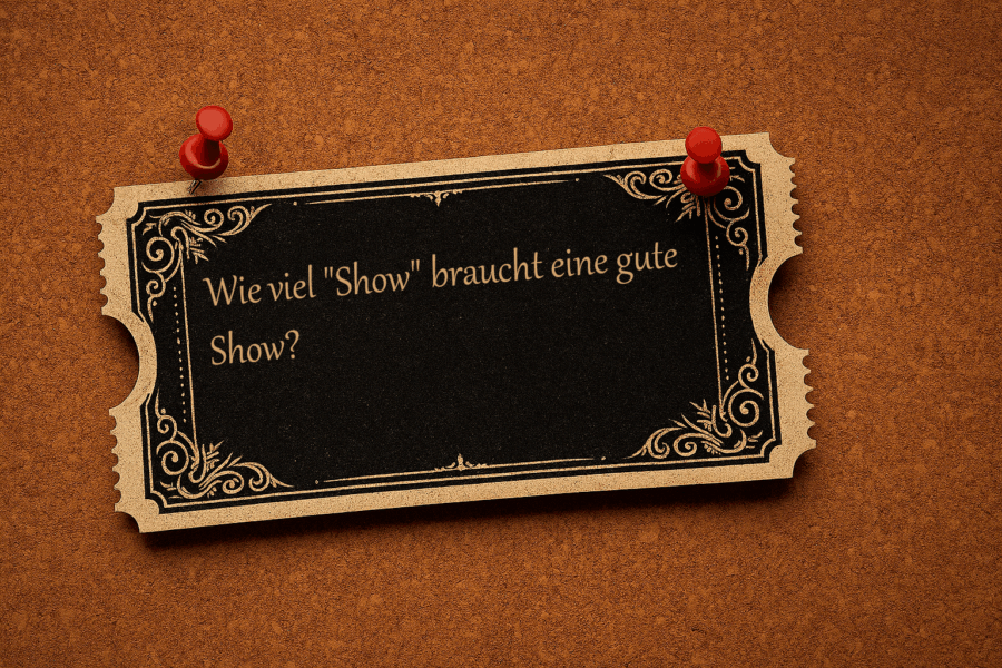 Es gibt also auch für mich Sachertorten-Auftritte, die ich gut finden kann. Entscheidend dabei ist für mich nicht, was (im Sinne von: welches Stilmittel, Showelement, o.ä.) genutzt wird, sondern wie es genutzt wird – zu welchem Zweck, aus welchen Gründen, und wie die konkrete Umsetzung erfolgt. Und sie bleiben letztlich Sachertorten: Absolute Geschmackssache, bei unvorbereiteter Konfrontation irritierend, im Fall von höherem oder regelmäßigen Konsum unter Umständen übelkeiterregend.