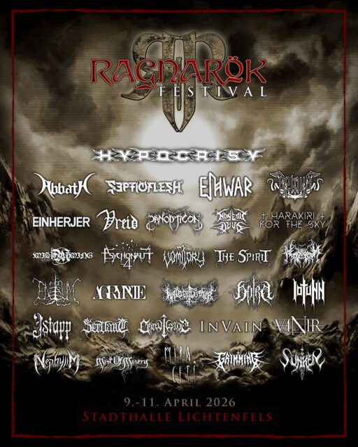 Vom 09. bis 11. April 2026 öffnet die Stadthalle Lichtenfels erneut ihre Tore für eines der bedeutendsten Pagan‑, Viking‑ und Black‑Metal‑Festivals im deutschsprachigen Raum. Mit einer Kapazität von rund 4.000 Besucher*innen zählt das Ragnarök Festival zu den wichtigsten Indoor‑Events der Szene und zieht jährlich Fans aus ganz Europa nach Oberfranken. Auch 2026 verspricht das dreitägige Festival eine Mischung aus etablierten Größen, atmosphärischen Geheimtipps und internationalen Acts, die das Spektrum von melodischem Death Metal über Blackgaze bis hin zu Pagan‑Folk abdecken.