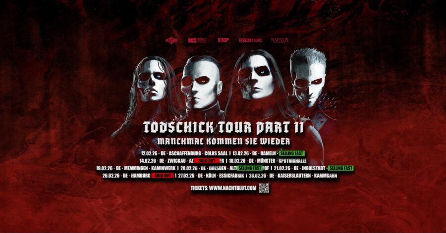 Nachdem sie uns bereits 2025 den Jahresanfang verschönerten, sind Nachtblut auch dieses Jahr wieder unterwegs: Die Todschick Tour geht in die zweite Runde, mit insgesamt zehn Terminen und den Krachwikingern von Asenblut als Support.