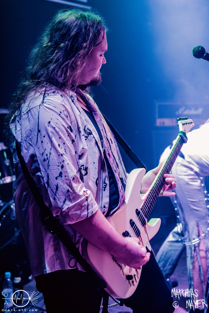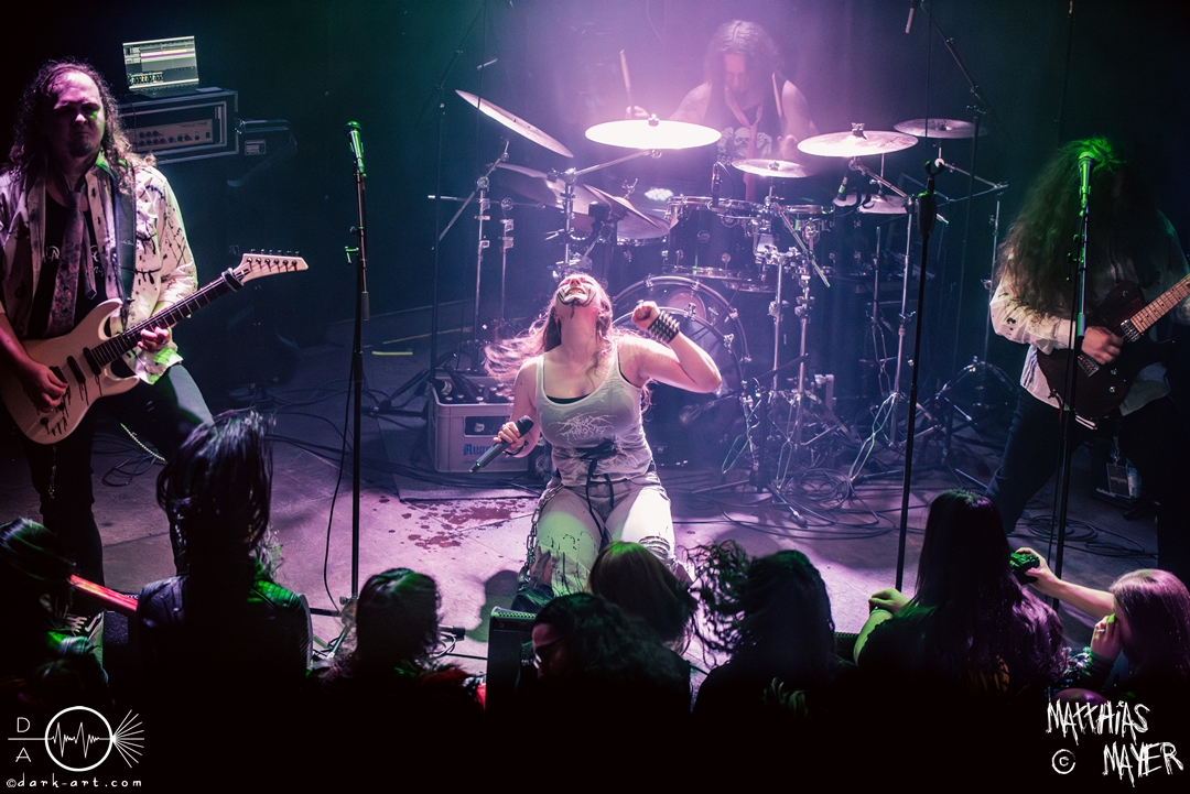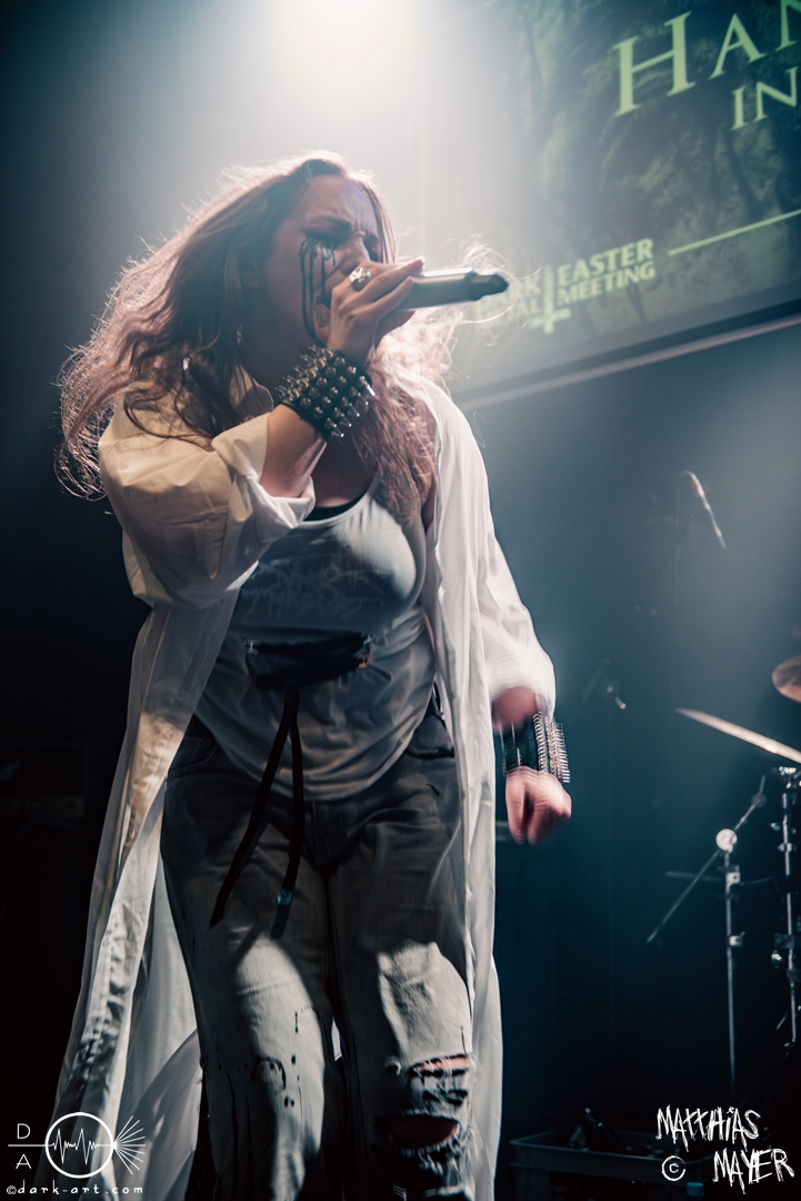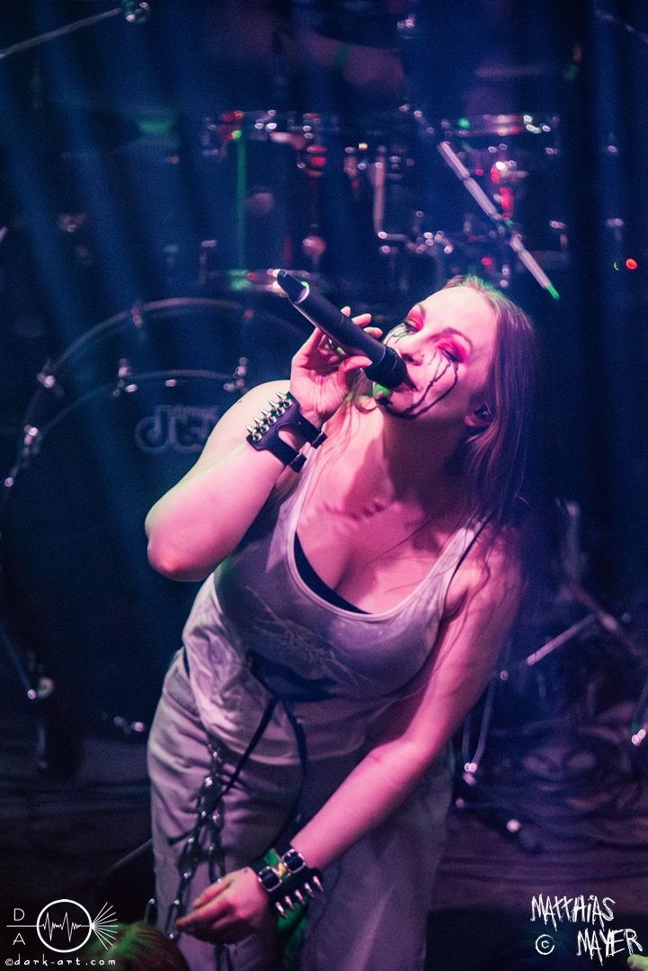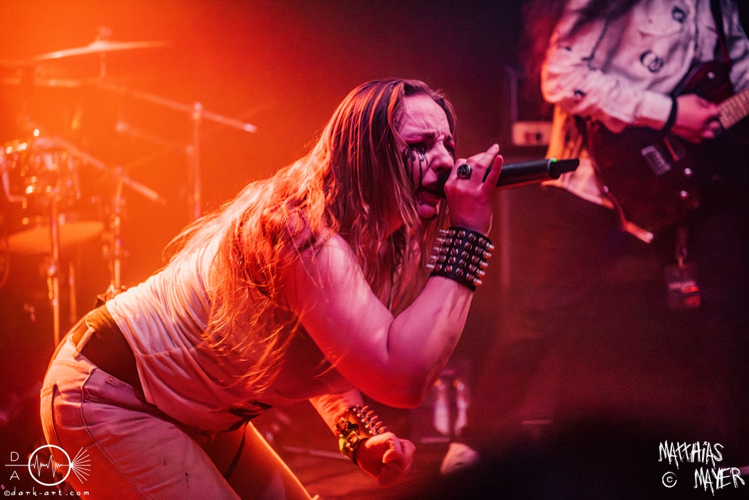 Der Auftritt war ein fiebriger Tanz zwischen Schmerz und Ekstase. Im Zentrum: die Sängerin – mal umklammerte sie das Mikrofon, klagte, schrie, als müsste sie sich die Kehle aus dem Leib reißen, mal wirbelte sie leichtfüßig und losgelöst über die Bühne, als gäbe es keine Schwere in dieser Welt. Der Bruch zwischen diesen Zuständen kam ohne Vorwarnung – surreal, grotesk, fast bizarr. In einem dieser Momente kippte sie sich eine Flasche Wasser über ihr weißes Top und enthüllte dabei ein Dark Throne-Shirt – ein Bild zwischen Ironie, Trotz und tiefer Verbeugung vor dem Genre.