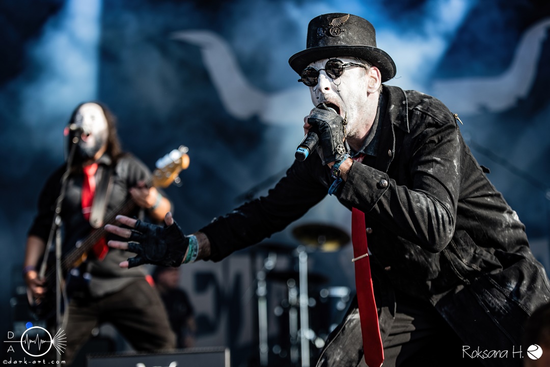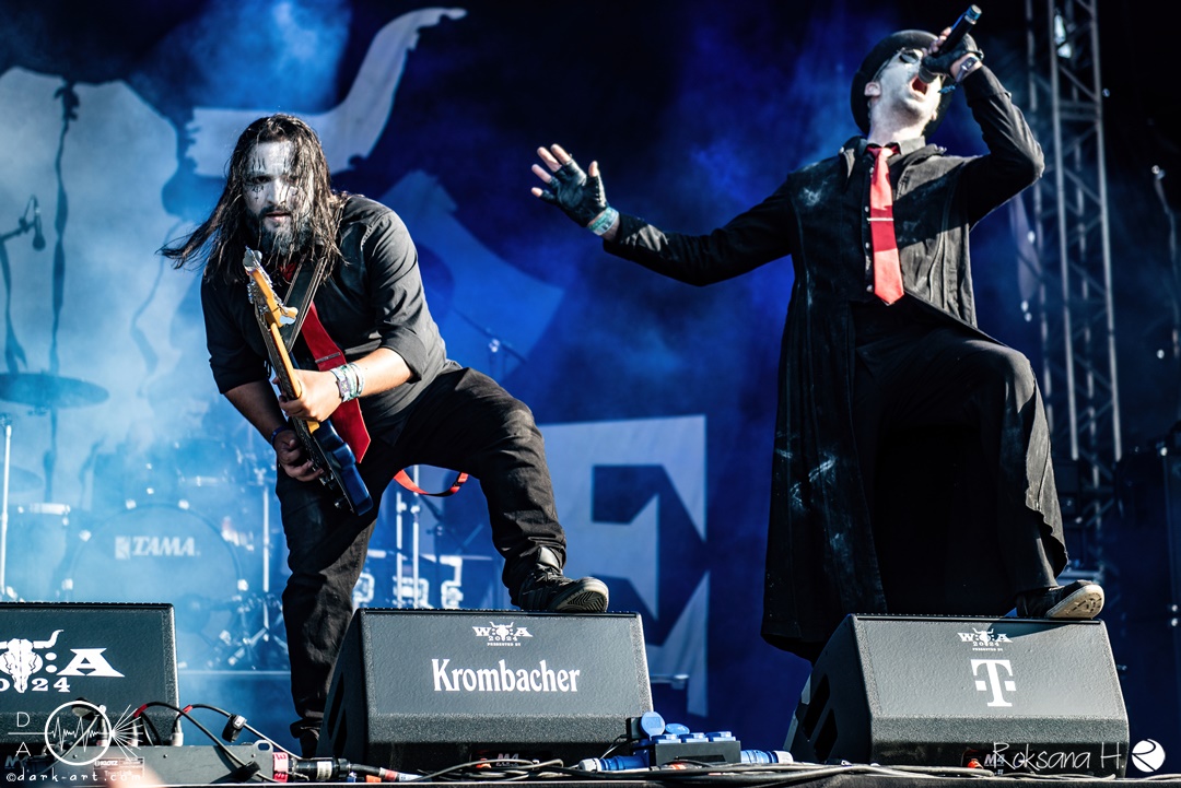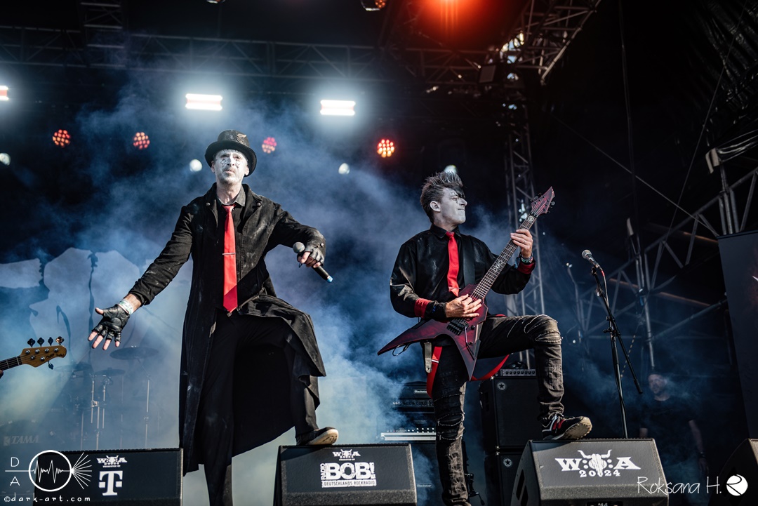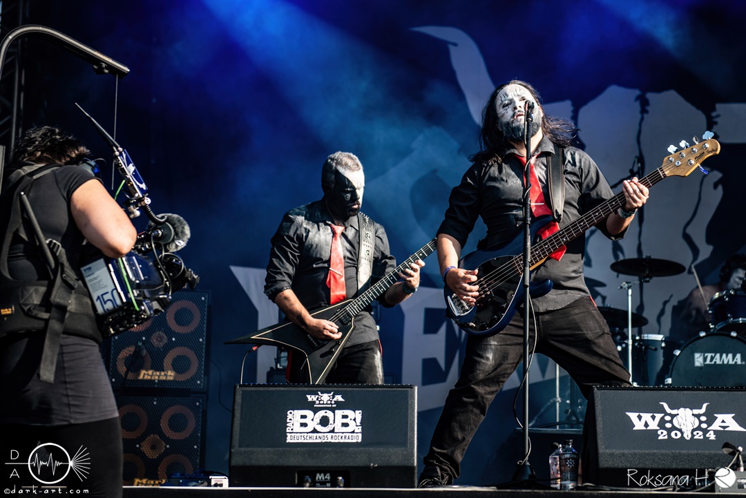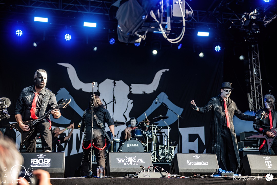 Das sollte sich aber mit dem letzten Wacken Open Air ändern. Wie schon die letzten Jahre habe ich ein größeres Augenmerk auf das Metal Battle gelegt, nicht nur, weil es sein 20-Jähriges feiert, sondern weil ich es immer wieder sehr inspirierend fand. Da meine Kollegen in den Berichten zum Metal Battle jedoch schon einige Band hervorheben konnten, schaute ich nicht schlecht als Carbonic Fields unerwähnt blieben. Um die Band mal für die Leute zu beschreiben, die nicht da waren oder den Stream nicht gesehen haben (Bis zum August 2025 ist der Stream noch auf MagentaMusik zu sehen!) oder gar schon vorher kannten: Eine Gruppe Männer in weiß/schwarz geschminkt, in schicken schwarzen Hemden, schwarzen Jeans und hervorstechenden roten Krawatten, die einmal durch eine Backstube gelaufen sind. Sänger Thomas D’Herbomez trägt dazu einen schwarzen Mantel und Hut. Musikalisch erinnern sie (meiner Meinung nach) an ein uneheliches Kind von Circus of Fools und Russkaja, nur dass ihnen die Folk-Instrumente entwendet wurden. Insgesamt eine kuriose Mischung, die zwar die Intention hat, eine toxische Welt zu spiegeln, doch mich wie ein kleines Kind grinsend und tänzelnd zurücklässt. Auch wenn es laut und derbe ist, zieht der Rhythmus mit und treibt voran. Eins ist sicher, sollte ich sie mal wieder zu Gesicht bekommen können, werde ich es auf jeden Fall nutzen.