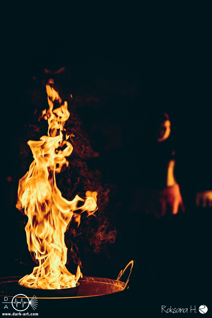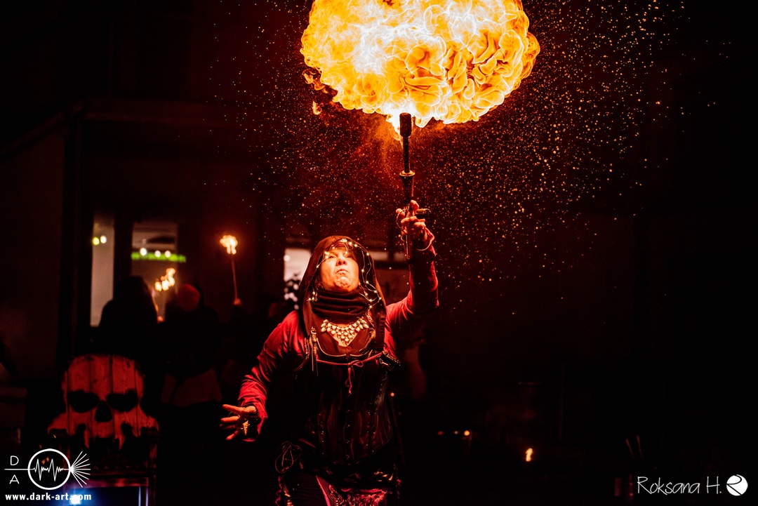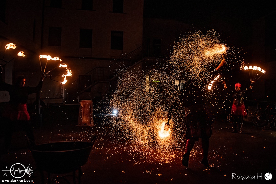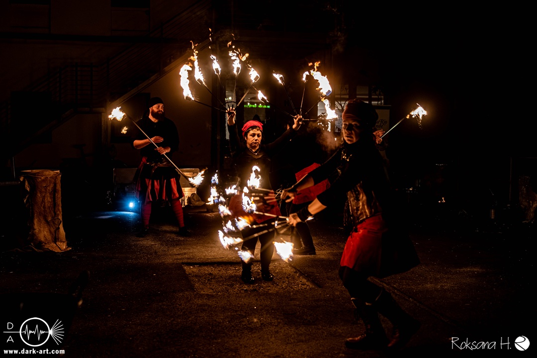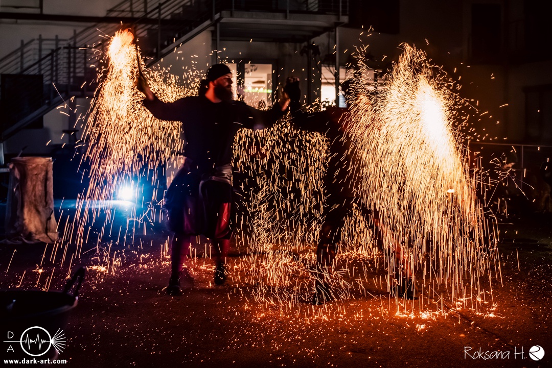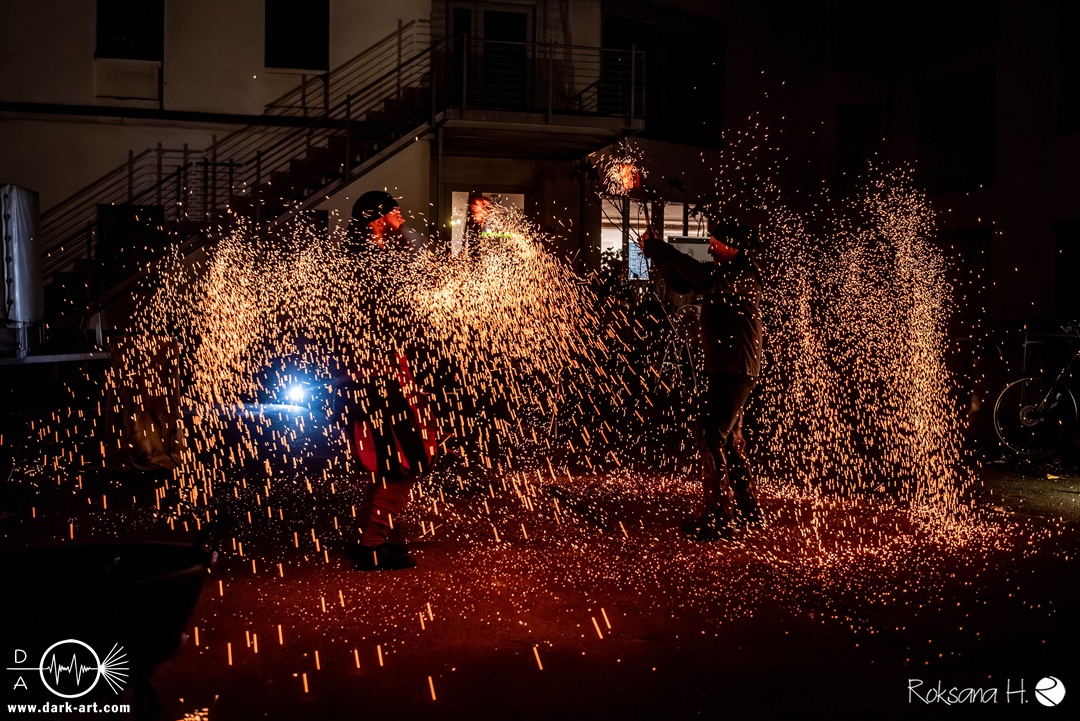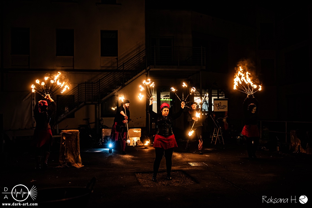 Nach Ende der Livemusik begann ein Teil der Besucher sich vor dem Club zu versammeln, wo die Künstler von FeuRio Grande schon dabei waren ihre Show vorzubereiten. Bei kalten Minusgraden harrten die ersten Besucher schon aus, bis es gegen 22:30 noch kurze Hinweise zur Sicherheit gab. Begleitet von Musik und mit der Andeutung einer dargestellten Geschichte gab es dann die nächsten 20 Minuten eine diverse Feuershow, bei der die Beteiligten eine Vielzahl von Effekten präsentierten.