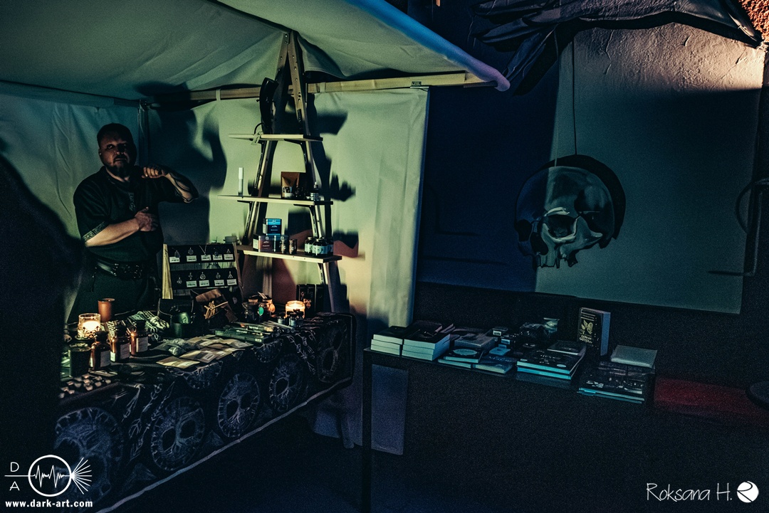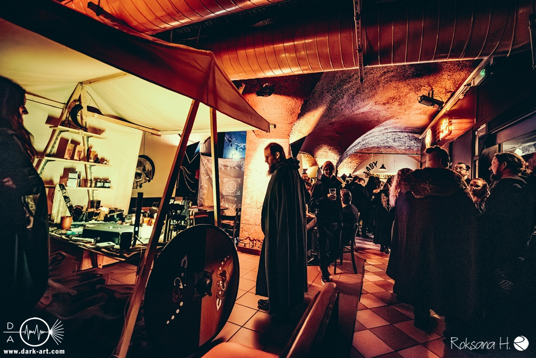 Passend dazu gab es ab 22 Uhr an der hinteren Bar kalten und warmen Met, sowie diverse Beerenweine und eine mittelalterlich angehauchte Speisekarte. Gegenüber gab es einen Verkaufsstand von Runenwald, der neben allerlei Dingen auch Karten legen anbot.