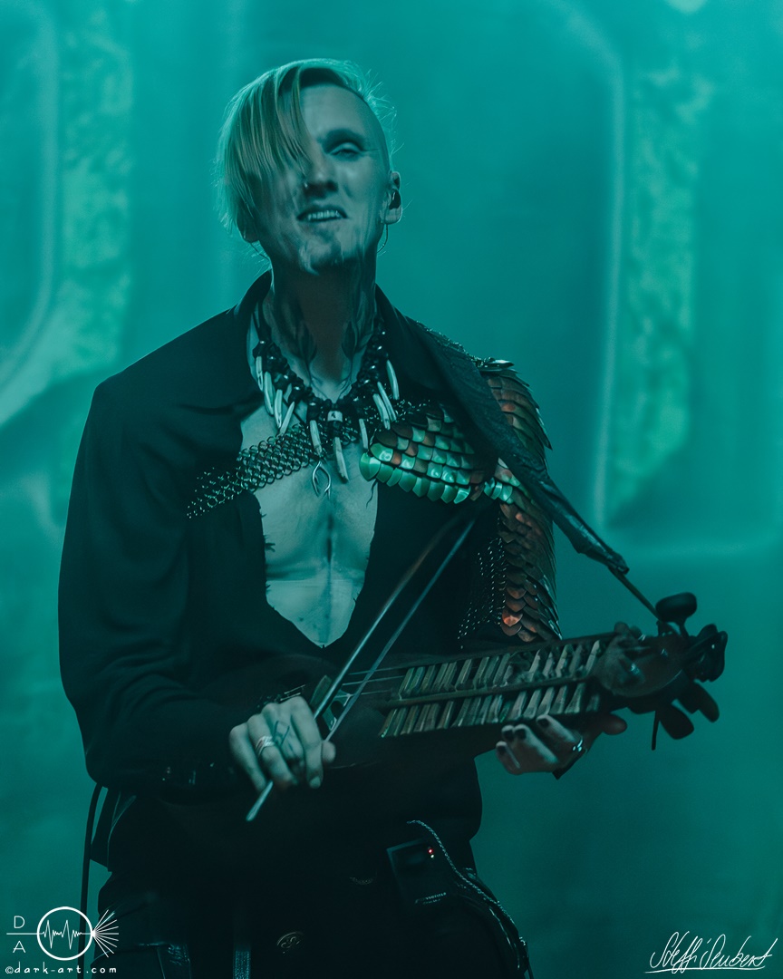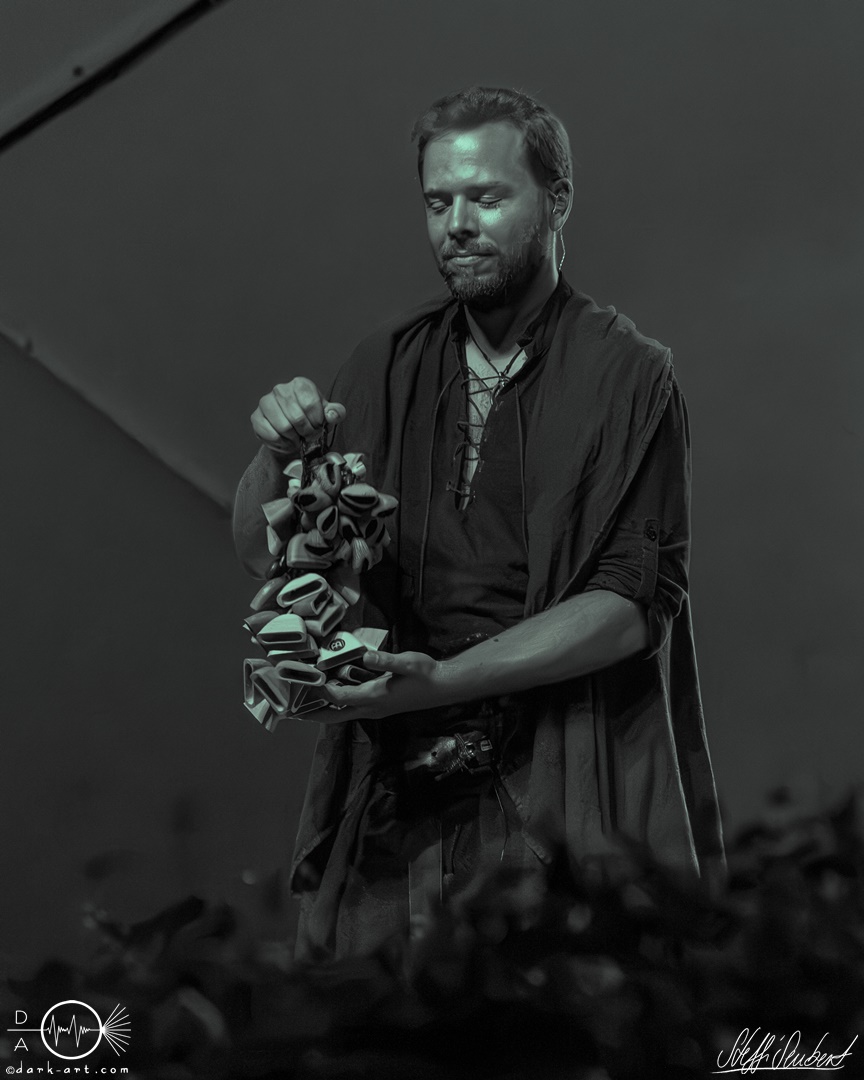 Nach einer kurzen Pause von 25 Minuten ging es intensiv weiter. So hörten wir Geschichten über alltägliche Situationen, wie die Jagd im Wald und das Treffen mit einer Elfenkönigin. Wer von uns erlebt das denn nicht regelmäßig ;). Wir wurden entführt in die nordische Mythologie und der Vertonung der Edda und einem Lied, welches Odin gewidmet ist. Passend zu der Performance wurde die komplette Bühne in grünes oder rotes Licht getaucht, was mit dem ebenfalls grünen Licht im Innenhof einen schönen Kontrast schuf oder einfach wunderbar harmonierte.
