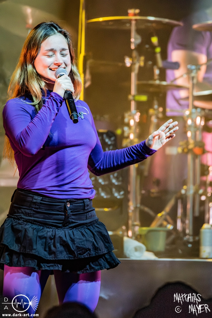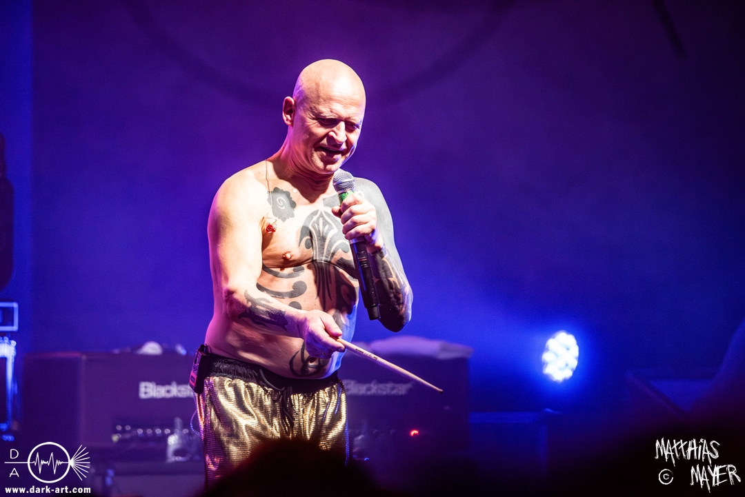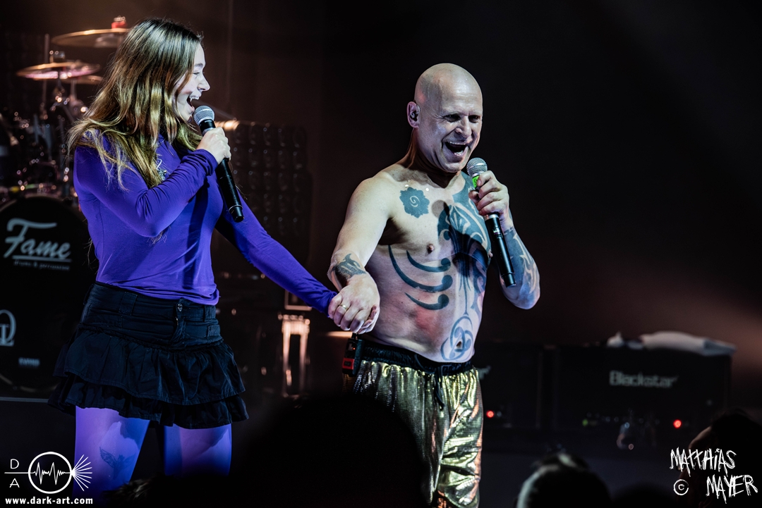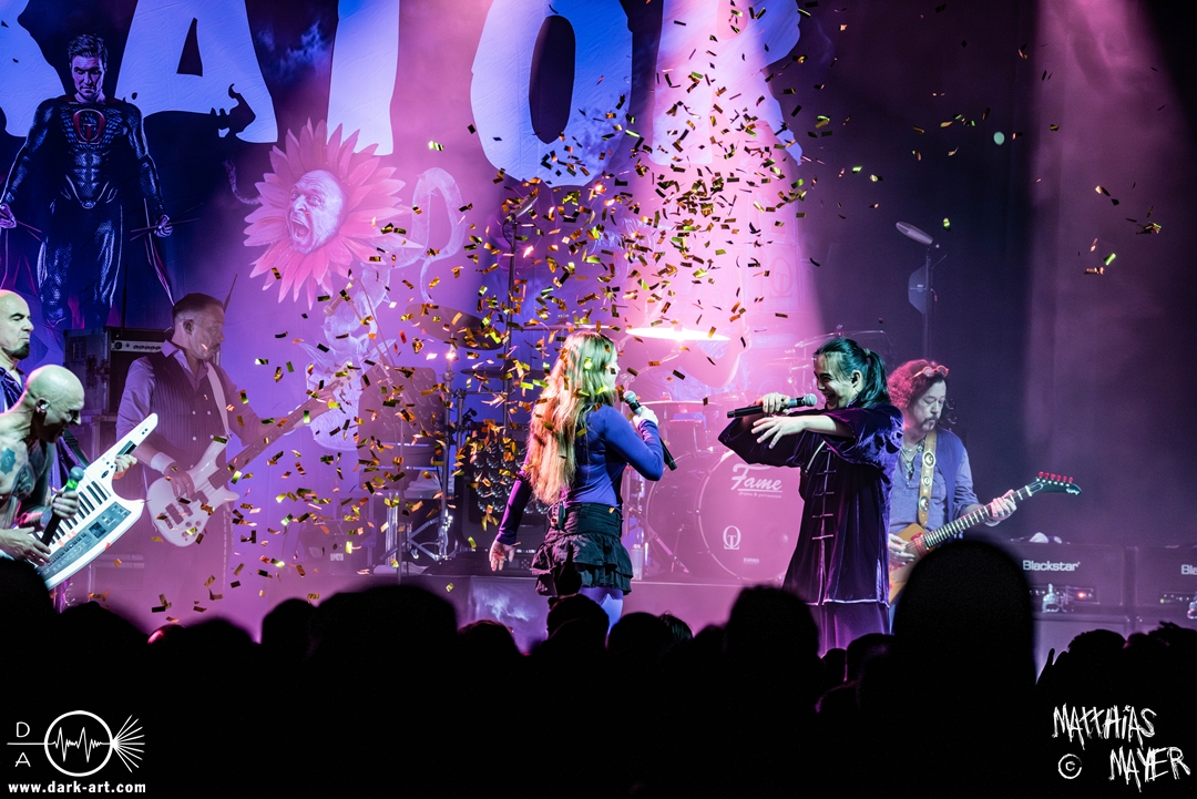 Für den nächsten Song kam erstmals die Backgroundsängerin auf die Bühne: Agnetha, die Tochter von Stumpen. Sie wurde von Tim Tom, dem Sohn von Alf Ator, unterstützt. Beide sangen, Ich verachte Jugendlichr, mit einer stimmlichen Gewalt und mit der passenden Parodie hinten dran. Während des Songs kam dann Stumpen mit Konfettikanone um die Ecke und befeuerte die Kids. Danach folgte ein Solostück von Tim Tom: Böse. Vorher noch im Sopran unterwegs, growlte er jetzt, was das Zeugs hergibt und die Mimik hatte er sich von den Großmeistern Alf Ator und Stumpen abgeguckt. Während des Songs Böse kam Stumpen kurz an die Bühne, ließ seine Hose noch fallen und performte fortan den Rest des Konzerts in goldenen Boxershorts.