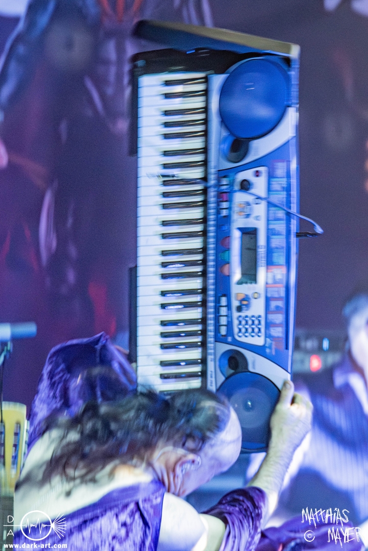 Bei einem Song folgte ein Keyboardsolo von Alf Artor, das Stumpen je nach Applaus mit Konfetti befeuerte. Es war nicht wenig. Bei so viel Einsatz auf der Bühne war auch davor einiges los: Es wurde mitgesungen, getanzt und natürlich Konfettiregen produziert. Bei Eigentum fiel das römische Cape von Alf Artor, das Stumpen brav aufräumte, bevor er – das Mikro zwischen die Oberschenkel pressend – den Keyboardpart übernahm. Natürlich nicht, ohne Grimassen zu schneiden oder Konfetti vom Keyboard zu pusten.
