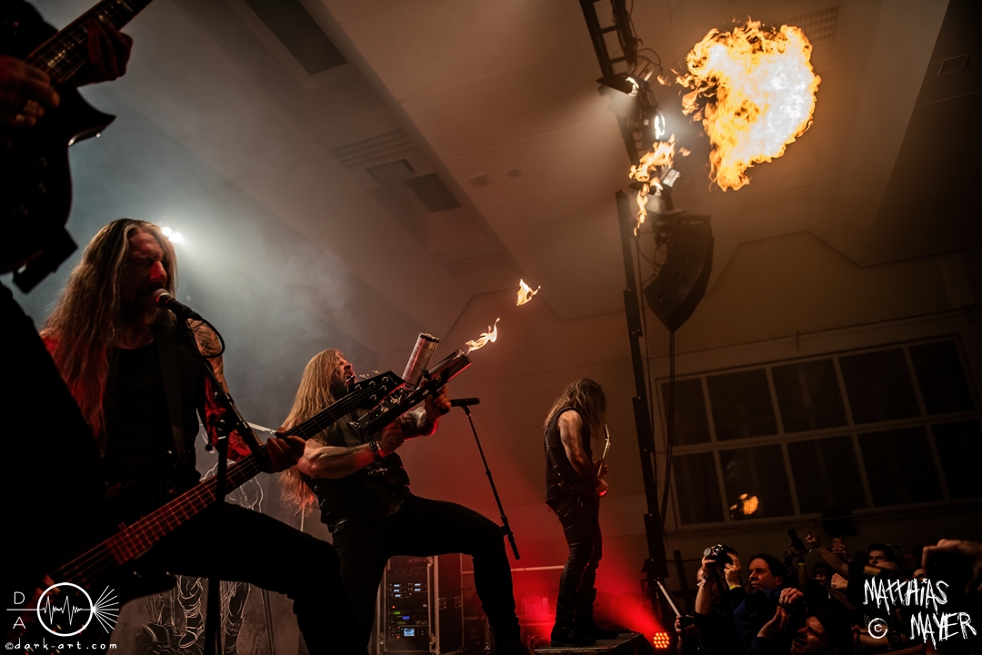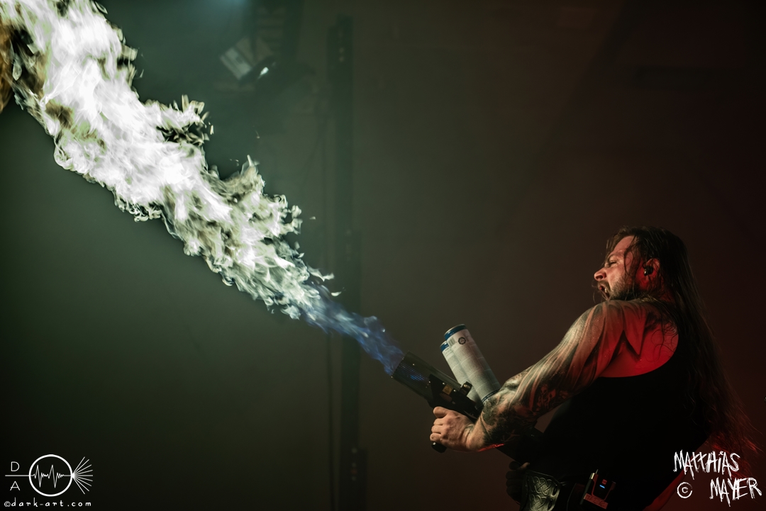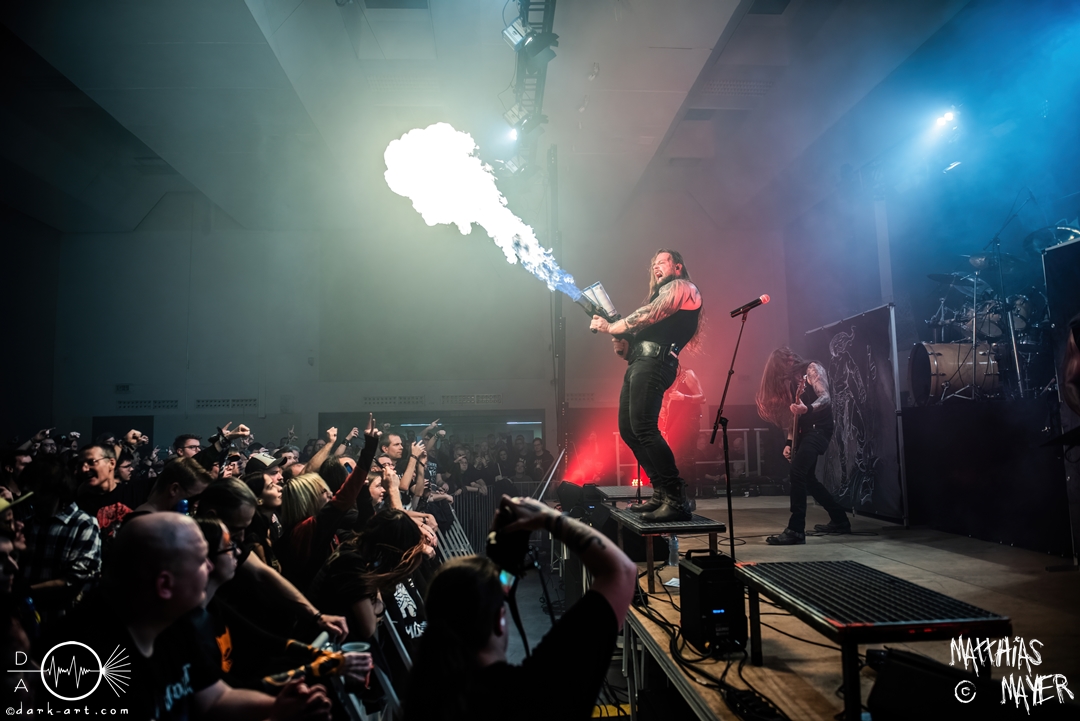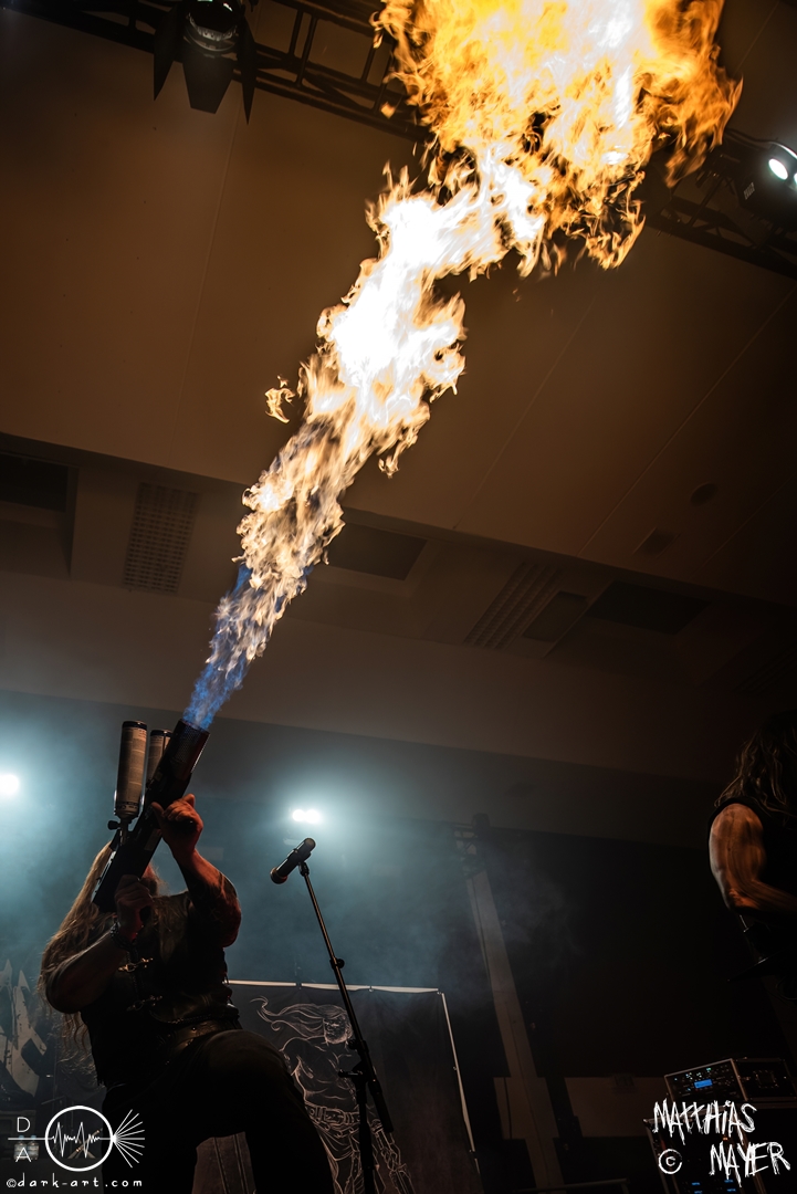 Nach den Spielleuten ging es zu den großen, starken Recken von Asenblut über! Der Kriegerepos rund um die Band aus Göttingen begann und endete mit brachialem Sound und Feuer! Schon beim ersten Lied packte Sänger Tetzel einen kleinen Flammenwerfer aus und verschoss Feuer über die Köpfe der begeisterten Zuschauer. Vorab möchte ich noch einige Worte zu den optischen Aspekten der Band verlieren. Auf der Bühne standen zwei Aufsteller mit Bildern von halbnackten Kriegern, welche selbst Manowar Respekt eingeflößt hätten. Die einzelnen Bandmitglieder brauchten sich nicht hinter den Bildern verstecken, bei den beeindruckenden und entblößten Oberarmen. Scheinbar ist Sport eine weitere gemeinsame Leidenschaft, neben brutalem Pagan Metal. So liefen vier ausdrucksstarke Musiker auf der Bühne umher und zu keinem Moment ließ der Druck der Musik nach. Zu dem Lied Seite an Seite zog Tetzel die Weste aus und präsentierte uns den Gewichthebergürtel der nordischen Götter. Eine kleine Premiere war auch dabei. Der Song Unbesiegbar vom kommenden Album, welches während des Wacken Open Airs veröffentlich werden soll, wurde gespielt. In der Zwischenzeit trommelte sich, animiert von den Liedern über Mut und Stärke, eine Schar bewegungsfreudiger Personen zusammen und es entstand der erste, ausgewachsene Mosh Pit des Abends. Wie bereits erwähnt, erschein der Sänger bei dem Song 300 wieder mit dem handlichen Handflammenwerfer und es wurde ein weiteres Mal die Luft ausgiebig mit Flammen geschwängert, bevor die Show danach mit dem Song Asenblut zu Ende ging.