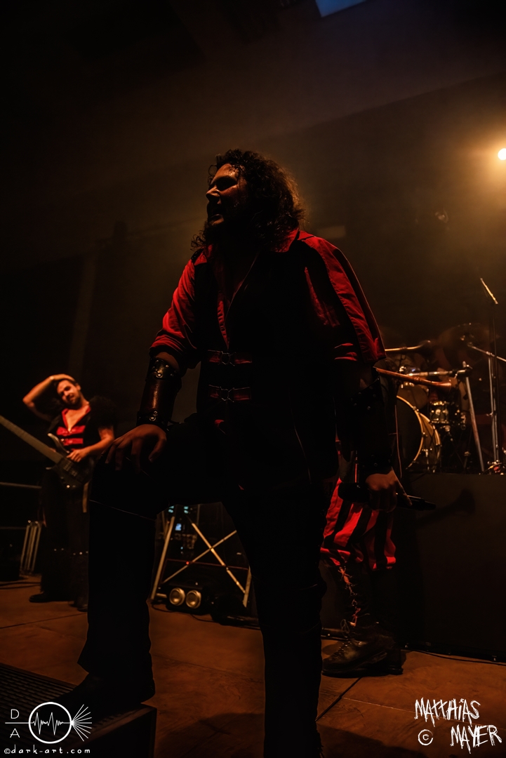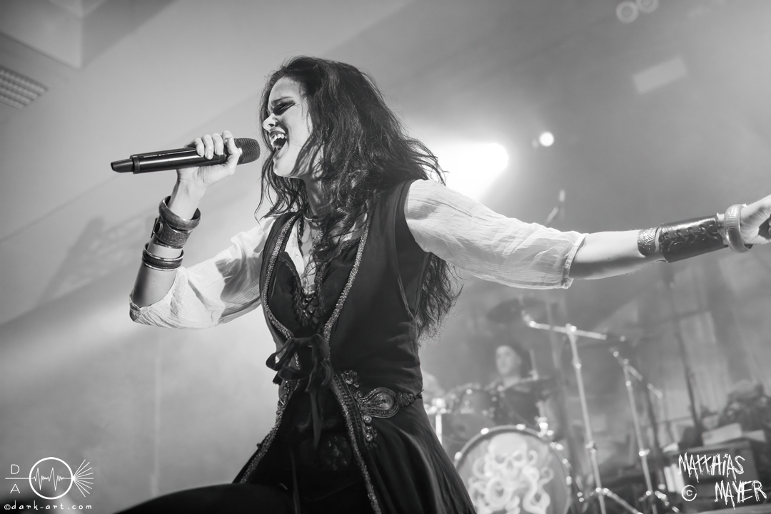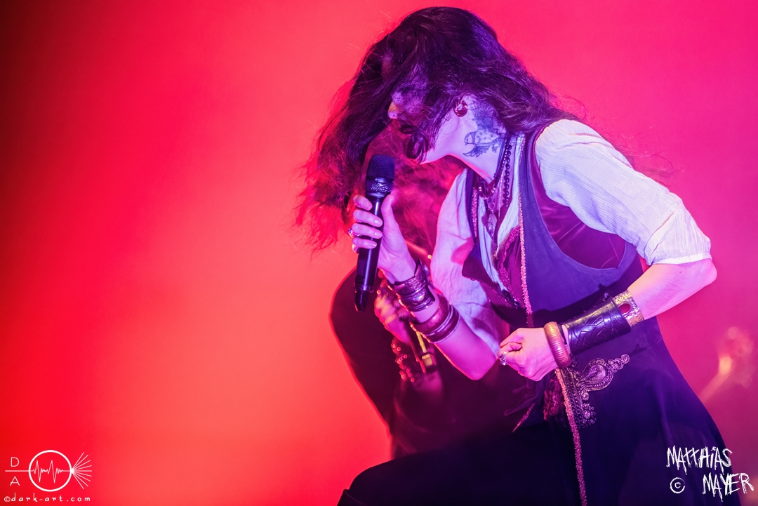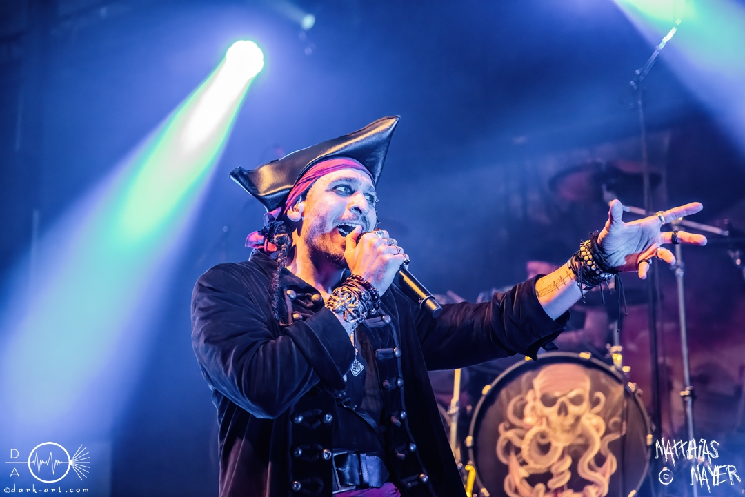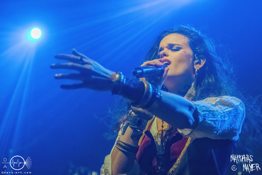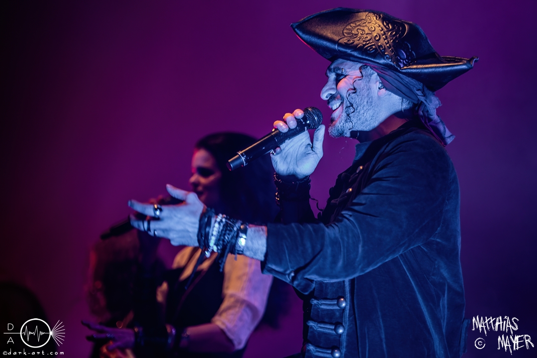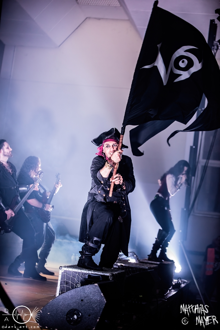 Während des Umbaus verwandelte sich die Bühne stückchenweise zu einem waschechten Piratenschiff und dies war auch notwendig, da die Crew der Visions of Atlantis auf dem No-SAX Segel setzte. Die Symphonic-Metal-Piraten hatten einen beeindruckenden Auftritt mit viel Schauspiel und viel Humor hingelegt, denn diese Band erzählt während des Auftrittes romantisierte Piratengeschichten. Doch erstmal alles auf Anfang. Die Musiker in eindrucksvollen Kleidungen, die allesamt vom Set des nächsten Teils der Pirates of the Caribbean Reihe stammen könnten, waren sehr eindrucksvoll und ausdrucksstark. Die Ventilatoren, die wir von Isn’t noch kannten, verstärkten den Eindruck von wehenden Haaren in der steifen Prise. Im Mittelpunkt der Show standen Clémentine Delauney und Michele Guaitoli, die beiden Sänger der Band. Ständig lagen sich die beiden Personen spielerisch im Streit und jagten sich über das „Schiff“. Dabei wechselten sie gekonnt ihre Gesangspassagen ab. Es war spannend ihnen dabei zuzusehen, wenn zum Beispiel Clémentine ihrem Mitsänger den Dreispitz entwendete und sich selbst aufsetzte. Zwischendurch gab es einen humoristischen Gag mit einem Holzstab, auf dem Michele versuchte wie auf einem Musikinstrument zu spielen. Dies misslang ihm natürlich, aber der Drummer Thomas Caser konnte einige liebliche Flötentöne dazu beisteuern. Für das Lied Freedom wurde die gesamte Halle verdunkelt, damit alle Zuschauer ihre Feuerzeuge oder Mobiltelefone zücken und aufleuchten lassen konnten, um eine besondere Stimmung zu erwirken. Der Auftritt blieb weiter atmosphärisch, wenn beispielsweise Nebel und blaues Licht auf der Bühne den Eindruck von Sonnenstrahlen unter der Wasseroberfläche erschufen. Bei den letzten drei Songs kam wieder etwas Schwung in die Halle. So sollten die Zuschauer bei Melancholy Angel in die Hocke gehen und danach wild umher springen und für Pirates Will Return ruderte ein Drittel der Besucher vor der Bühne in langen Reihen. Zum Abschluss mit Legion Of The Seas entrollten die Seefahrer noch ihren mächtigen Jolly Roger und ließen die Fahne an einem Stab beeindruckend durch die Luft gleiten. Nach dem letzten Lied zeigten sie uns noch eine neue Art überflüssige Setlisten unter das Volk zu bringen. Zusammengeknüllte Blätter wurden wie ein Baseball mit der Gitarre in die Halle geschlagen. Ein humorvolles Ende für die akustischen Raubzüge von Visions of Atlantis.