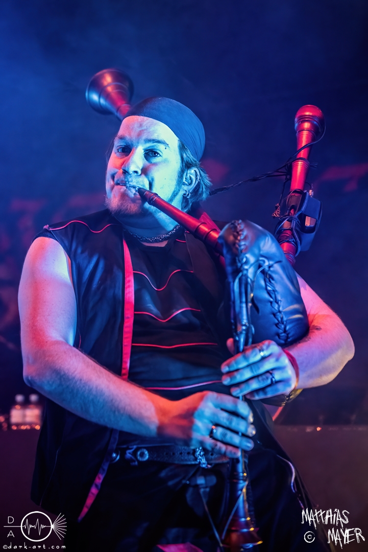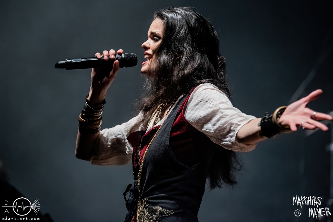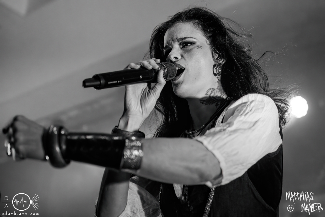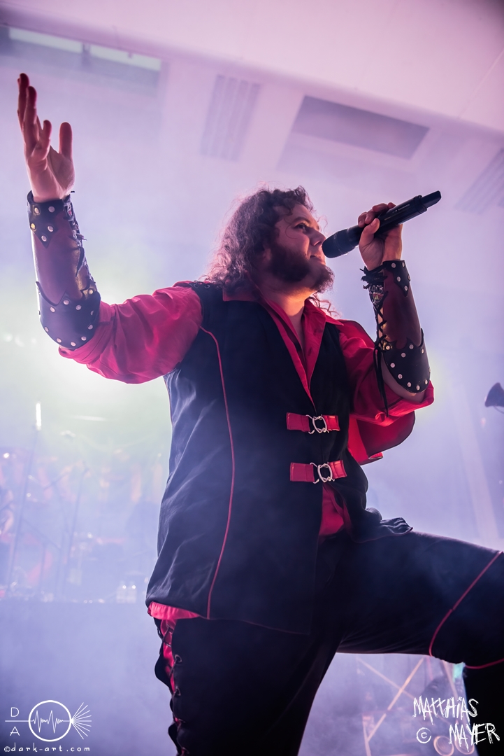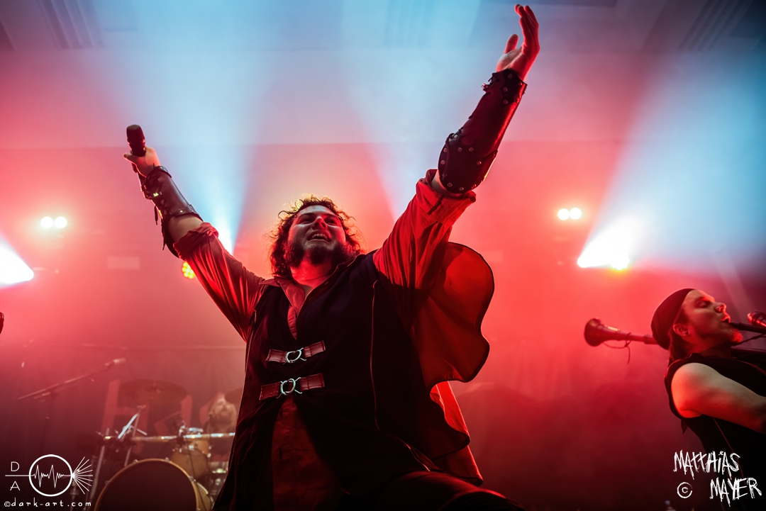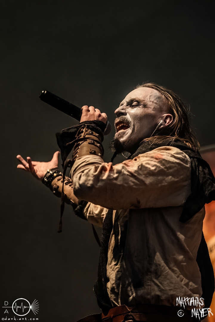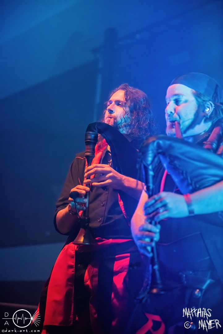 Während des Umbaus verwandelte sich die Bühne stückchenweise zu einem waschechten Piratenschiff und dies war auch notwendig, da die Crew der Visions of Atlantis auf dem No-SAX Segel setzte. Die Symphonic-Metal-Piraten hatten einen beeindruckenden Auftritt mit viel Schauspiel und viel Humor hingelegt, denn diese Band erzählt während des Auftrittes romantisierte Piratengeschichten. Doch erstmal alles auf Anfang. Die Musiker in eindrucksvollen Kleidungen, die allesamt vom Set des nächsten Teils der Pirates of the Caribbean Reihe stammen könnten, waren sehr eindrucksvoll und ausdrucksstark. Die Ventilatoren, die wir von Isn’t noch kannten, verstärkten den Eindruck von wehenden Haaren in der steifen Prise. Im Mittelpunkt der Show standen Clémentine Delauney und Michele Guaitoli, die beiden Sänger der Band. Ständig lagen sich die beiden Personen spielerisch im Streit und jagten sich über das „Schiff“. Dabei wechselten sie gekonnt ihre Gesangspassagen ab. Es war spannend ihnen dabei zuzusehen, wenn zum Beispiel Clémentine ihrem Mitsänger den Dreispitz entwendete und sich selbst aufsetzte. Zwischendurch gab es einen humoristischen Gag mit einem Holzstab, auf dem Michele versuchte wie auf einem Musikinstrument zu spielen. Dies misslang ihm natürlich, aber der Drummer Thomas Caser konnte einige liebliche Flötentöne dazu beisteuern. Für das Lied Freedom wurde die gesamte Halle verdunkelt, damit alle Zuschauer ihre Feuerzeuge oder Mobiltelefone zücken und aufleuchten lassen konnten, um eine besondere Stimmung zu erwirken. Der Auftritt blieb weiter atmosphärisch, wenn beispielsweise Nebel und blaues Licht auf der Bühne den Eindruck von Sonnenstrahlen unter der Wasseroberfläche erschufen. Bei den letzten drei Songs kam wieder etwas Schwung in die Halle. So sollten die Zuschauer bei Melancholy Angel in die Hocke gehen und danach wild umher springen und für Pirates Will Return ruderte ein Drittel der Besucher vor der Bühne in langen Reihen. Zum Abschluss mit Legion Of The Seas entrollten die Seefahrer noch ihren mächtigen Jolly Roger und ließen die Fahne an einem Stab beeindruckend durch die Luft gleiten. Nach dem letzten Lied zeigten sie uns noch eine neue Art überflüssige Setlisten unter das Volk zu bringen. Zusammengeknüllte Blätter wurden wie ein Baseball mit der Gitarre in die Halle geschlagen. Ein humorvolles Ende für die akustischen Raubzüge von Visions of Atlantis.