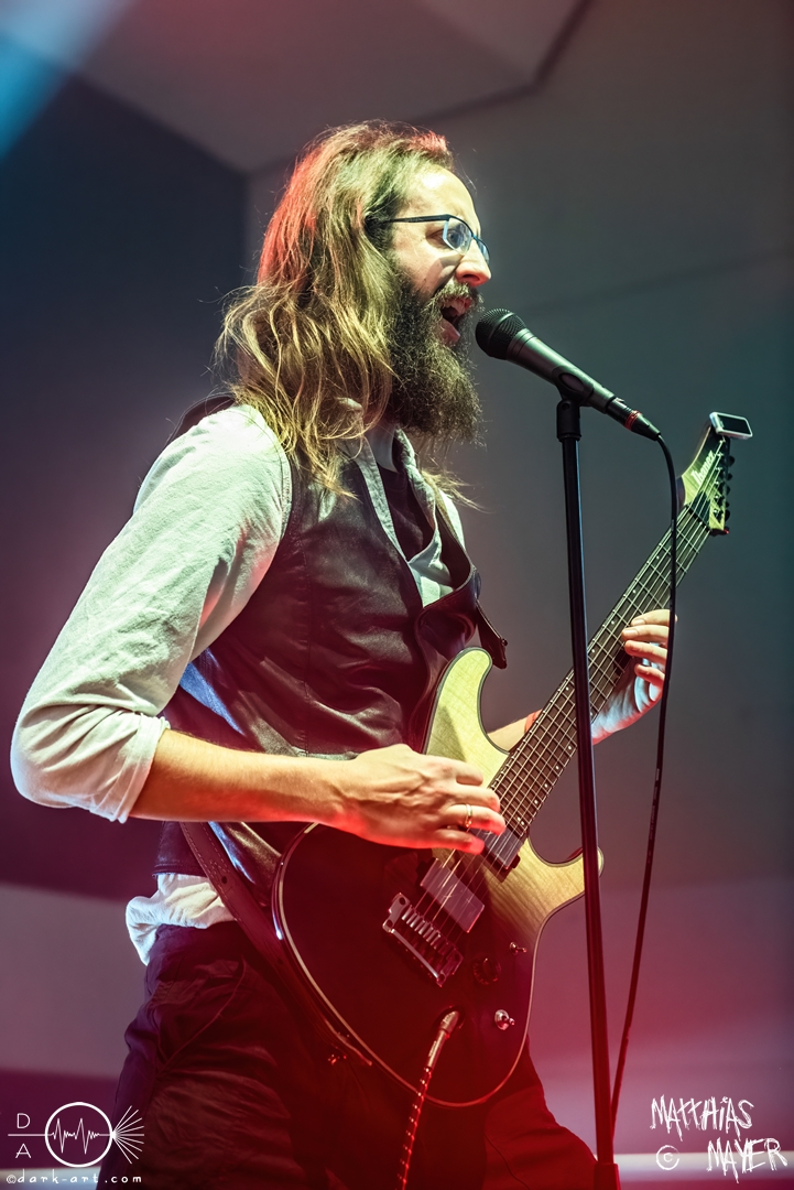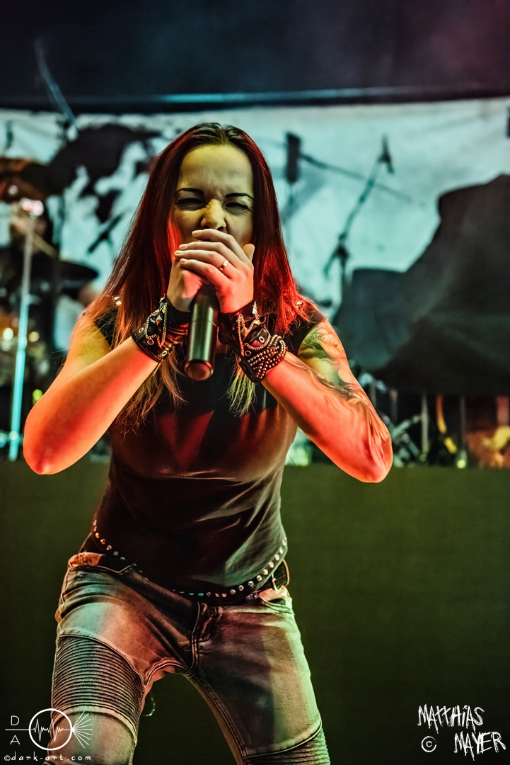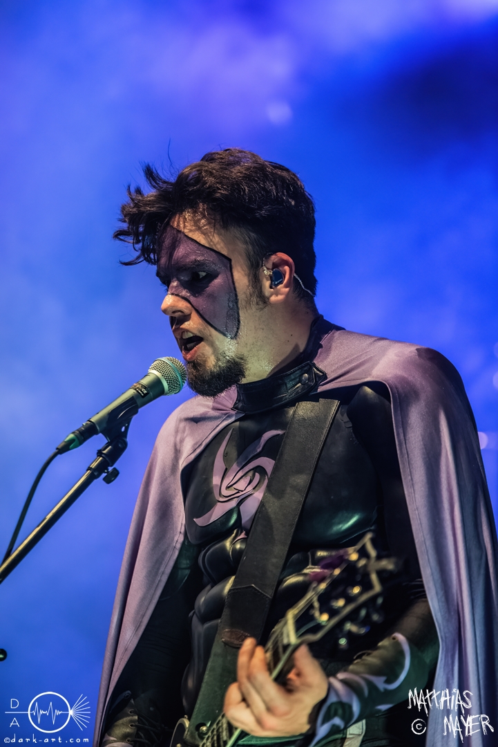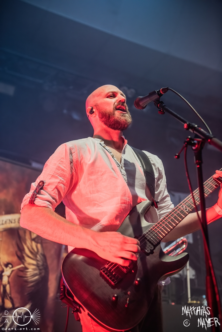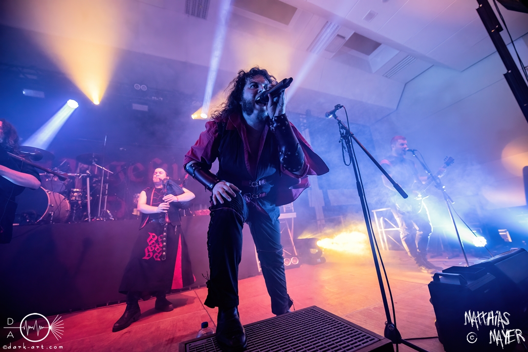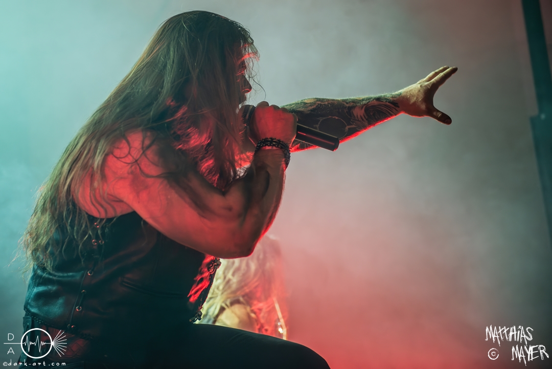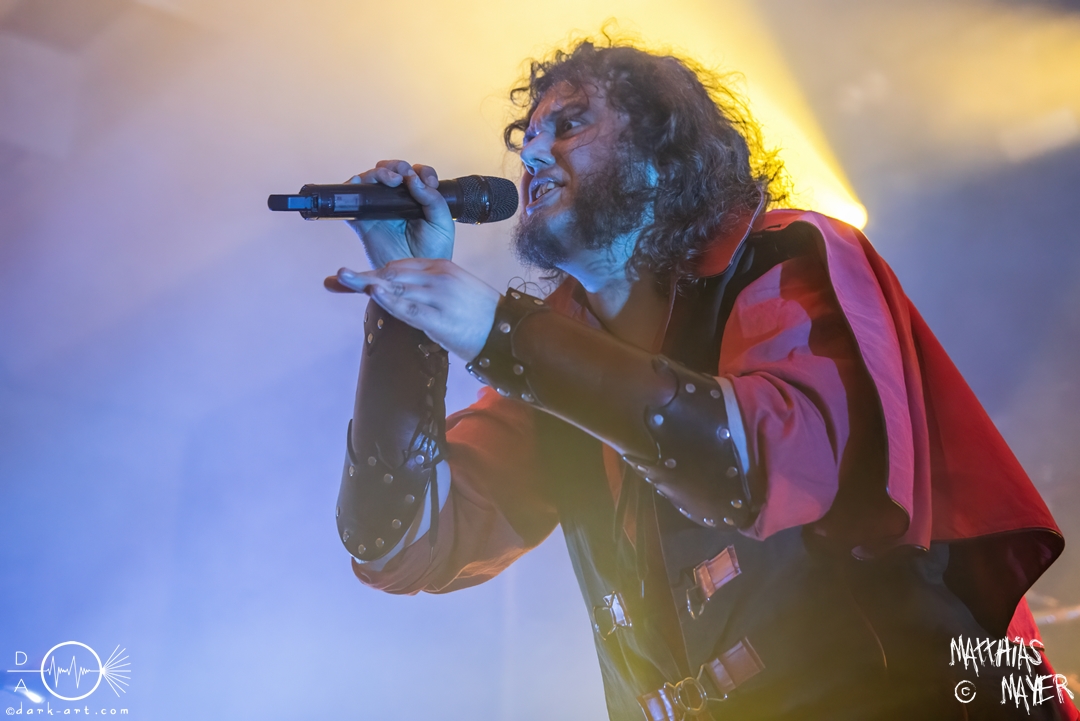 Während des Umbaus verwandelte sich die Bühne stückchenweise zu einem waschechten Piratenschiff und dies war auch notwendig, da die Crew der Visions of Atlantis auf dem No-SAX Segel setzte. Die Symphonic-Metal-Piraten hatten einen beeindruckenden Auftritt mit viel Schauspiel und viel Humor hingelegt, denn diese Band erzählt während des Auftrittes romantisierte Piratengeschichten. Doch erstmal alles auf Anfang. Die Musiker in eindrucksvollen Kleidungen, die allesamt vom Set des nächsten Teils der Pirates of the Caribbean Reihe stammen könnten, waren sehr eindrucksvoll und ausdrucksstark. Die Ventilatoren, die wir von Isn’t noch kannten, verstärkten den Eindruck von wehenden Haaren in der steifen Prise. Im Mittelpunkt der Show standen Clémentine Delauney und Michele Guaitoli, die beiden Sänger der Band. Ständig lagen sich die beiden Personen spielerisch im Streit und jagten sich über das „Schiff“. Dabei wechselten sie gekonnt ihre Gesangspassagen ab. Es war spannend ihnen dabei zuzusehen, wenn zum Beispiel Clémentine ihrem Mitsänger den Dreispitz entwendete und sich selbst aufsetzte. Zwischendurch gab es einen humoristischen Gag mit einem Holzstab, auf dem Michele versuchte wie auf einem Musikinstrument zu spielen. Dies misslang ihm natürlich, aber der Drummer Thomas Caser konnte einige liebliche Flötentöne dazu beisteuern. Für das Lied Freedom wurde die gesamte Halle verdunkelt, damit alle Zuschauer ihre Feuerzeuge oder Mobiltelefone zücken und aufleuchten lassen konnten, um eine besondere Stimmung zu erwirken. Der Auftritt blieb weiter atmosphärisch, wenn beispielsweise Nebel und blaues Licht auf der Bühne den Eindruck von Sonnenstrahlen unter der Wasseroberfläche erschufen. Bei den letzten drei Songs kam wieder etwas Schwung in die Halle. So sollten die Zuschauer bei Melancholy Angel in die Hocke gehen und danach wild umher springen und für Pirates Will Return ruderte ein Drittel der Besucher vor der Bühne in langen Reihen. Zum Abschluss mit Legion Of The Seas entrollten die Seefahrer noch ihren mächtigen Jolly Roger und ließen die Fahne an einem Stab beeindruckend durch die Luft gleiten. Nach dem letzten Lied zeigten sie uns noch eine neue Art überflüssige Setlisten unter das Volk zu bringen. Zusammengeknüllte Blätter wurden wie ein Baseball mit der Gitarre in die Halle geschlagen. Ein humorvolles Ende für die akustischen Raubzüge von Visions of Atlantis.