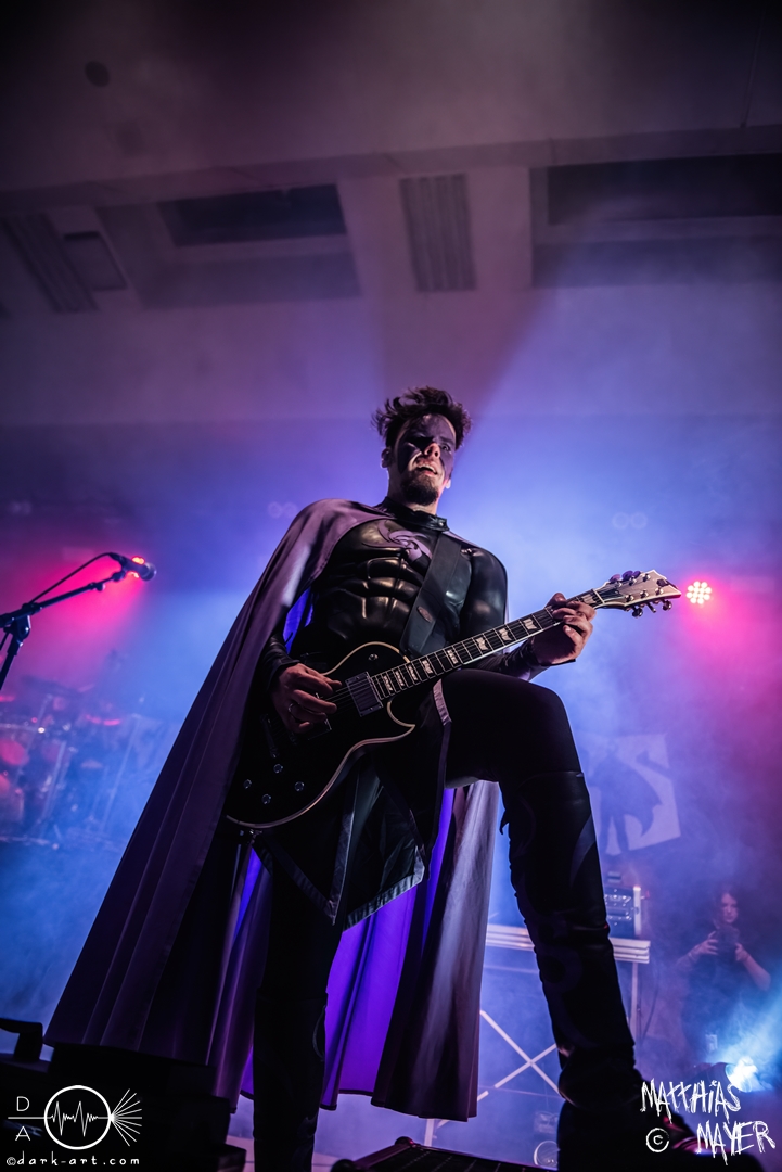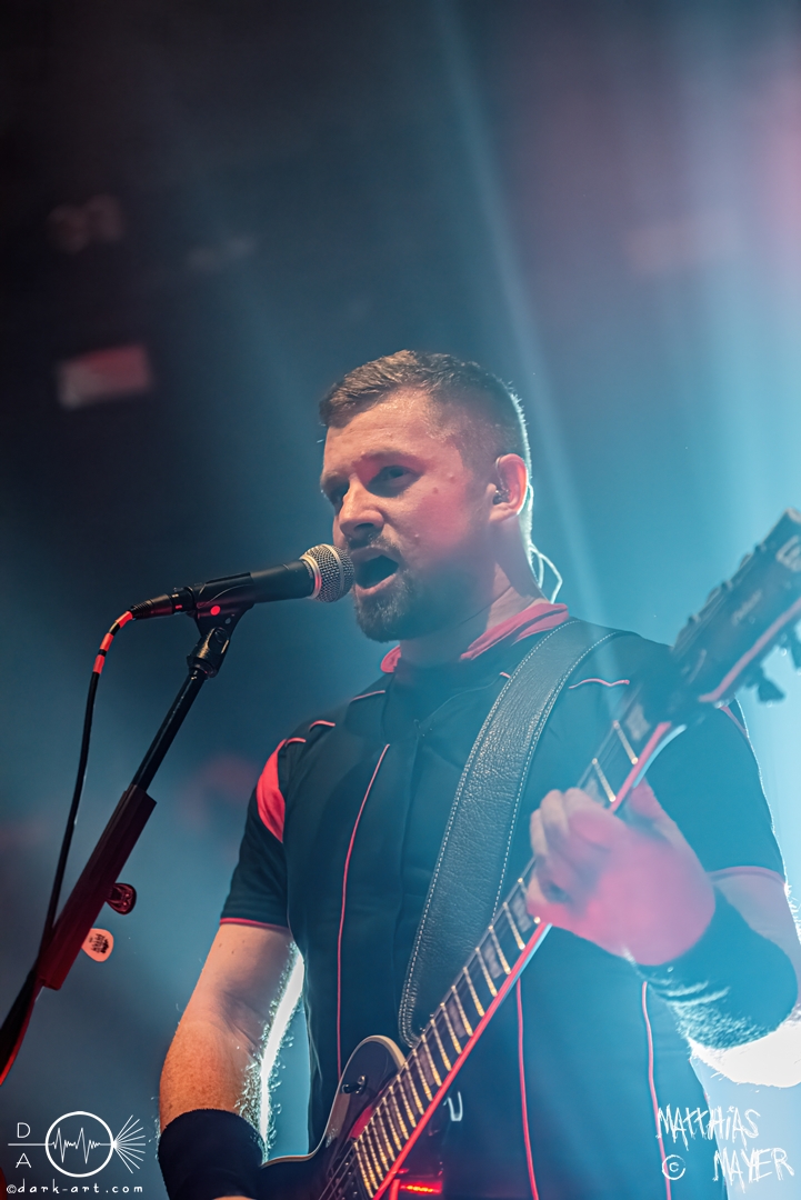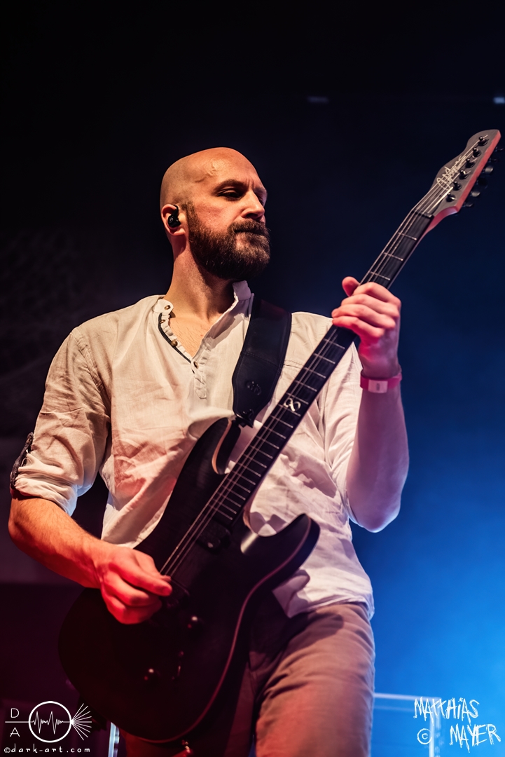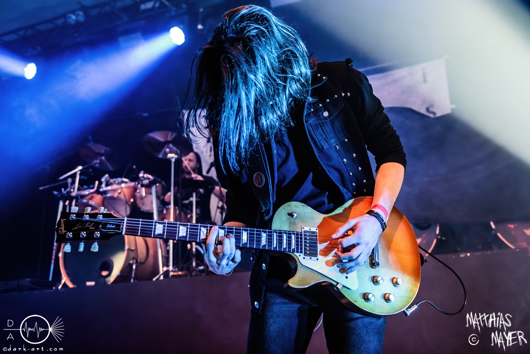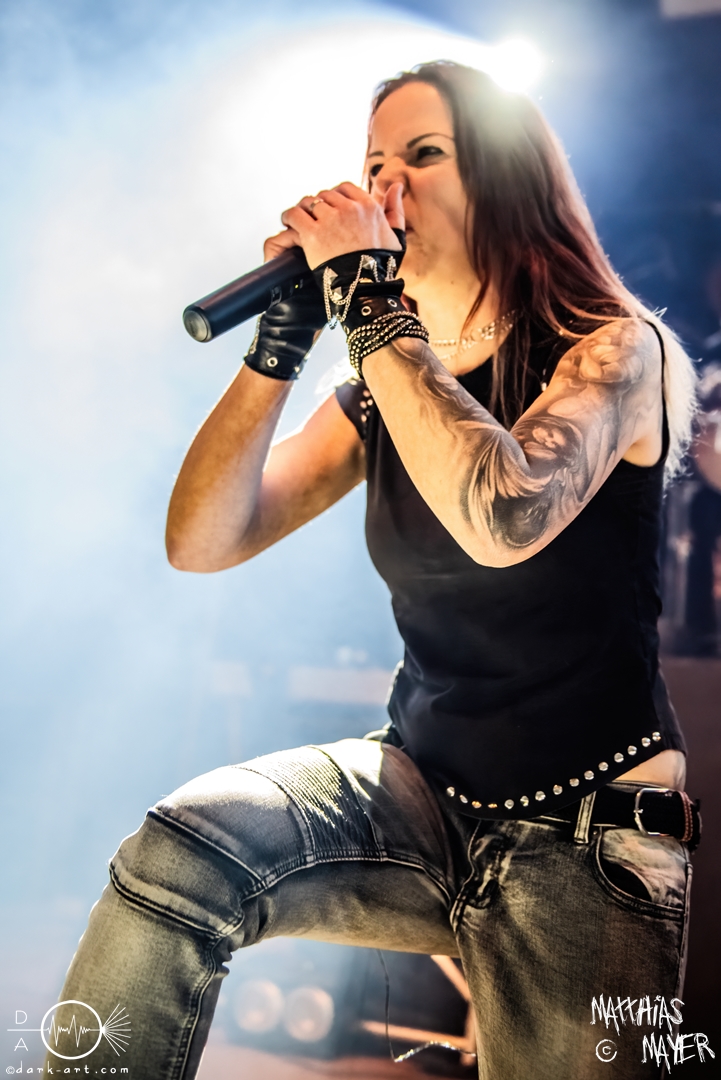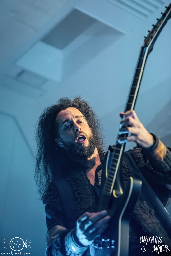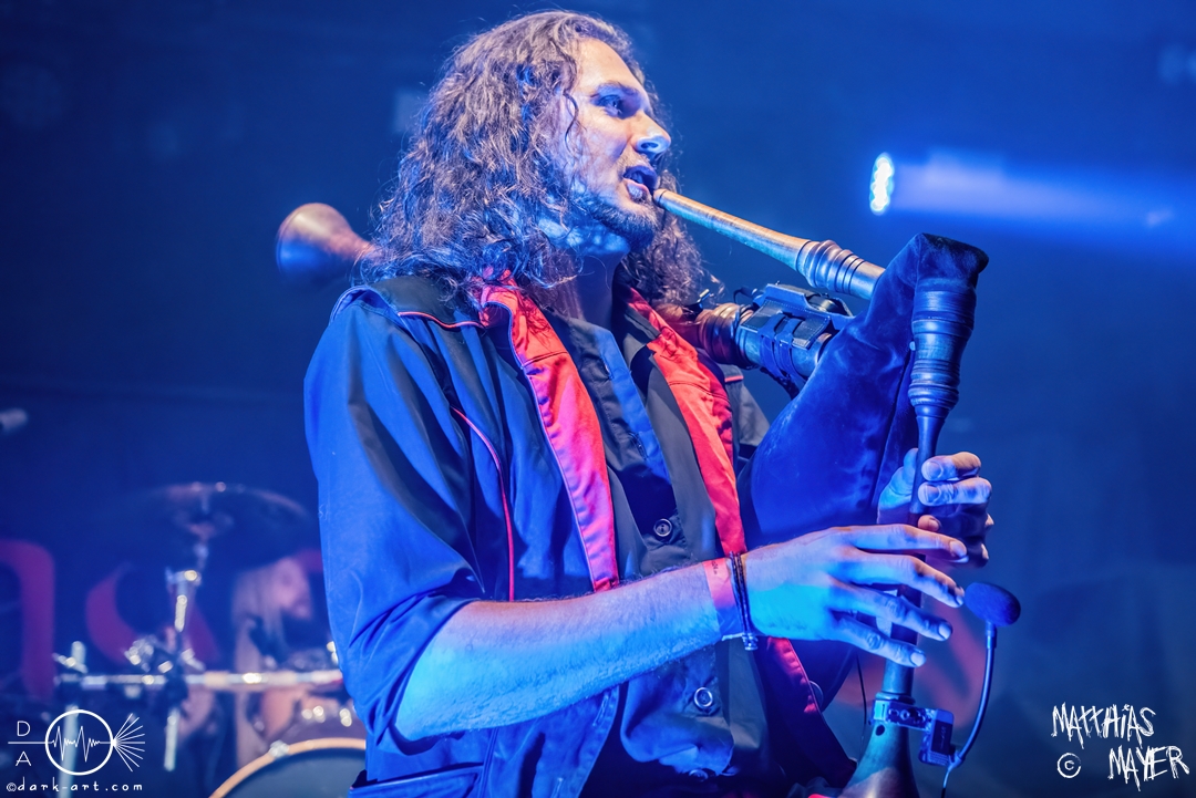 Während des Umbaus verwandelte sich die Bühne stückchenweise zu einem waschechten Piratenschiff und dies war auch notwendig, da die Crew der Visions of Atlantis auf dem No-SAX Segel setzte. Die Symphonic-Metal-Piraten hatten einen beeindruckenden Auftritt mit viel Schauspiel und viel Humor hingelegt, denn diese Band erzählt während des Auftrittes romantisierte Piratengeschichten. Doch erstmal alles auf Anfang. Die Musiker in eindrucksvollen Kleidungen, die allesamt vom Set des nächsten Teils der Pirates of the Caribbean Reihe stammen könnten, waren sehr eindrucksvoll und ausdrucksstark. Die Ventilatoren, die wir von Isn’t noch kannten, verstärkten den Eindruck von wehenden Haaren in der steifen Prise. Im Mittelpunkt der Show standen Clémentine Delauney und Michele Guaitoli, die beiden Sänger der Band. Ständig lagen sich die beiden Personen spielerisch im Streit und jagten sich über das „Schiff“. Dabei wechselten sie gekonnt ihre Gesangspassagen ab. Es war spannend ihnen dabei zuzusehen, wenn zum Beispiel Clémentine ihrem Mitsänger den Dreispitz entwendete und sich selbst aufsetzte. Zwischendurch gab es einen humoristischen Gag mit einem Holzstab, auf dem Michele versuchte wie auf einem Musikinstrument zu spielen. Dies misslang ihm natürlich, aber der Drummer Thomas Caser konnte einige liebliche Flötentöne dazu beisteuern. Für das Lied Freedom wurde die gesamte Halle verdunkelt, damit alle Zuschauer ihre Feuerzeuge oder Mobiltelefone zücken und aufleuchten lassen konnten, um eine besondere Stimmung zu erwirken. Der Auftritt blieb weiter atmosphärisch, wenn beispielsweise Nebel und blaues Licht auf der Bühne den Eindruck von Sonnenstrahlen unter der Wasseroberfläche erschufen. Bei den letzten drei Songs kam wieder etwas Schwung in die Halle. So sollten die Zuschauer bei Melancholy Angel in die Hocke gehen und danach wild umher springen und für Pirates Will Return ruderte ein Drittel der Besucher vor der Bühne in langen Reihen. Zum Abschluss mit Legion Of The Seas entrollten die Seefahrer noch ihren mächtigen Jolly Roger und ließen die Fahne an einem Stab beeindruckend durch die Luft gleiten. Nach dem letzten Lied zeigten sie uns noch eine neue Art überflüssige Setlisten unter das Volk zu bringen. Zusammengeknüllte Blätter wurden wie ein Baseball mit der Gitarre in die Halle geschlagen. Ein humorvolles Ende für die akustischen Raubzüge von Visions of Atlantis.