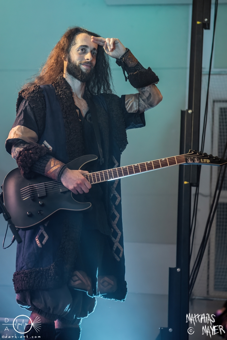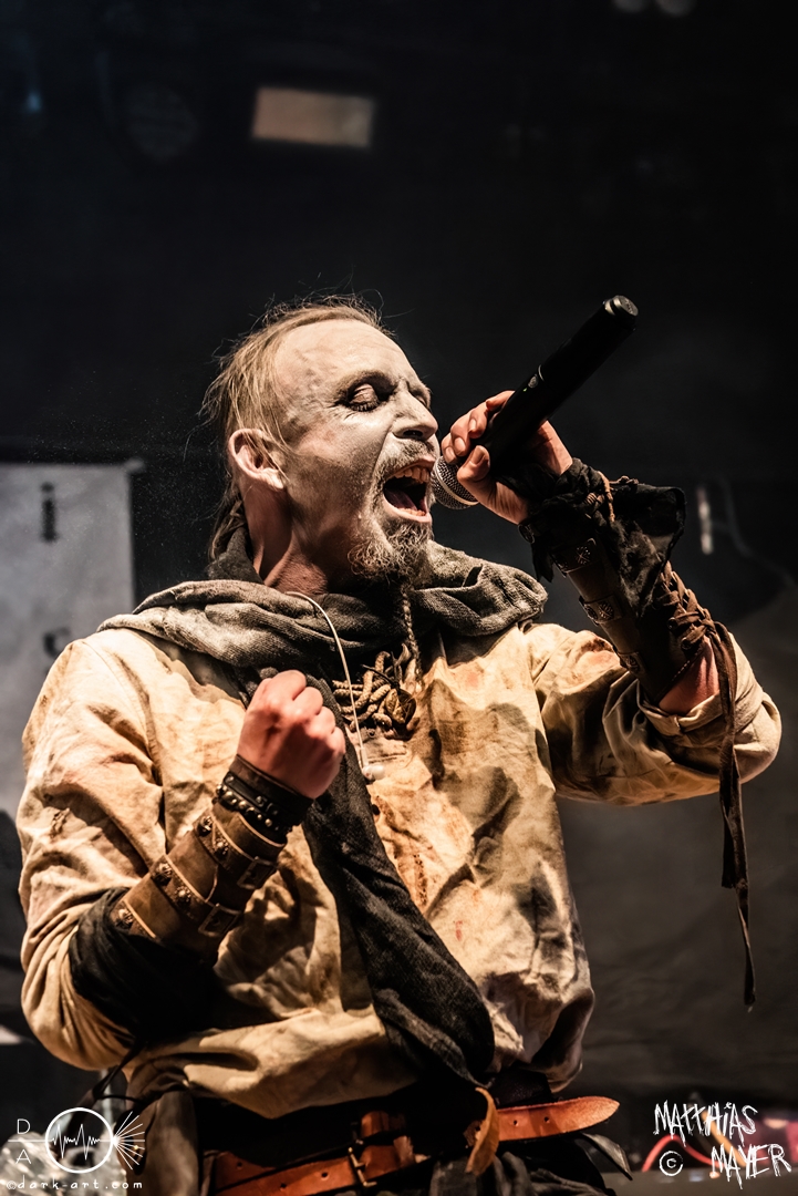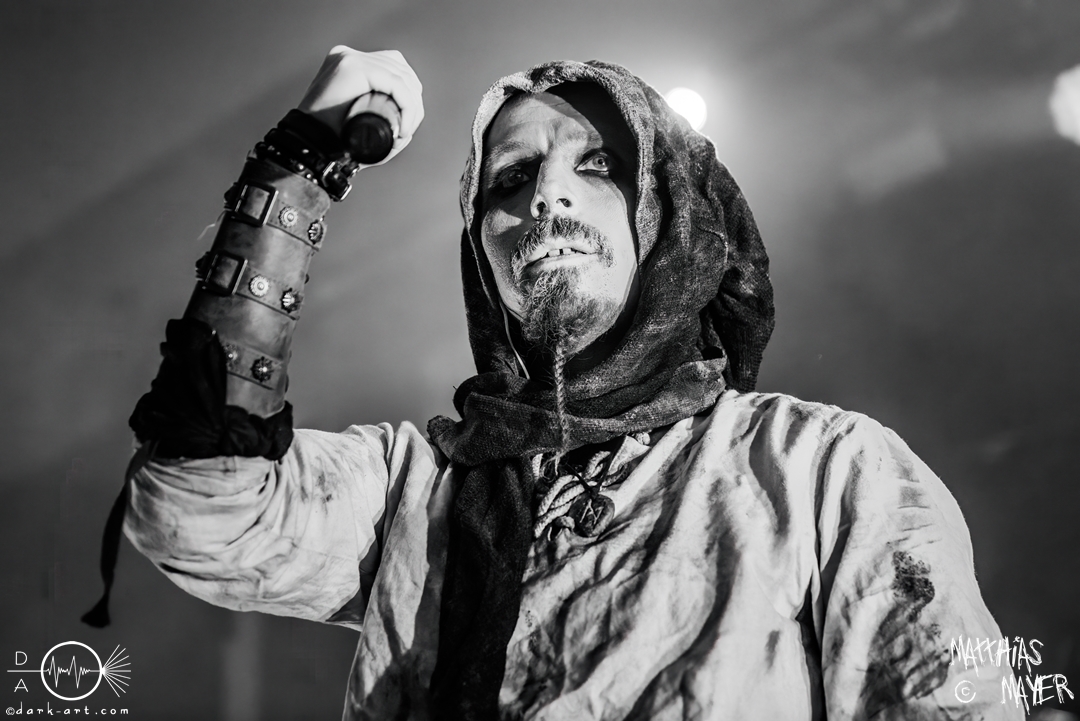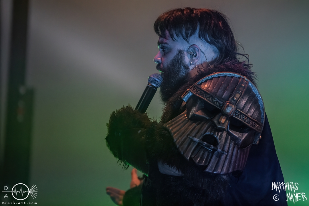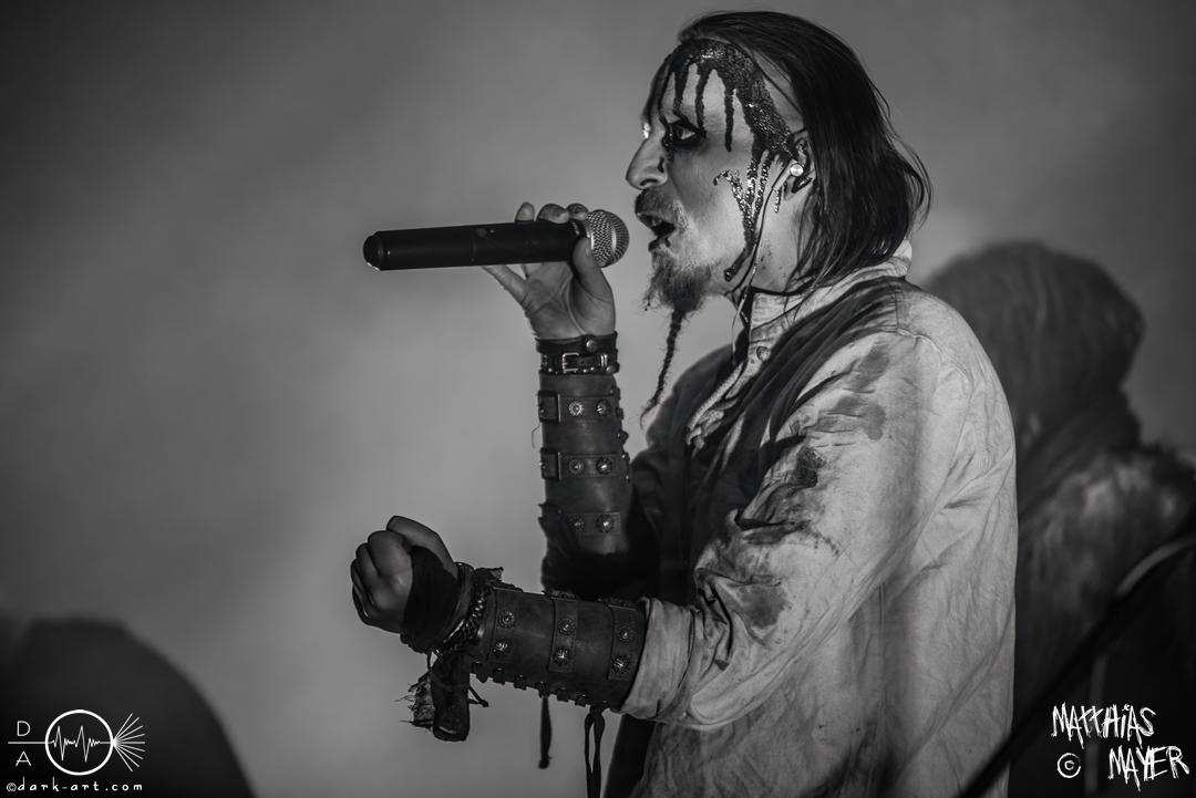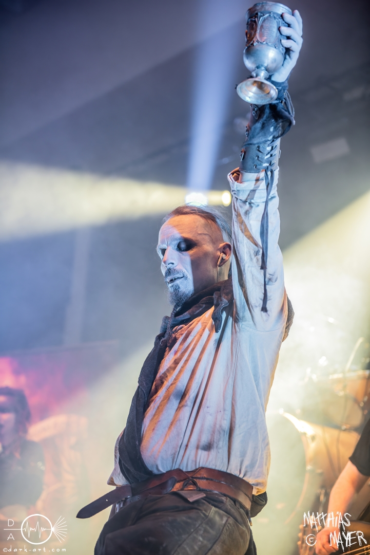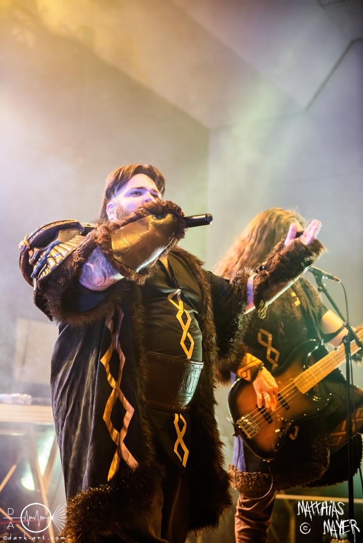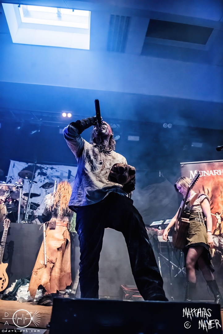 Nach diesem brachialen Auftritt ging es etwas atmosphärischer mit Munarheim weiter. Die Zuschauer haben auch ihre anfängliche Scheu schnell abgelegt und standen dicht gedrängt an der Absperrung und begrüßten die Musiker mit lauten Schreien, als diese die Bühne betraten. Die Bandmitglieder konnten von ihren Kostümen her in zwei Lager aufgeteilt werden, die Schlichten und die Extravaganten. Besonders Sänger Pascal Pfannenschmidt und Flötistin Sabine Götze stachen mit fahlem Make-up und Pelzumhang aus der gesamten Formation heraus. Pascal flitzte während der gesamten Show über die Bühne und interagierte mit den einzelnen Musikern auf sehr individuelle Weise und band sie in die Show um die einzelnen Lieder ein. In puncto Lieder: in der Setliste fanden sich auch drei Songs ihres kommenden Albums wider, Waldesherz, Sei du das Licht und Und der Wind Sang, wobei ersteres seine Livepremiere feierte. Der Höhepunkt der Show waren zwei beeindruckende Momente: Im Laufe des Auftrittes verschwand Sabine von der Bühne, nur um mit einem grünen Mantel zu erscheinen. Während des Songs Sei Du das Licht hockte der Sänger auf der Bühne und sie zauberte unter ihrem Mantel einen wie weiße Flügel wirkenden, Umhang hervor und rahmte den Sänger in seinem Spiel ein. Ein weiterer ausdrucksstarker Moment war zu dem letzten Lied Und der Wind sang, wo weitere Requisiten in Form eines Krugs und eines Bechers aus Wurzelholz auf die Bühne getragen wurden. Sabine befüllte den Becher von Pascal und der trank rituell daraus, während die restlichen Musiker einen akustischen Mantel um die Szenerie webten. Die Musik von Munarheim ist ein dichter, symphonischer Folk Metal mit Black-Metal-Einflüssen, welcher eine langatmige, intensive Klangwand erschuf und die Zuschauer in ihren Bann zog. Diese beeindruckende Musik und die ausdrucksstarke Bühnenshow hatten diesen Auftritt zu meinem geheimen Höhepunkt des Tages gemacht.
