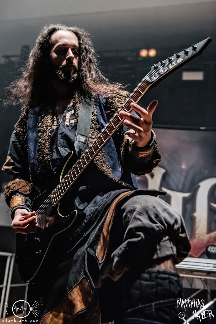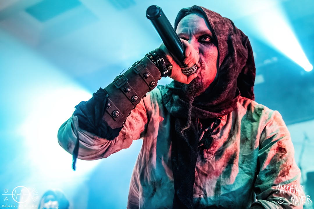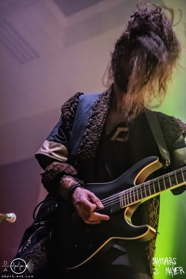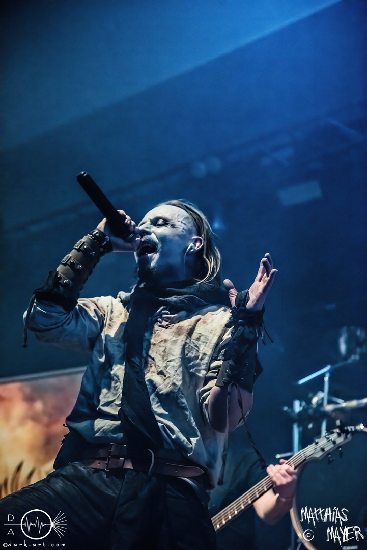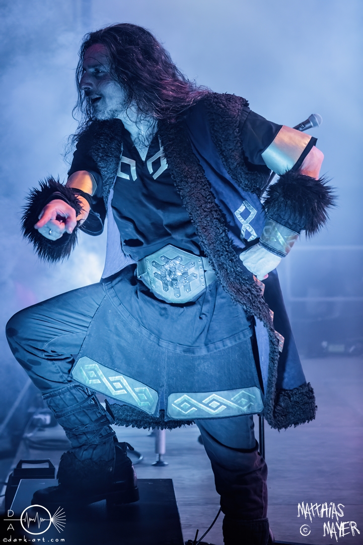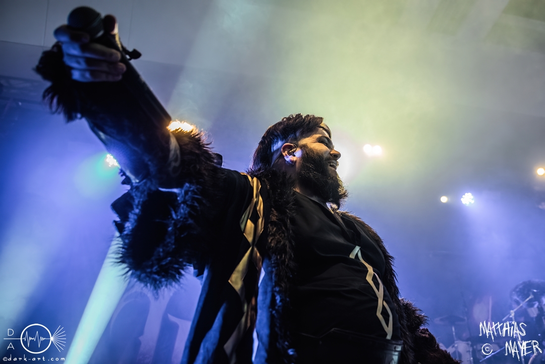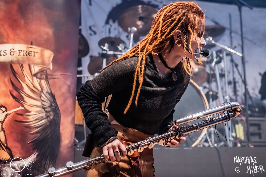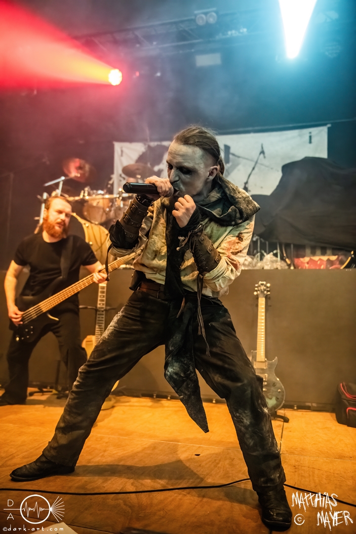 Nach diesem brachialen Auftritt ging es etwas atmosphärischer mit Munarheim weiter. Die Zuschauer haben auch ihre anfängliche Scheu schnell abgelegt und standen dicht gedrängt an der Absperrung und begrüßten die Musiker mit lauten Schreien, als diese die Bühne betraten. Die Bandmitglieder konnten von ihren Kostümen her in zwei Lager aufgeteilt werden, die Schlichten und die Extravaganten. Besonders Sänger Pascal Pfannenschmidt und Flötistin Sabine Götze stachen mit fahlem Make-up und Pelzumhang aus der gesamten Formation heraus. Pascal flitzte während der gesamten Show über die Bühne und interagierte mit den einzelnen Musikern auf sehr individuelle Weise und band sie in die Show um die einzelnen Lieder ein. In puncto Lieder: in der Setliste fanden sich auch drei Songs ihres kommenden Albums wider, Waldesherz, Sei du das Licht und Und der Wind Sang, wobei ersteres seine Livepremiere feierte. Der Höhepunkt der Show waren zwei beeindruckende Momente: Im Laufe des Auftrittes verschwand Sabine von der Bühne, nur um mit einem grünen Mantel zu erscheinen. Während des Songs Sei Du das Licht hockte der Sänger auf der Bühne und sie zauberte unter ihrem Mantel einen wie weiße Flügel wirkenden, Umhang hervor und rahmte den Sänger in seinem Spiel ein. Ein weiterer ausdrucksstarker Moment war zu dem letzten Lied Und der Wind sang, wo weitere Requisiten in Form eines Krugs und eines Bechers aus Wurzelholz auf die Bühne getragen wurden. Sabine befüllte den Becher von Pascal und der trank rituell daraus, während die restlichen Musiker einen akustischen Mantel um die Szenerie webten. Die Musik von Munarheim ist ein dichter, symphonischer Folk Metal mit Black-Metal-Einflüssen, welcher eine langatmige, intensive Klangwand erschuf und die Zuschauer in ihren Bann zog. Diese beeindruckende Musik und die ausdrucksstarke Bühnenshow hatten diesen Auftritt zu meinem geheimen Höhepunkt des Tages gemacht.