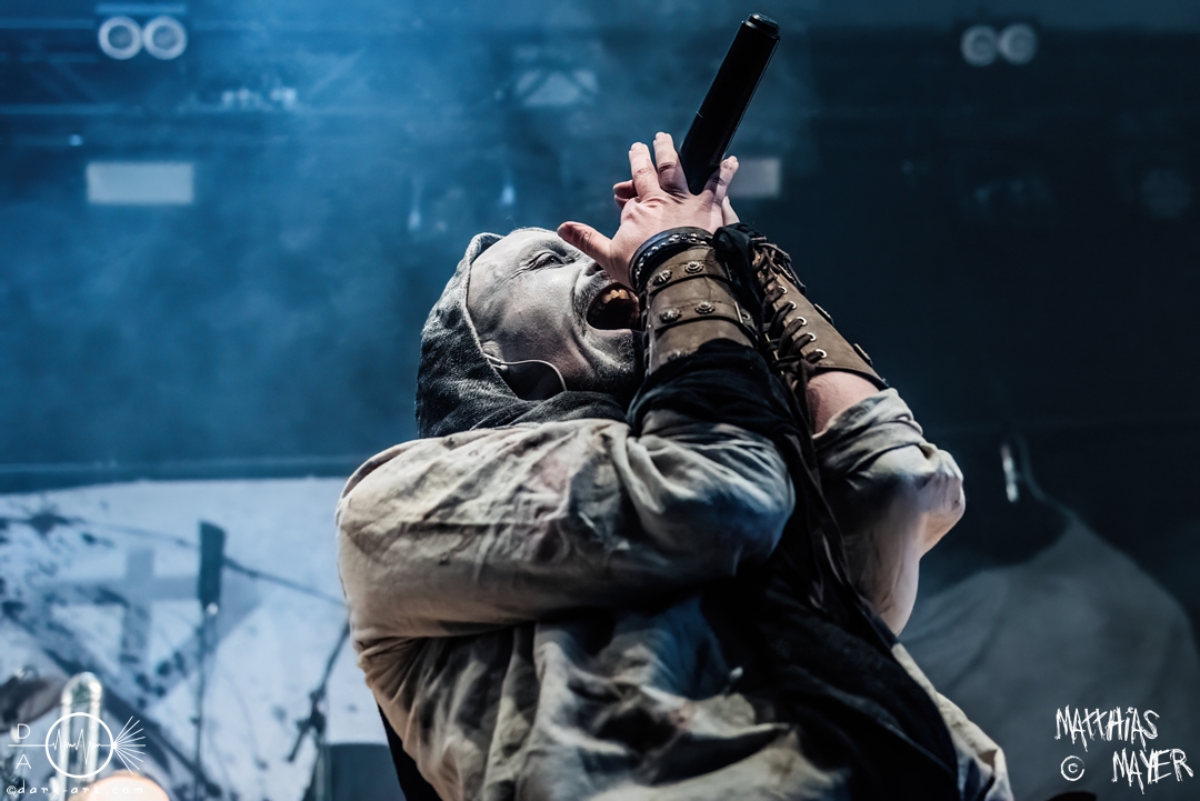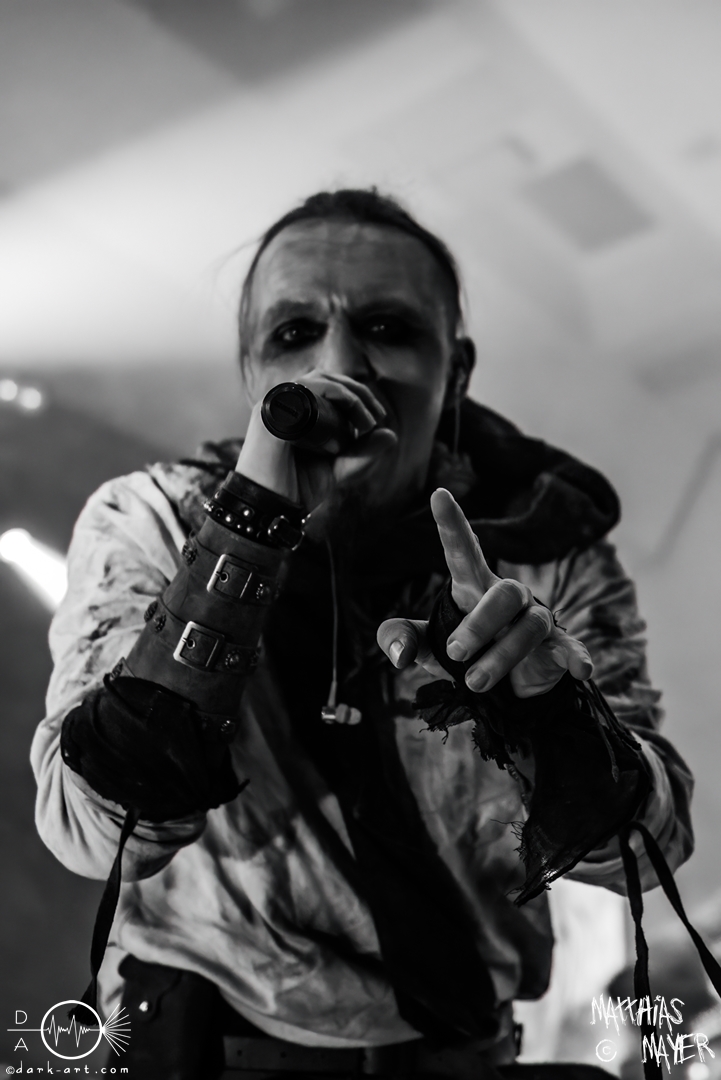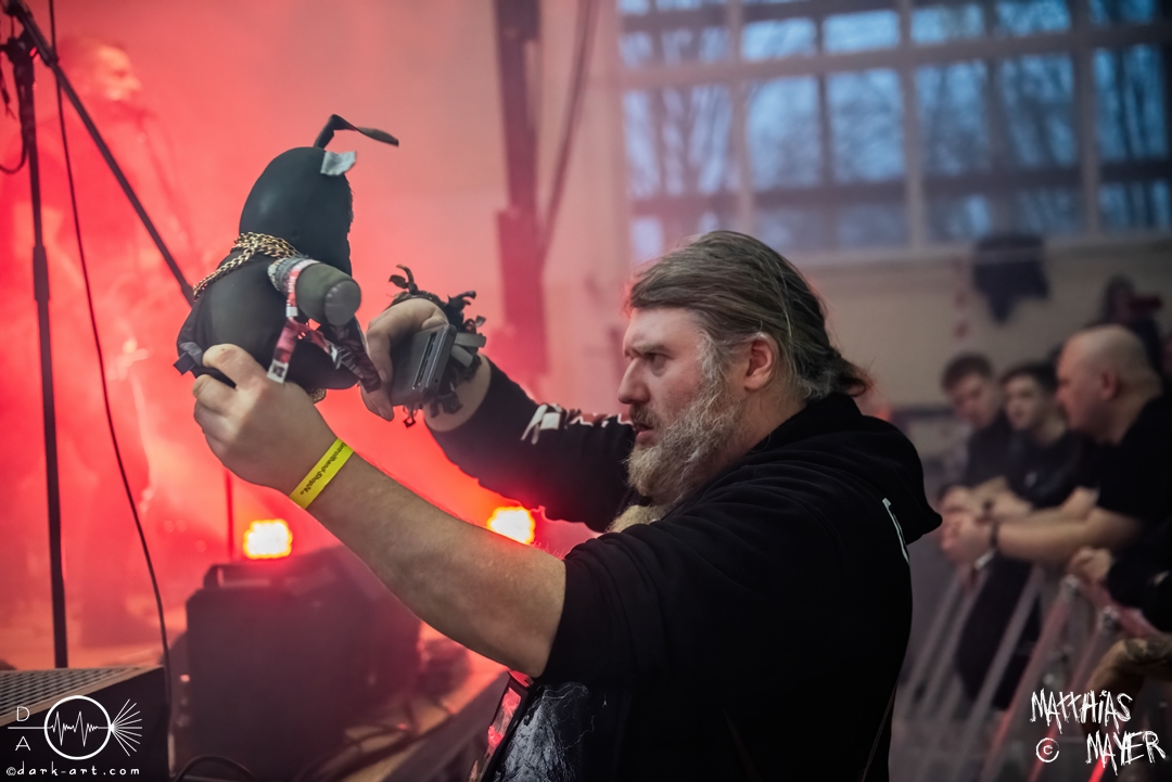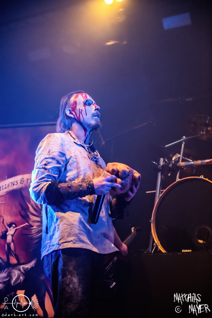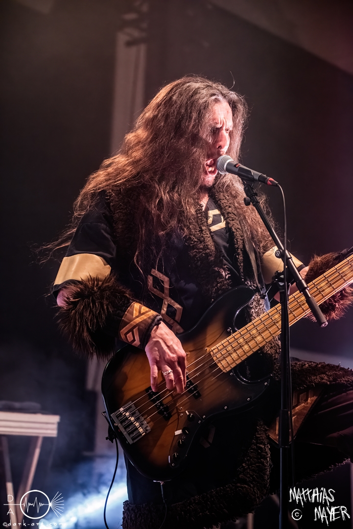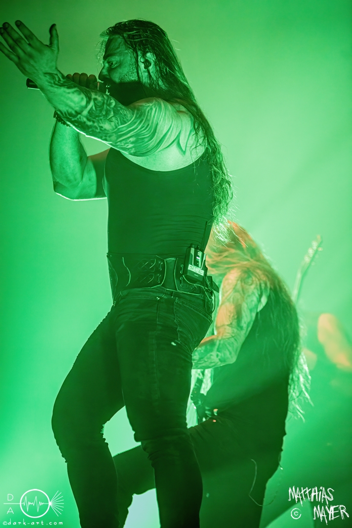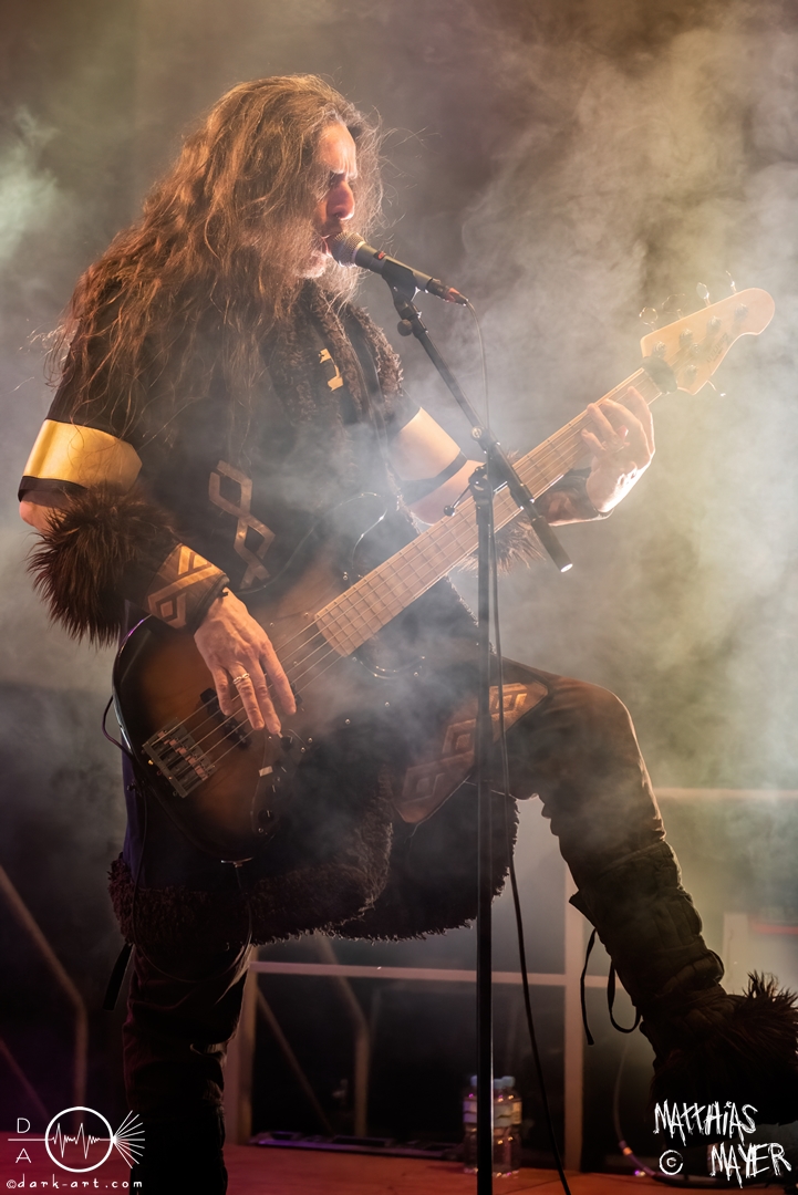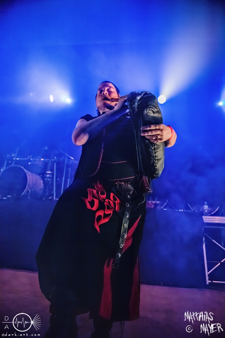 Nach diesem brachialen Auftritt ging es etwas atmosphärischer mit Munarheim weiter. Die Zuschauer haben auch ihre anfängliche Scheu schnell abgelegt und standen dicht gedrängt an der Absperrung und begrüßten die Musiker mit lauten Schreien, als diese die Bühne betraten. Die Bandmitglieder konnten von ihren Kostümen her in zwei Lager aufgeteilt werden, die Schlichten und die Extravaganten. Besonders Sänger Pascal Pfannenschmidt und Flötistin Sabine Götze stachen mit fahlem Make-up und Pelzumhang aus der gesamten Formation heraus. Pascal flitzte während der gesamten Show über die Bühne und interagierte mit den einzelnen Musikern auf sehr individuelle Weise und band sie in die Show um die einzelnen Lieder ein. In puncto Lieder: in der Setliste fanden sich auch drei Songs ihres kommenden Albums wider, Waldesherz, Sei du das Licht und Und der Wind Sang, wobei ersteres seine Livepremiere feierte. Der Höhepunkt der Show waren zwei beeindruckende Momente: Im Laufe des Auftrittes verschwand Sabine von der Bühne, nur um mit einem grünen Mantel zu erscheinen. Während des Songs Sei Du das Licht hockte der Sänger auf der Bühne und sie zauberte unter ihrem Mantel einen wie weiße Flügel wirkenden, Umhang hervor und rahmte den Sänger in seinem Spiel ein. Ein weiterer ausdrucksstarker Moment war zu dem letzten Lied Und der Wind sang, wo weitere Requisiten in Form eines Krugs und eines Bechers aus Wurzelholz auf die Bühne getragen wurden. Sabine befüllte den Becher von Pascal und der trank rituell daraus, während die restlichen Musiker einen akustischen Mantel um die Szenerie webten. Die Musik von Munarheim ist ein dichter, symphonischer Folk Metal mit Black-Metal-Einflüssen, welcher eine langatmige, intensive Klangwand erschuf und die Zuschauer in ihren Bann zog. Diese beeindruckende Musik und die ausdrucksstarke Bühnenshow hatten diesen Auftritt zu meinem geheimen Höhepunkt des Tages gemacht.