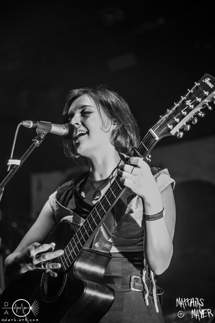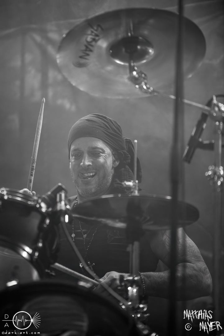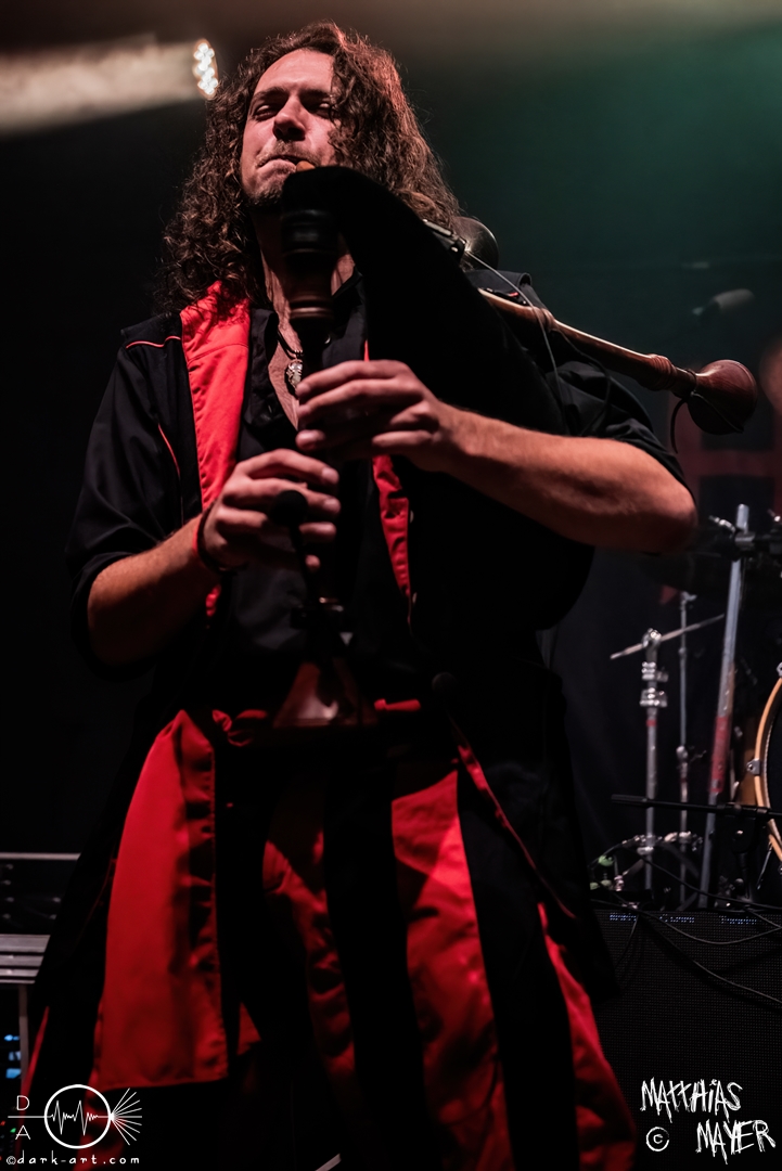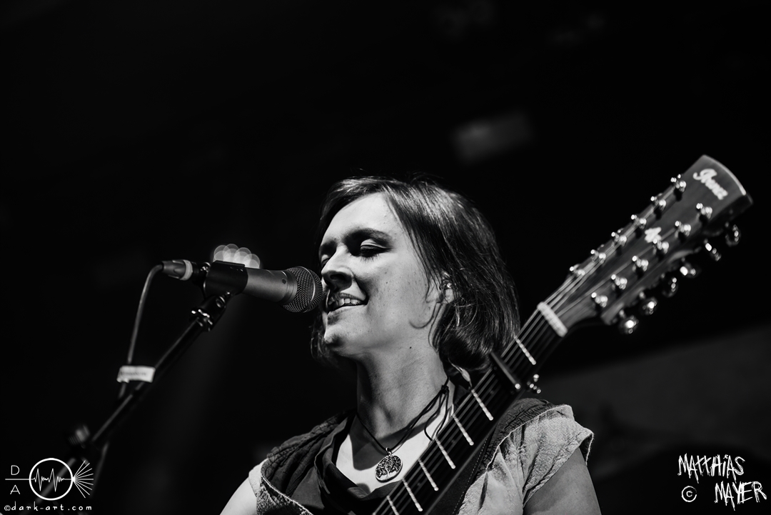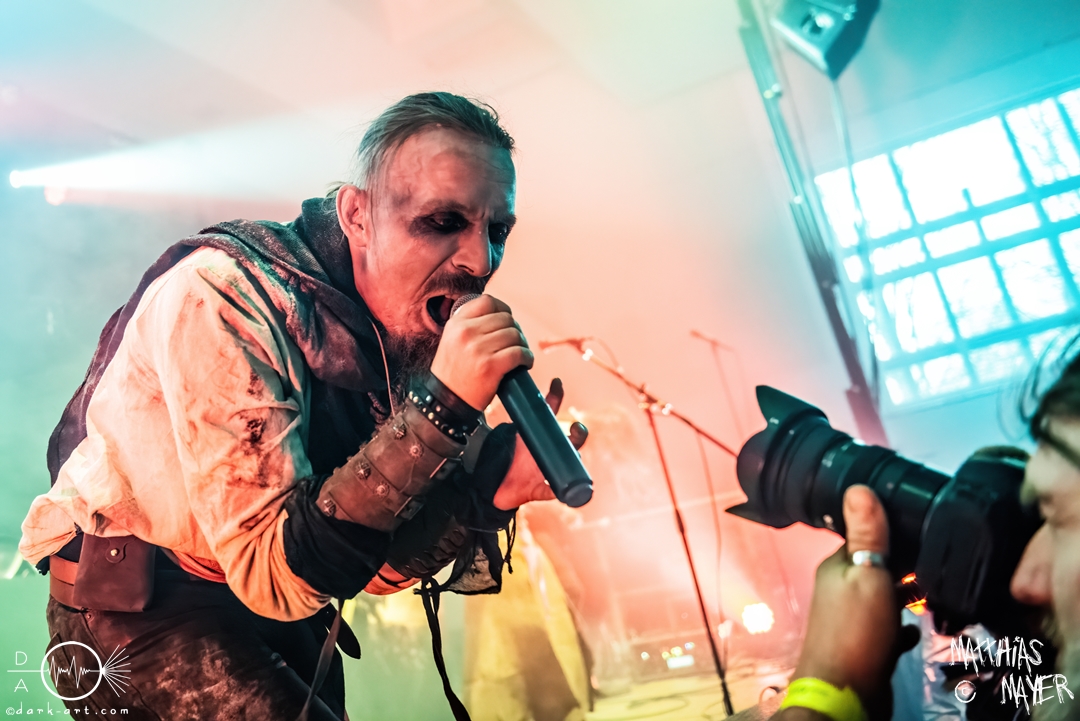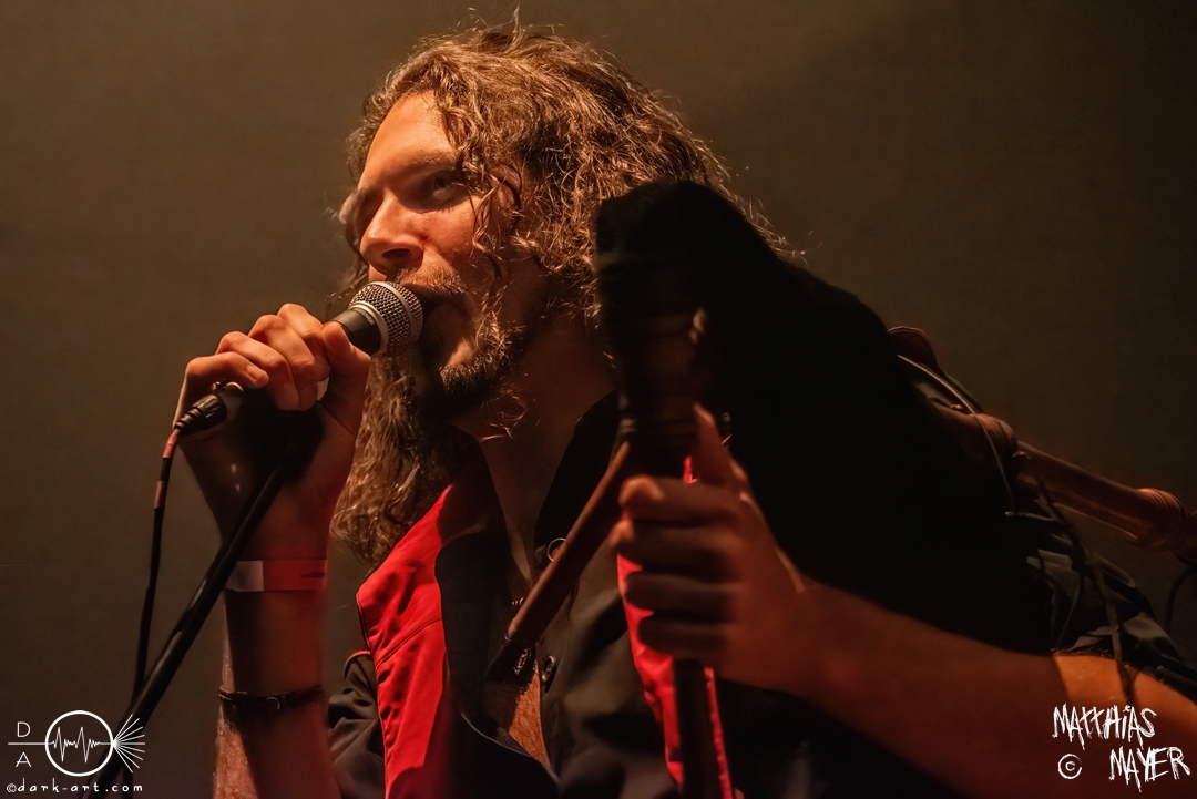 Die Band Haggefugg begrüßte die Besucher mit dem Satz „Wir sind Haggefugg und ihr seid Haggevoll!“ und leitete damit einen fröhlichen Auftritt ein. Die gesamte Truppe versprühte vom ersten Moment an eine echte Freude und Begeisterung auf der Bühne. So haben sie viel gegrinst und noch mehr miteinander gelacht. Mit ihrem Mittelalter-Rock hatten sie die perfekte Musik für gute Laune mitgebracht. Hervorheben möchte ich die besondere Performance von Frontmann Gregor Krähenkehle. Wie ein wildgewordener Derwisch lief der Mann über die Bühne und konnte nie an einem Ort verweilen. Er sprang, rannte und schlitterte über die Bühne und selbst das Mikro in seiner Hand kam nie zur Ruhe. Immer wieder warf er das Instrument kurz hoch und fing es mit der anderen Hand auf. Von links nach rechts und zurück flog das Mikro durch die Luft. Für die Fans der Band und welche, die es werden wollen, gab es zwei gute Nachrichten: erstens solle im kommenden Jahr, genauer dem März, ein neues Album veröffentlicht werden und deshalb spielten sie einige neue Songs. Eines dieser Lieder war Märchenwald, ihre erste Single-Auskopplung des kommenden Werks. Auch hatten Haggefugg die Preise für ihre Shirts um 5 Euro verringert, was mit Jubel beantwortet wurde. Das dadurch eingenommene Geld soll dann gut angelegt werden und ihre Beraterin dafür sei die Schankmaid. Gute Überleitung zum gleichnamigen Track. Kurz vor dem großen Finale mit Met! Wirt! Bestellt! und Totentanz drosselte die Band das Tempo mit dem neuen Song Böses Spiel. Mit einer Akustikgitarre bewaffnet und einem Lied über die Schatten des Lebens fuhr der Auftritt sich herunter, nur um dann schlagartig mit den letzten beiden Stücken den Auftritt wieder zu einer Party zu machen.