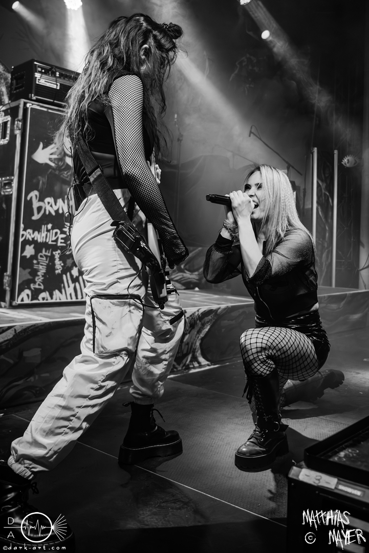 Los ging es dann pünktlich 19:30 Uhr mit Brunhilde als erster Vorband. Durch ihre Mischung aus Punkrock und Frauenpower zeigten sie in auffälligen Outfits ordentlich Bühnenpräsenz. Provokant wurde das Publikum gefragt, ob alle ihren Mittelfinger dabei hätten, der auch sogleich zum zweiten Lied ausgestreckt wurde. Mit immer wieder erotisch angehauchten Tanzeinlagen präsentierten die beiden Ladys, Sängerin Caro und Bassistin Marisa, energiegeladenen Punkrock und Metal-Elemente.