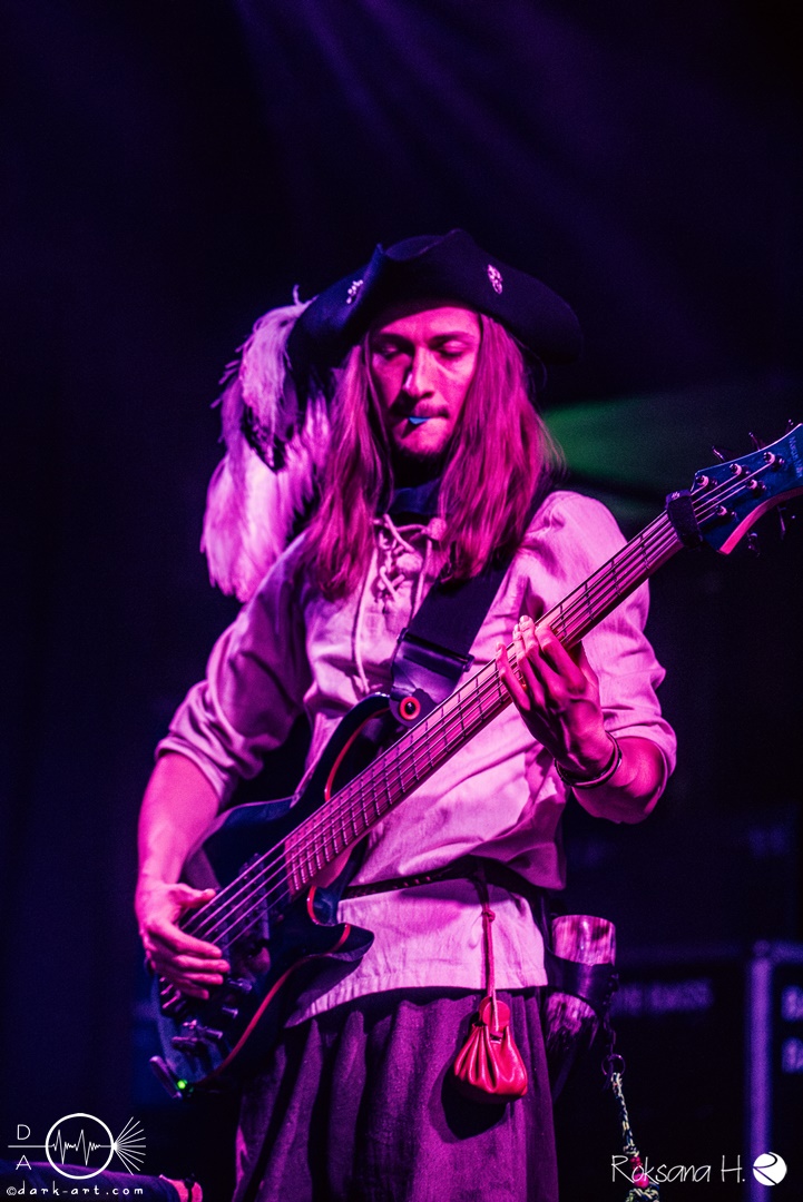 Weiter ging es mit Cumulo Nimbus, die aufgrund technischer Probleme mit kleiner Verzögerung begannen. Die Band kommt musikalisch sehr vielseitig daher und überzeugt mit ihrem, selbst genannt, Renaissance Rock, mit Einflüssen aus dem Mittelalter Rock und einem starken Fokus auf den Folkinstrumenten, und teilweise bis zu vierstimmigem Gesang. Gepaart mit einem Auftreten mit einem Steampunk-Einschlag und der Forderung nach viel Interaktion können sie so das Publikum von Beginn an animieren. Nach über 10 Jahren Pause sind so die meisten Songs recht alt, aber mit Wort gegen Klinge gab es auch einen neuen Song, eine Ansage gegen Gewalt. Die Band war froh, überhaupt auftreten zu können, denn bis kurz vor dem Auftritt war ihre Sängerin durch eine Erkältung nicht in der Lage zu singen, was die Band zur humorvollen Bezeichnung als Cumulo Virus veranlasste. Zwischenzeitlich gab es auch Glückwünsche an den Lichttechniker sowie alle anwesenden Geburtskinder, dazu später mehr. Für All In und Blutrote wurde auch die Akustikgitarre ausgepackt, was den Songs eine folkigere Note gab. Zu letzterem schwang Sängerin Binia eine rote Flagge, und zur abschließenden Nummer Wirtshaus verteilte sie Met an die Fans vor der Bühne.