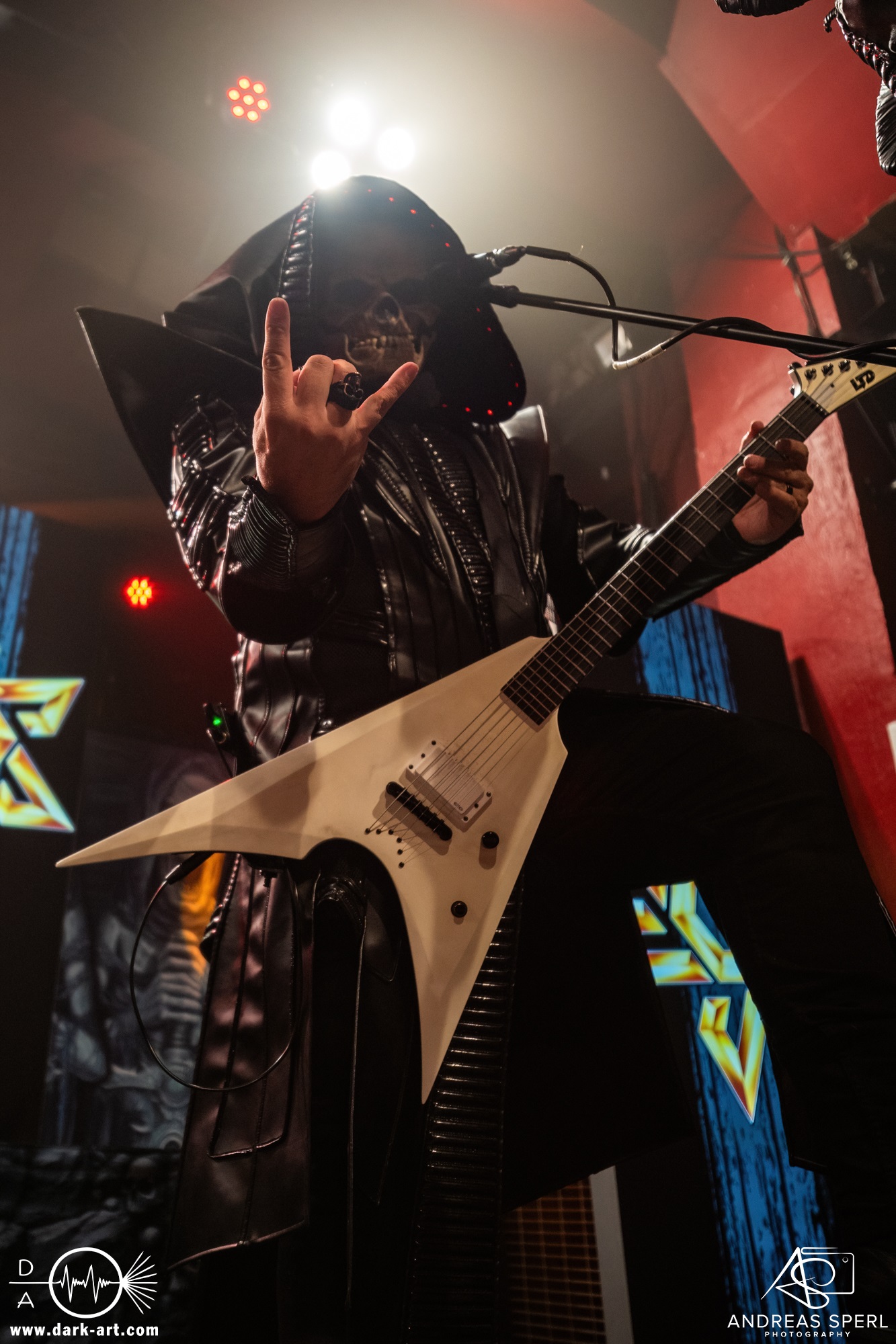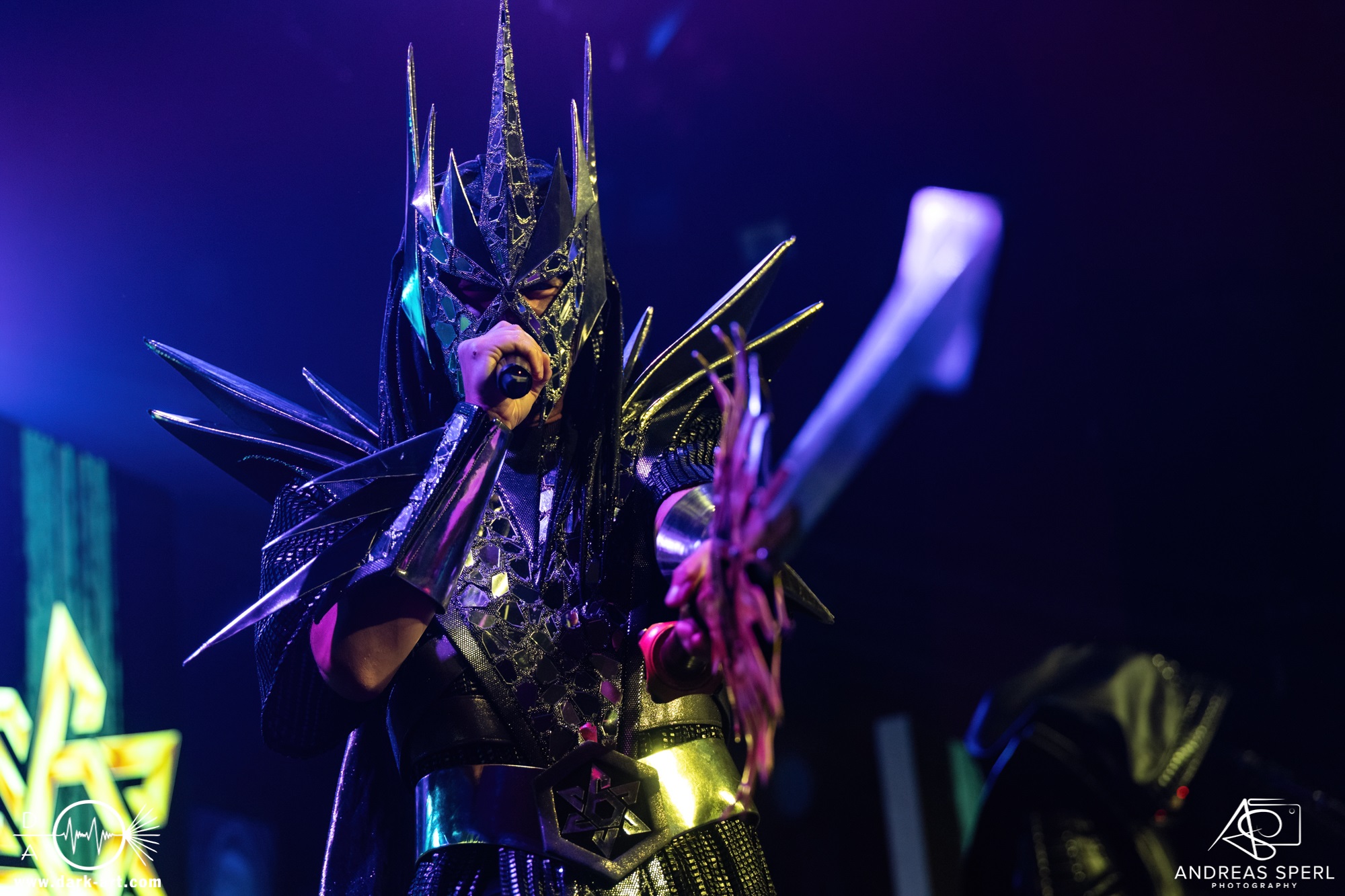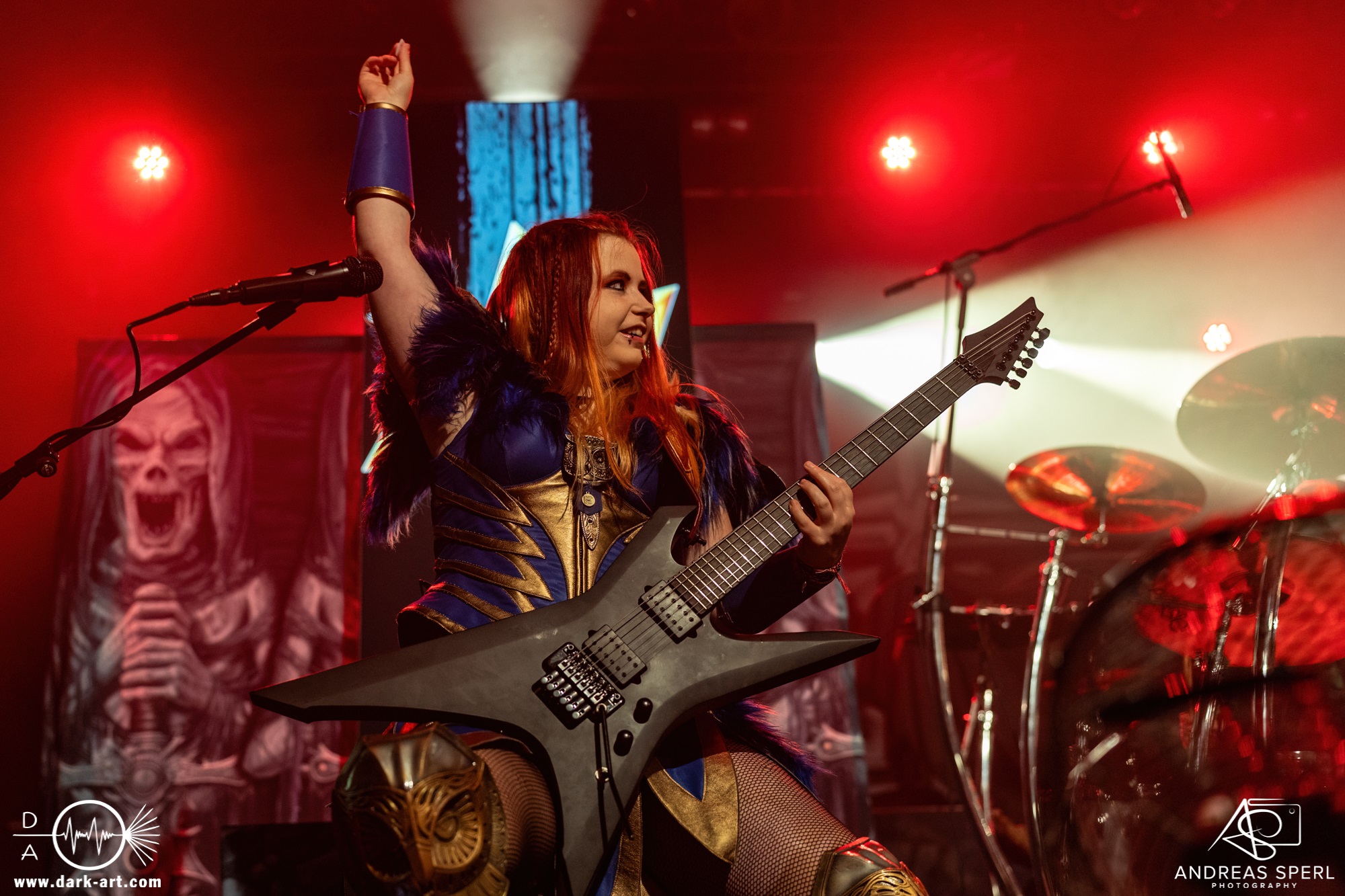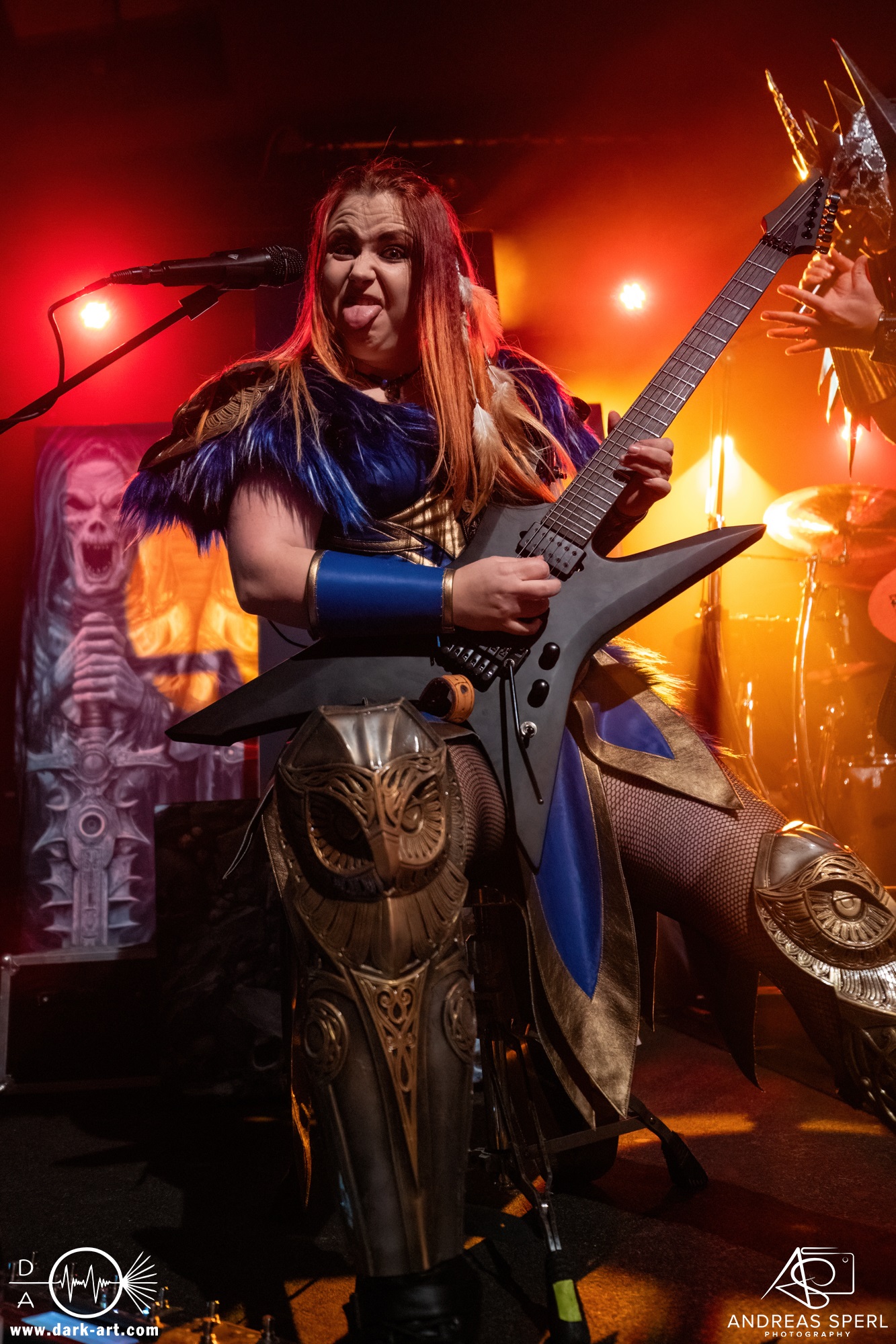 Dass es hier eigentlich nur um mit Metal garnierte gute Laune geht, zeigt sich auch an den Spielereien zwischen den Bandmitgliedern, so versucht der „Arch Demon Seebulon, The Origin of all Evil“ am Bass immer wieder die Zwergengitarristin an Soli zu hindern oder verbietet dem Publikum ihr Spiel gut zu finden. Sie hat es auch so nicht leicht, muss sie ihr Set doch aufgrund einer Fußverletzung im Sitzen absolvieren, was ihr das Publikum umso mehr mit Anerkennung zollt. Beim Laser-Shooting Dinosaur kommt sogar eines von diesen unglaublich lustigen Plastikganzkörperkostümen in T-Rex-Manier zum Einsatz und unterfüttert so die „Glaubwürdigkeit“ des Songs und wird nach dem Song von der Zwergin mit einem lasziven Klaps auf sein schuppiges Hinterteil wieder von der Bühne getrieben. Als nächsten Track gibt es die brandneue Single The Fire of Yore. Danach werden wir vom Reaper-Bassisten persönlich über seine Geschichte informiert, dass er nur wieder in die Hölle zurückwill und deswegen so miesepetrig ist. Währenddessen fällt ihm auf, dass er ja in Berlin ist und uns das Ganze auch auf Deutsch erzählen kann und fragt uns dann, wie denn die Tür zur Hölle aufgehe. Was uns im nächsten und abschließenden Song Ride to Hell erklärt wird.