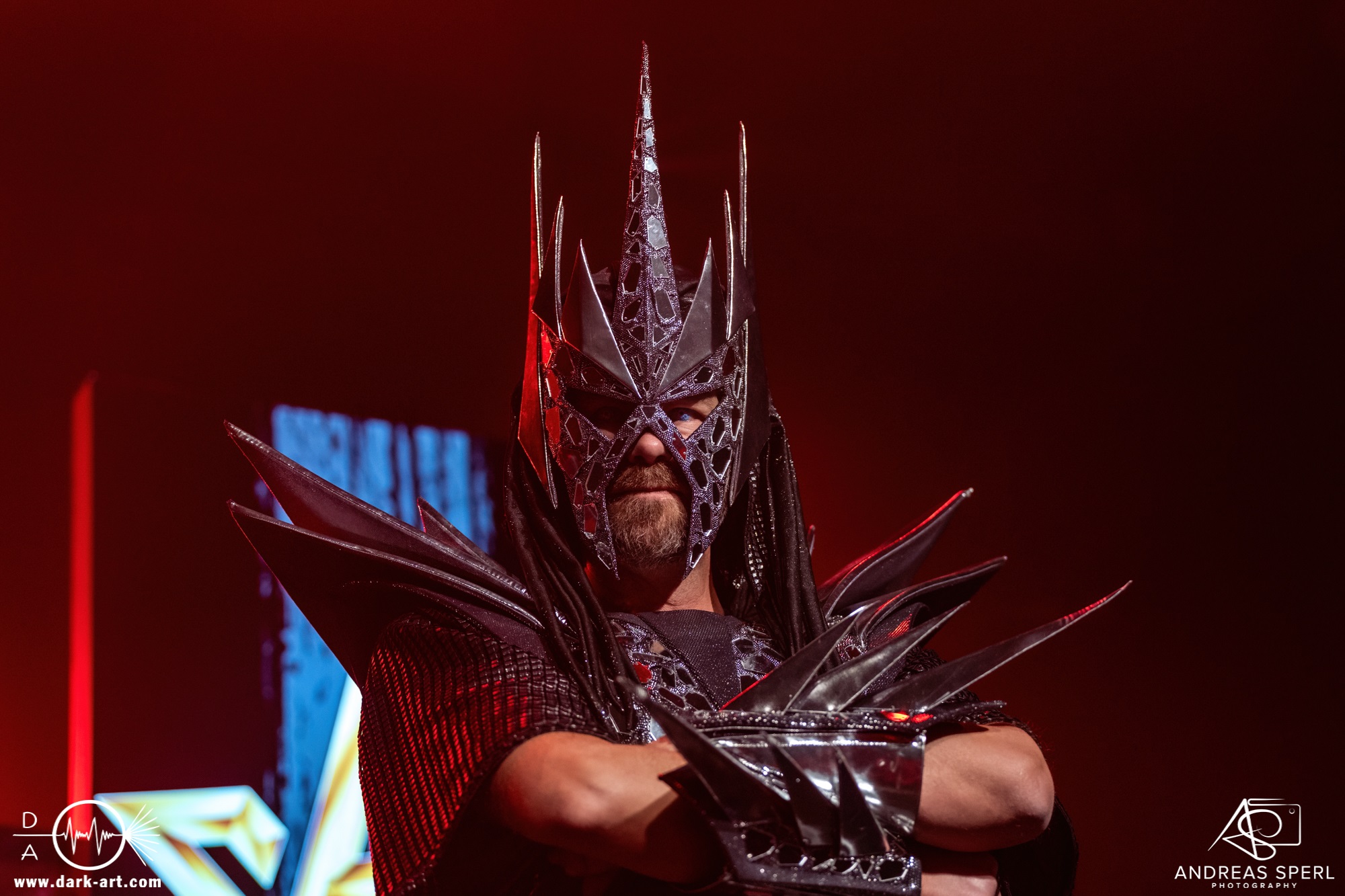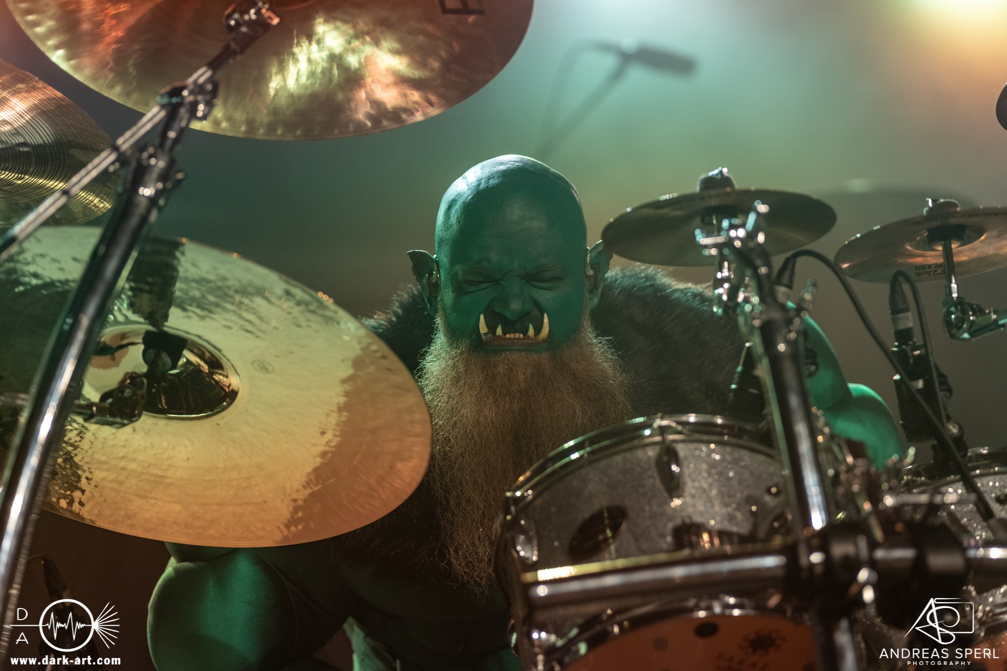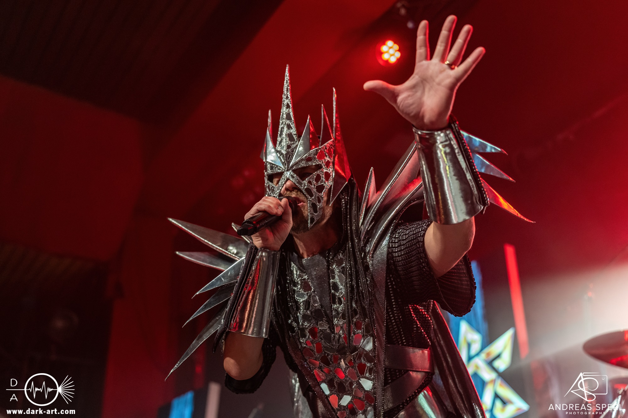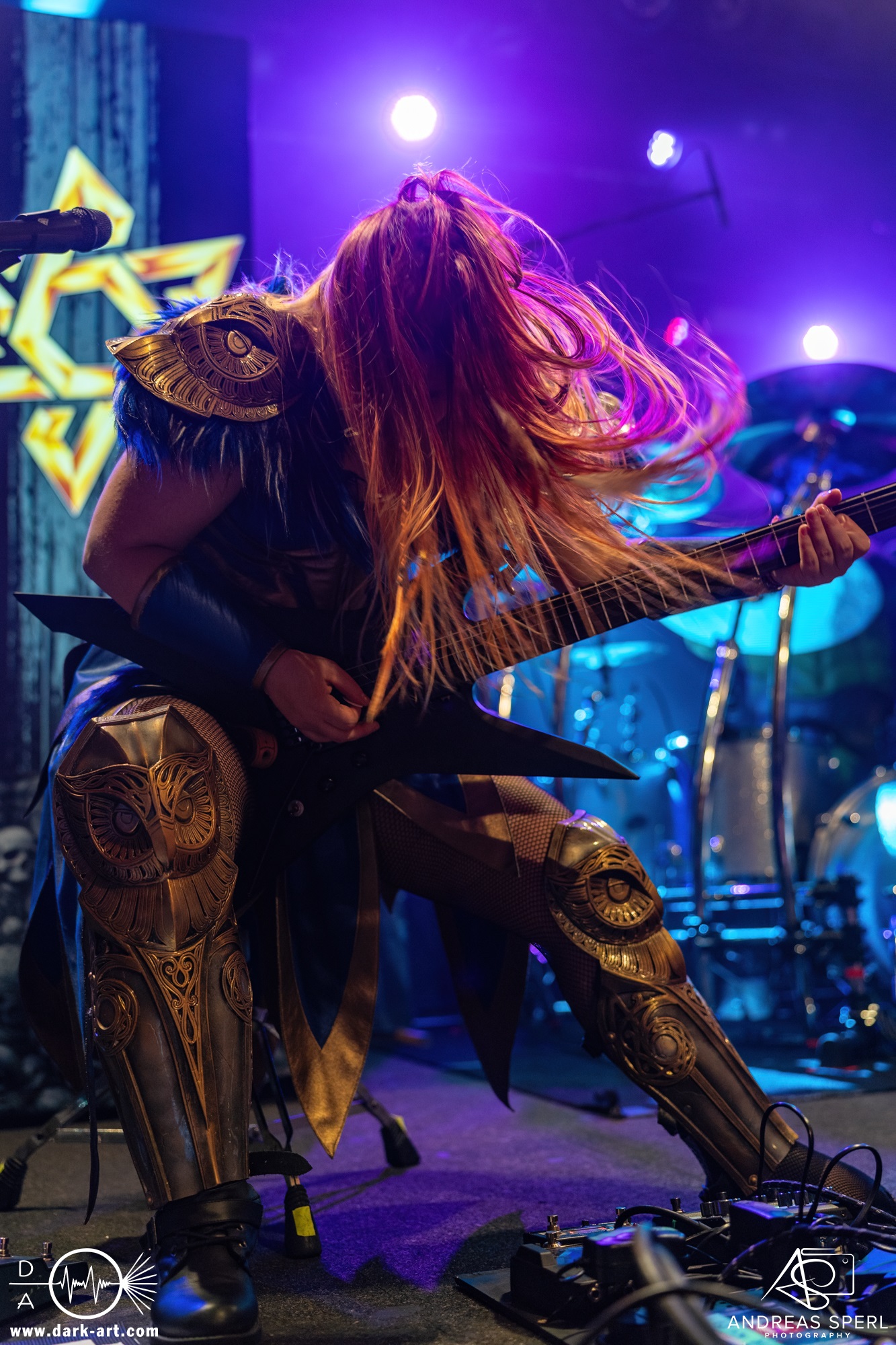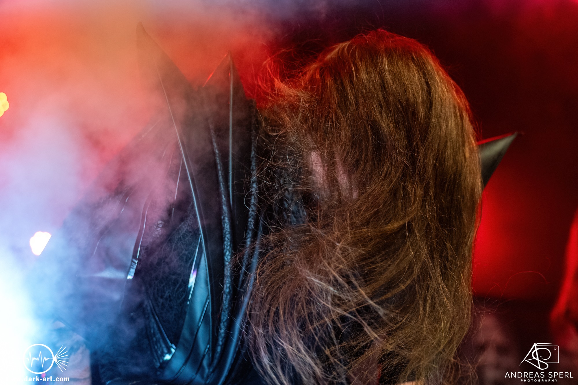 Dass es hier eigentlich nur um mit Metal garnierte gute Laune geht, zeigt sich auch an den Spielereien zwischen den Bandmitgliedern, so versucht der „Arch Demon Seebulon, The Origin of all Evil“ am Bass immer wieder die Zwergengitarristin an Soli zu hindern oder verbietet dem Publikum ihr Spiel gut zu finden. Sie hat es auch so nicht leicht, muss sie ihr Set doch aufgrund einer Fußverletzung im Sitzen absolvieren, was ihr das Publikum umso mehr mit Anerkennung zollt. Beim Laser-Shooting Dinosaur kommt sogar eines von diesen unglaublich lustigen Plastikganzkörperkostümen in T-Rex-Manier zum Einsatz und unterfüttert so die „Glaubwürdigkeit“ des Songs und wird nach dem Song von der Zwergin mit einem lasziven Klaps auf sein schuppiges Hinterteil wieder von der Bühne getrieben. Als nächsten Track gibt es die brandneue Single The Fire of Yore. Danach werden wir vom Reaper-Bassisten persönlich über seine Geschichte informiert, dass er nur wieder in die Hölle zurückwill und deswegen so miesepetrig ist. Währenddessen fällt ihm auf, dass er ja in Berlin ist und uns das Ganze auch auf Deutsch erzählen kann und fragt uns dann, wie denn die Tür zur Hölle aufgehe. Was uns im nächsten und abschließenden Song Ride to Hell erklärt wird.