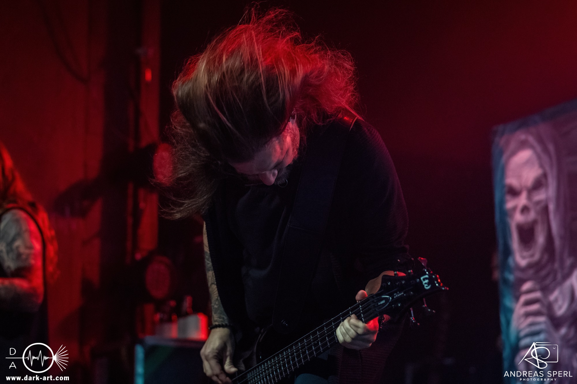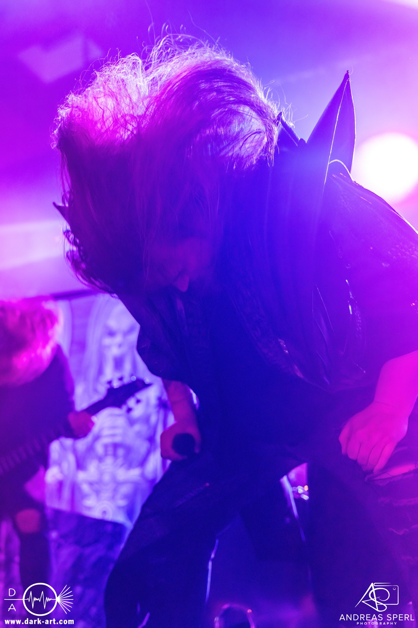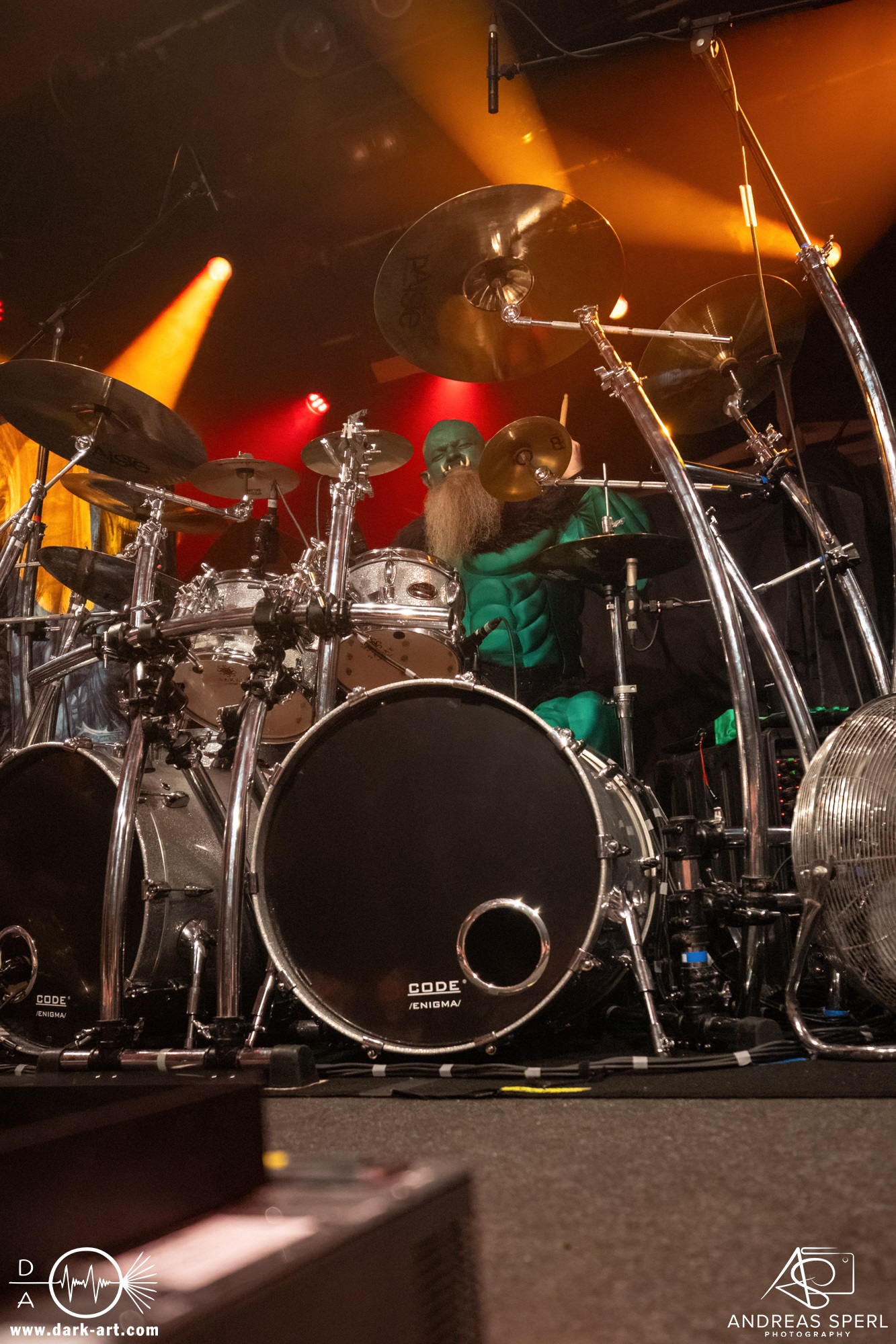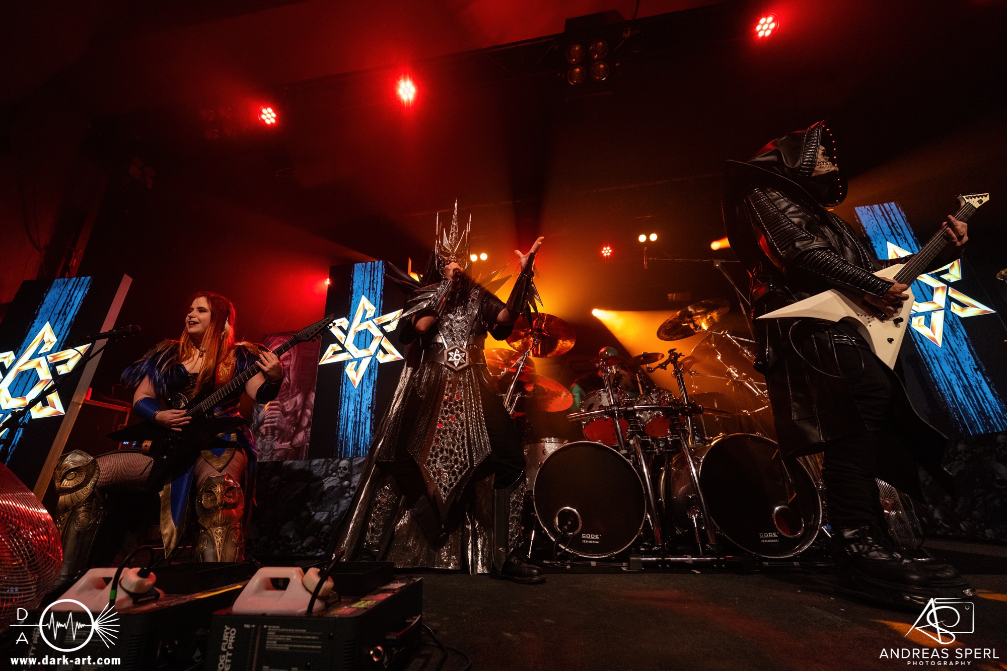 Dass es hier eigentlich nur um mit Metal garnierte gute Laune geht, zeigt sich auch an den Spielereien zwischen den Bandmitgliedern, so versucht der „Arch Demon Seebulon, The Origin of all Evil“ am Bass immer wieder die Zwergengitarristin an Soli zu hindern oder verbietet dem Publikum ihr Spiel gut zu finden. Sie hat es auch so nicht leicht, muss sie ihr Set doch aufgrund einer Fußverletzung im Sitzen absolvieren, was ihr das Publikum umso mehr mit Anerkennung zollt. Beim Laser-Shooting Dinosaur kommt sogar eines von diesen unglaublich lustigen Plastikganzkörperkostümen in T-Rex-Manier zum Einsatz und unterfüttert so die „Glaubwürdigkeit“ des Songs und wird nach dem Song von der Zwergin mit einem lasziven Klaps auf sein schuppiges Hinterteil wieder von der Bühne getrieben. Als nächsten Track gibt es die brandneue Single The Fire of Yore. Danach werden wir vom Reaper-Bassisten persönlich über seine Geschichte informiert, dass er nur wieder in die Hölle zurückwill und deswegen so miesepetrig ist. Währenddessen fällt ihm auf, dass er ja in Berlin ist und uns das Ganze auch auf Deutsch erzählen kann und fragt uns dann, wie denn die Tür zur Hölle aufgehe. Was uns im nächsten und abschließenden Song Ride to Hell erklärt wird.