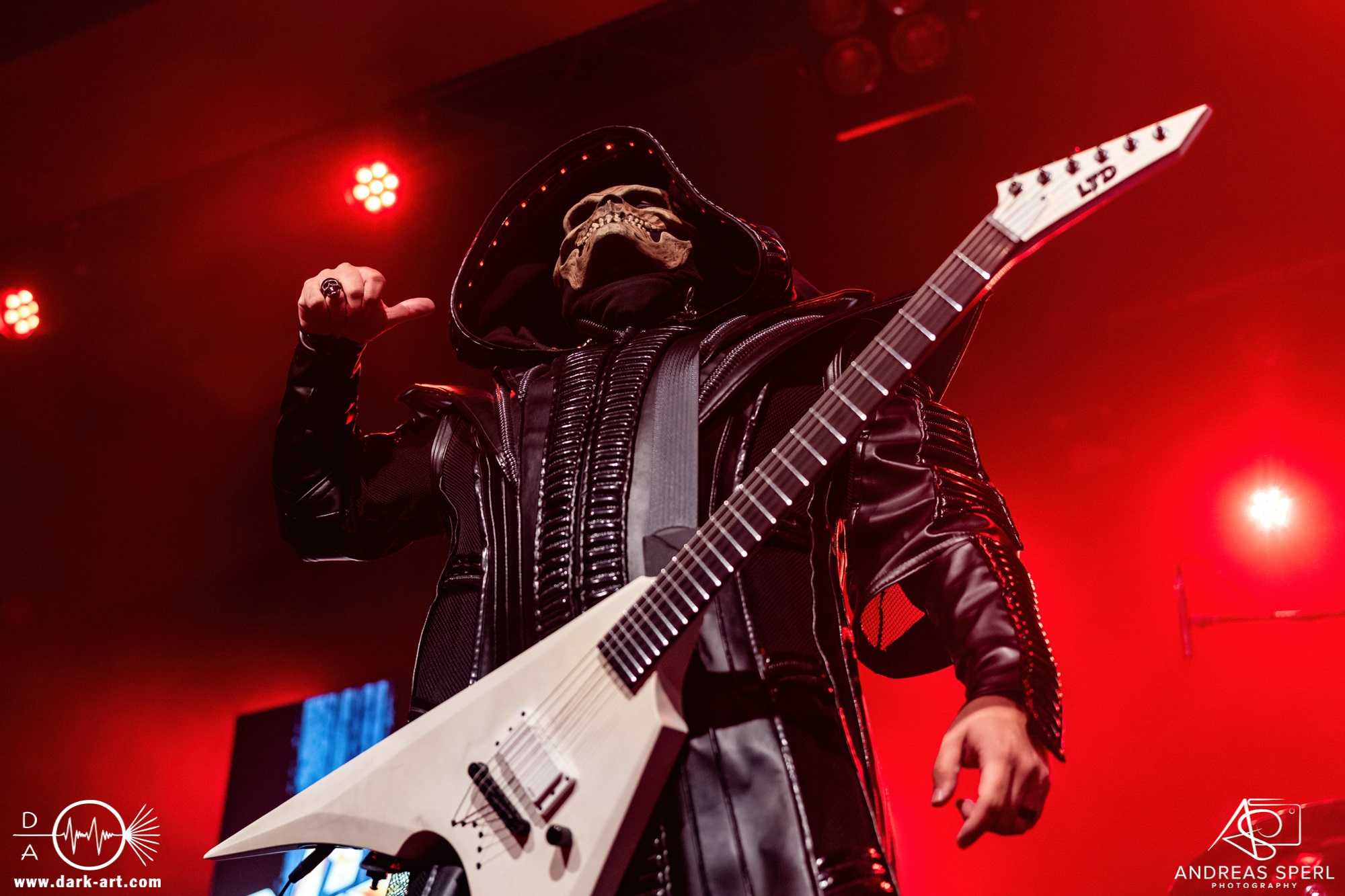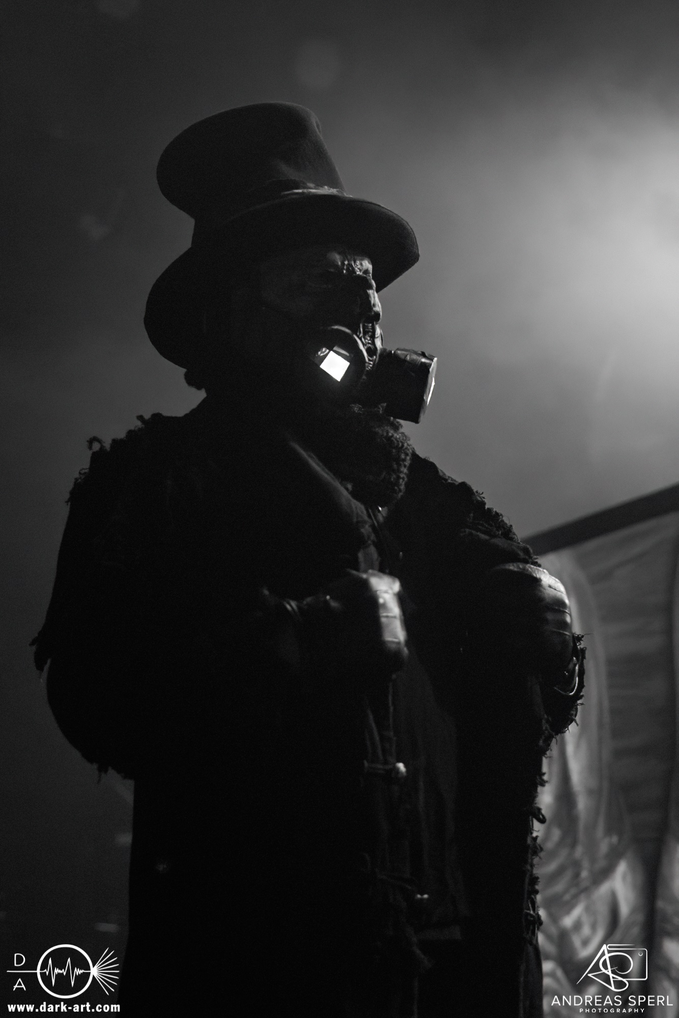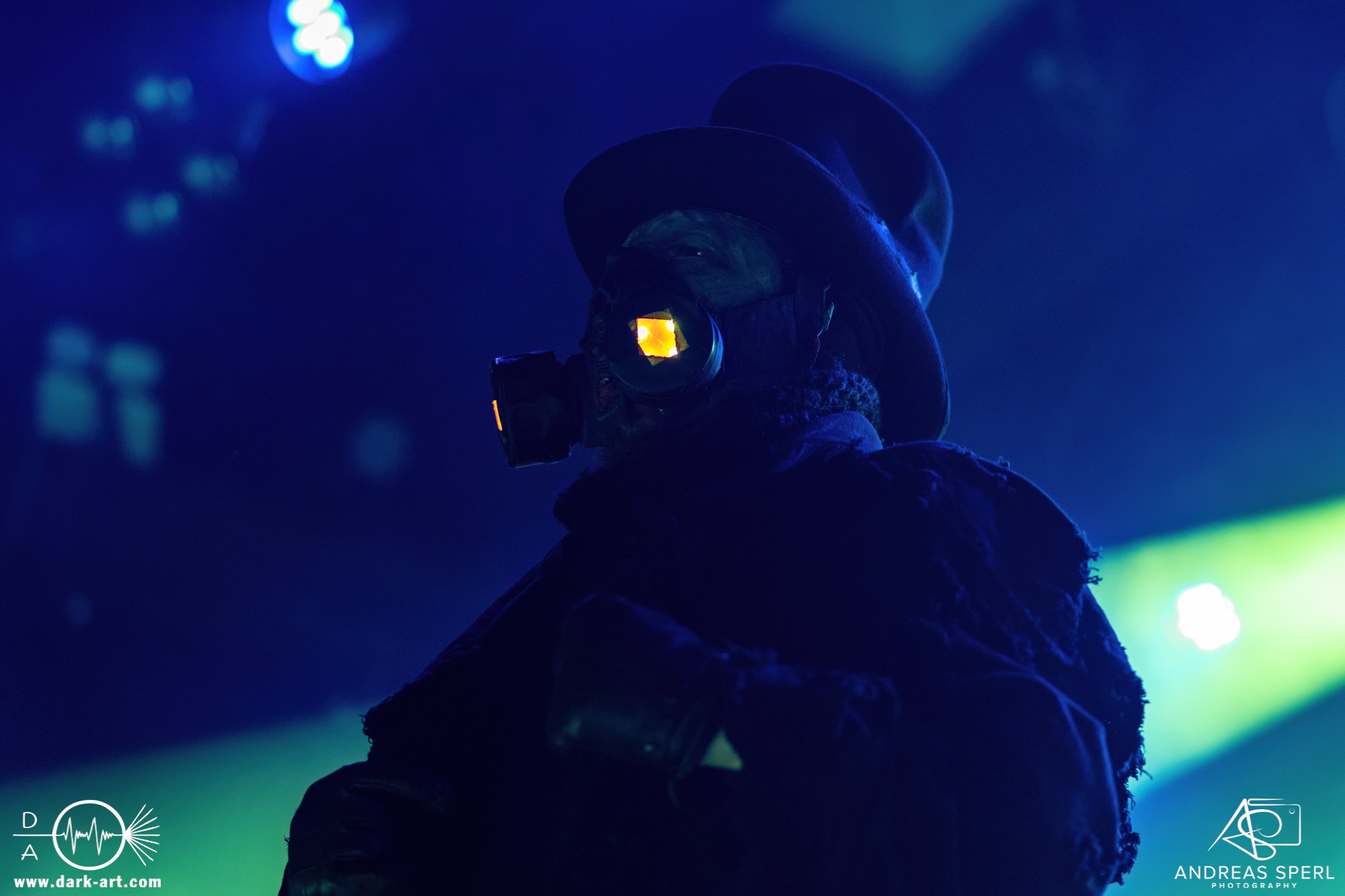 Kurz vor 20 Uhr betreten die gut gelaunten Teutonen die Plattform. Alister Vale, das Maskottchen der Band betritt mit leuchtender Gasmaske die Bühne und seine Lebensgeschichte und Bedeutung seiner Mission rieseln aus der Konserve auf uns herab. Das neue Album The Order of Fear bildet heute den Mittelpunkt des Sets und leitet den Abend mit F.E.V.E.R. ein. Zwei Gitarren schrubben deftige Riffs zu gezupftem Bass und dem Gesang von Sänger Seeb und dem Schlagzeuggewummer hinter den Vieren.