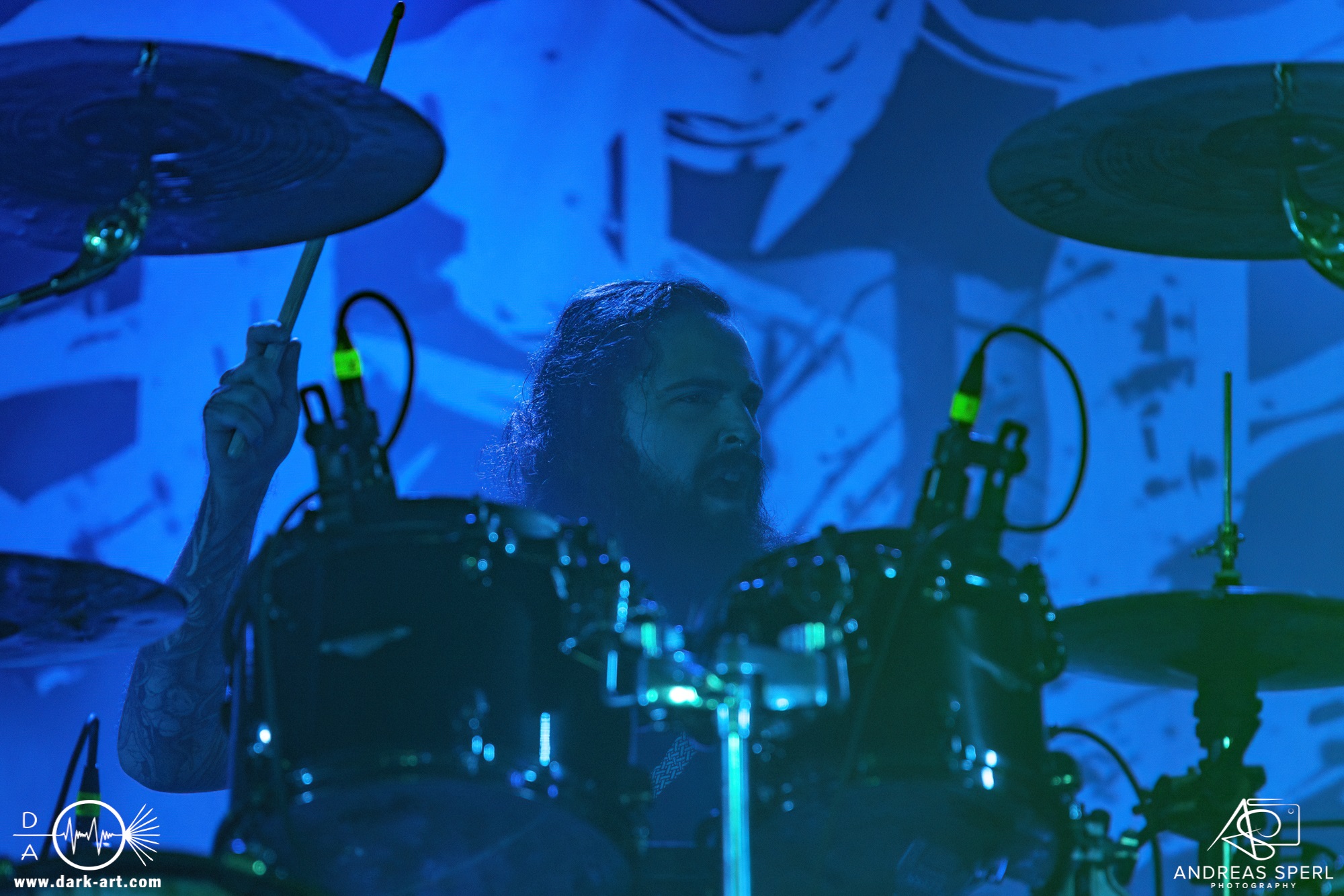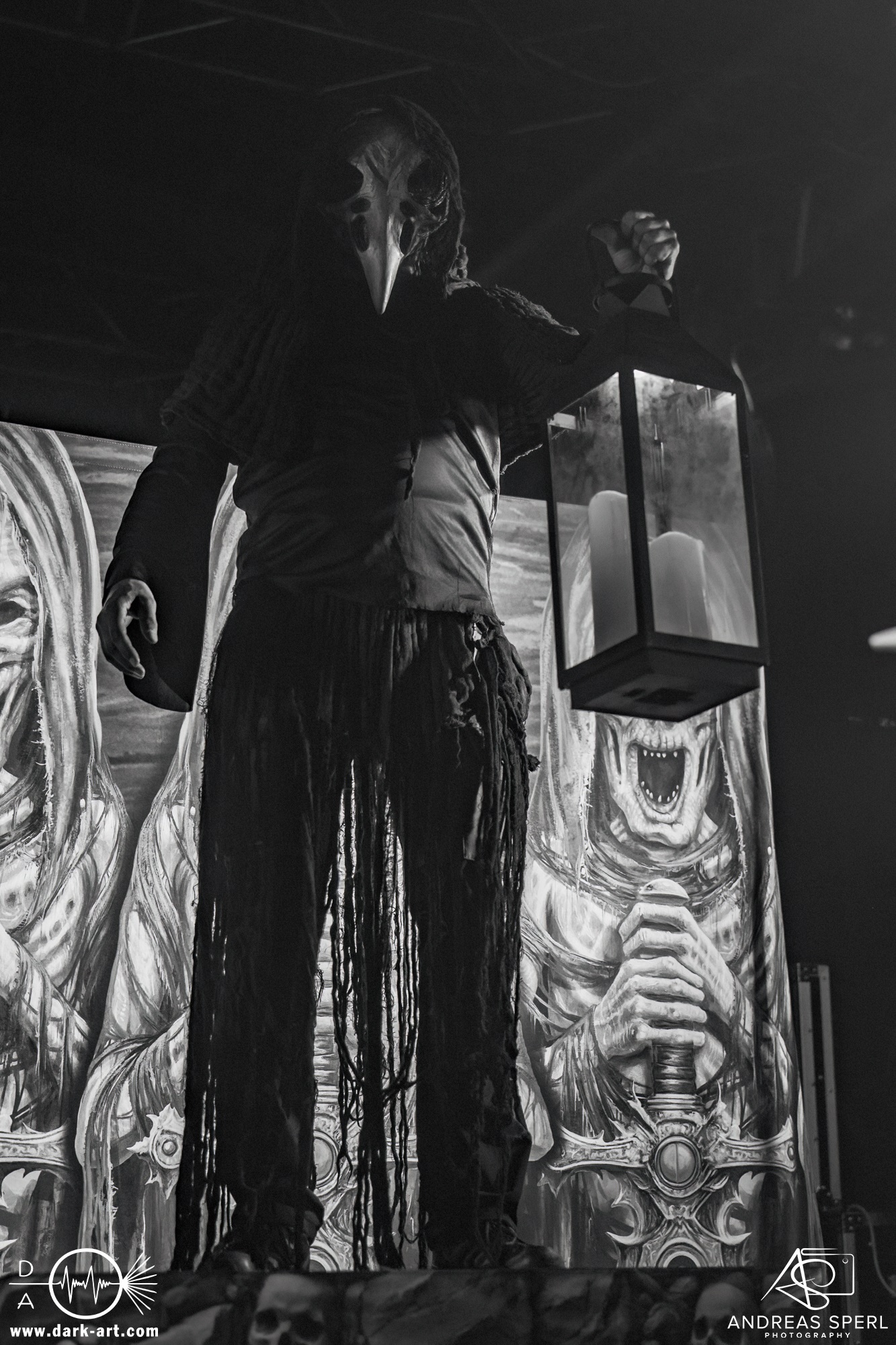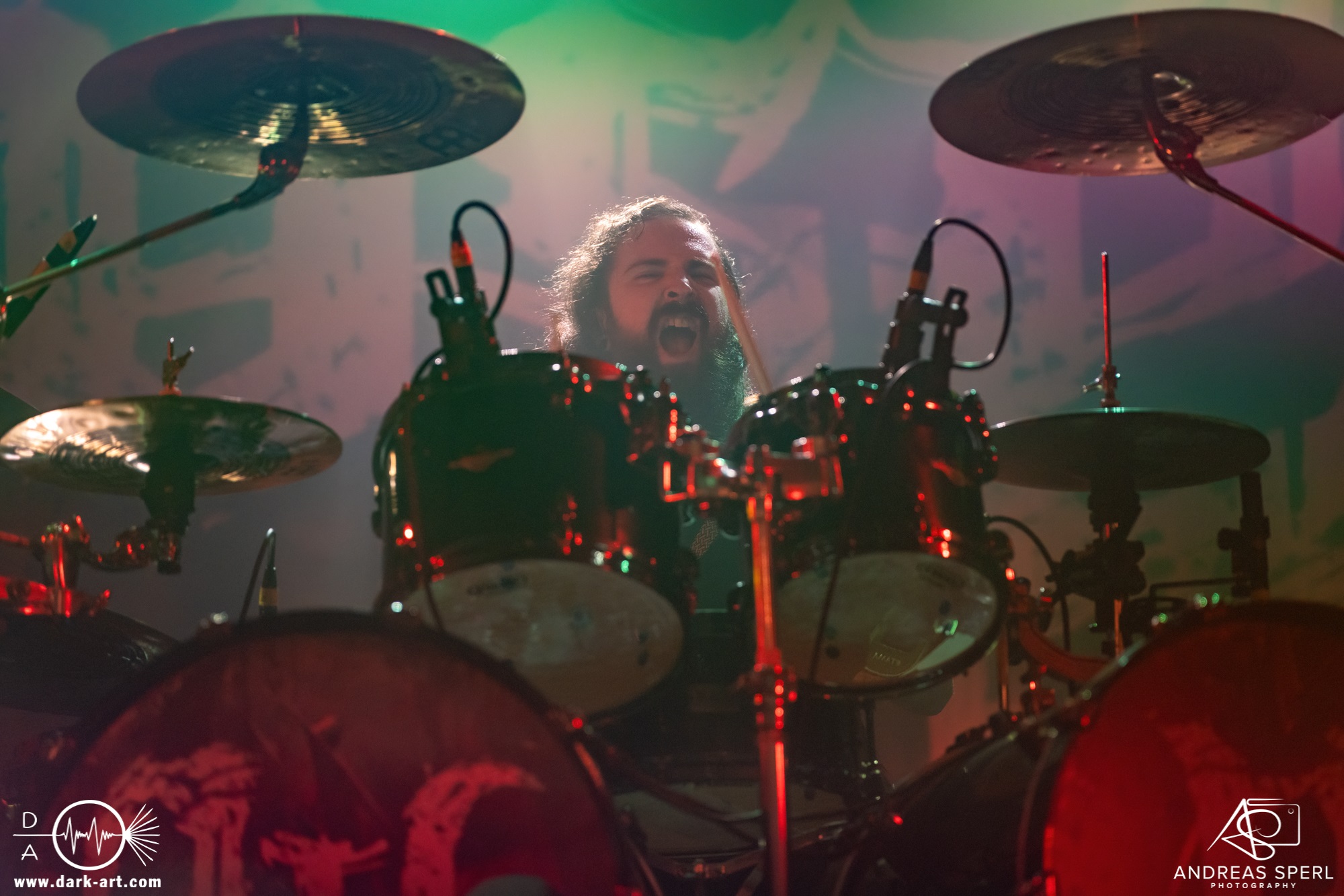 Kurz vor 20 Uhr betreten die gut gelaunten Teutonen die Plattform. Alister Vale, das Maskottchen der Band betritt mit leuchtender Gasmaske die Bühne und seine Lebensgeschichte und Bedeutung seiner Mission rieseln aus der Konserve auf uns herab. Das neue Album The Order of Fear bildet heute den Mittelpunkt des Sets und leitet den Abend mit F.E.V.E.R. ein. Zwei Gitarren schrubben deftige Riffs zu gezupftem Bass und dem Gesang von Sänger Seeb und dem Schlagzeuggewummer hinter den Vieren.