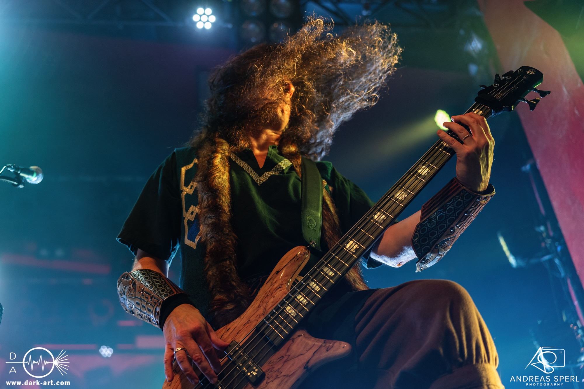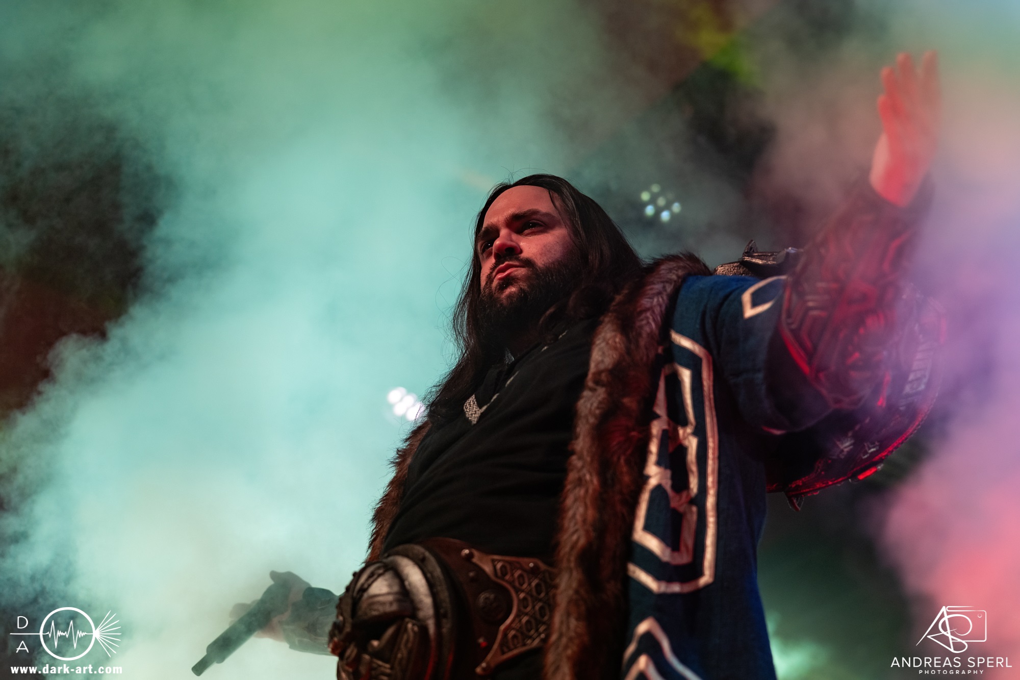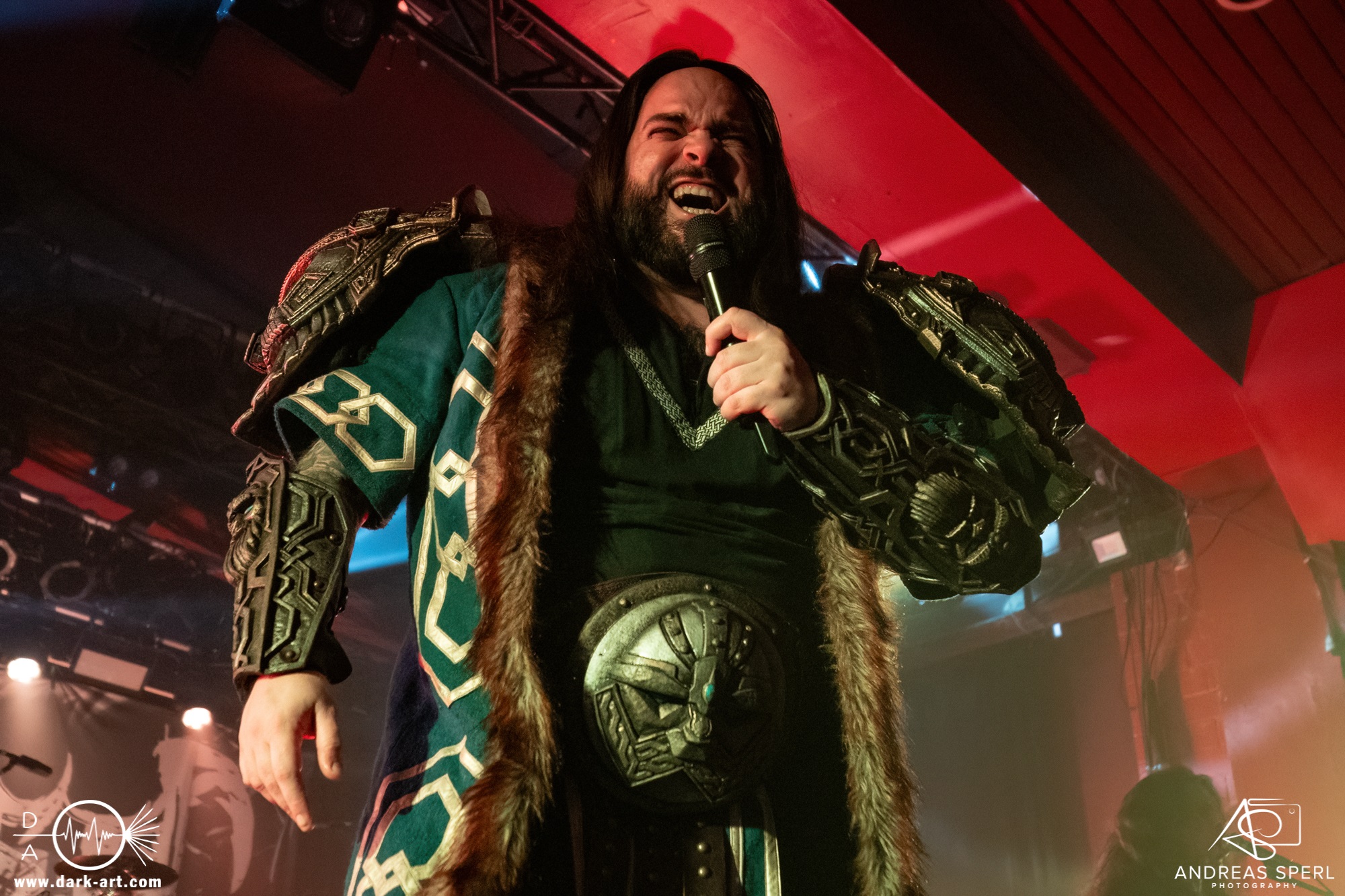 Zwischendurch gibt es immer wieder fröhliche Ansagen von der Bühne, garniert mit etwas Bandhistorie. So wird darauf hingewiesen, dass 2023 im Orwo Haus die erste Zwergenparty Berlins stattgefunden hat, was für Wind Rose wohl einen deutlichen Karrieresprung (in den Worten des Sängers: „Success“) bedeutete. Ob man jedoch einen Auftritt im ZDF-Fernsehgarten mit ihrem wohl bekanntesten Track als Erfolg bezeichnen kann, darf sich jeder selbst in den Zwergenbart murmeln. Zum Dragonslayer wird wieder ordentlich abgehottet und fast ohne Aufforderung der faustschwingende „Hey“-Ruf zelebriert. Zeit sich das Horn neu befüllen zu lassen, und Lob durch die Bardame für mein Outfit zu kassieren, während sich die Halle zu The Returning Race wieder einen ab-circled.