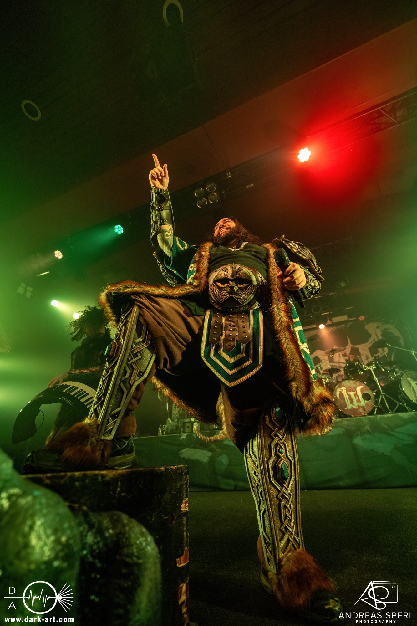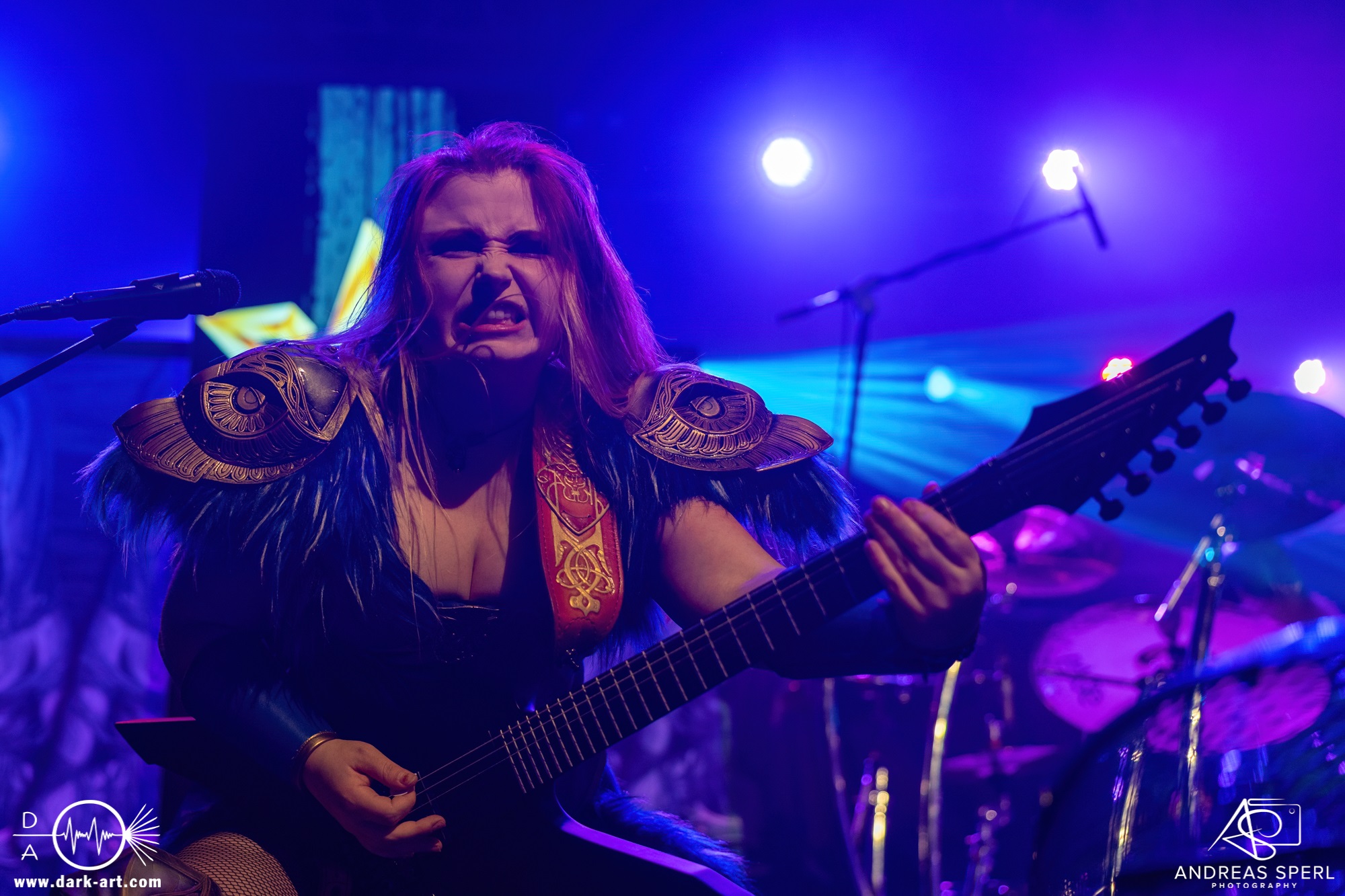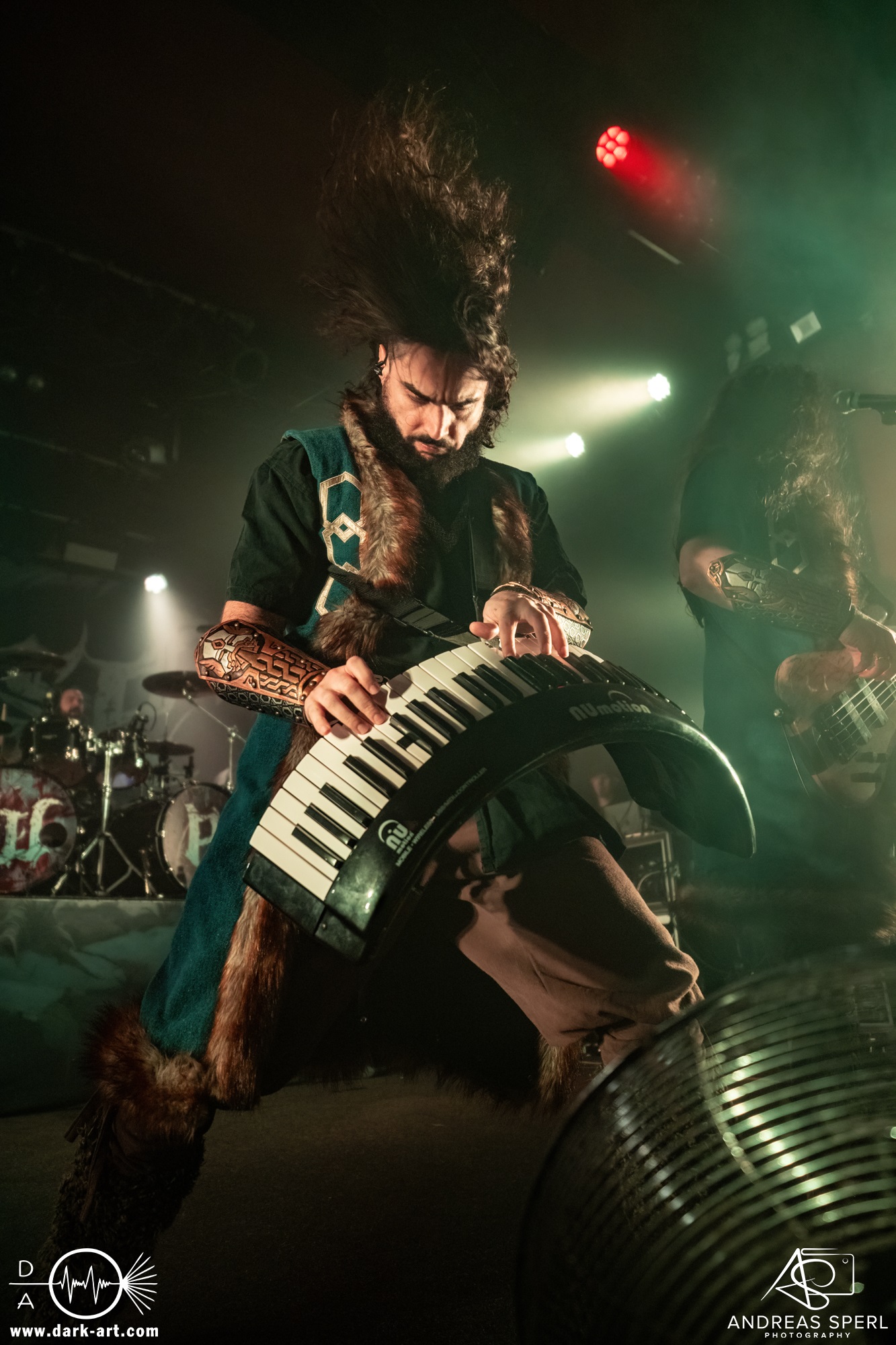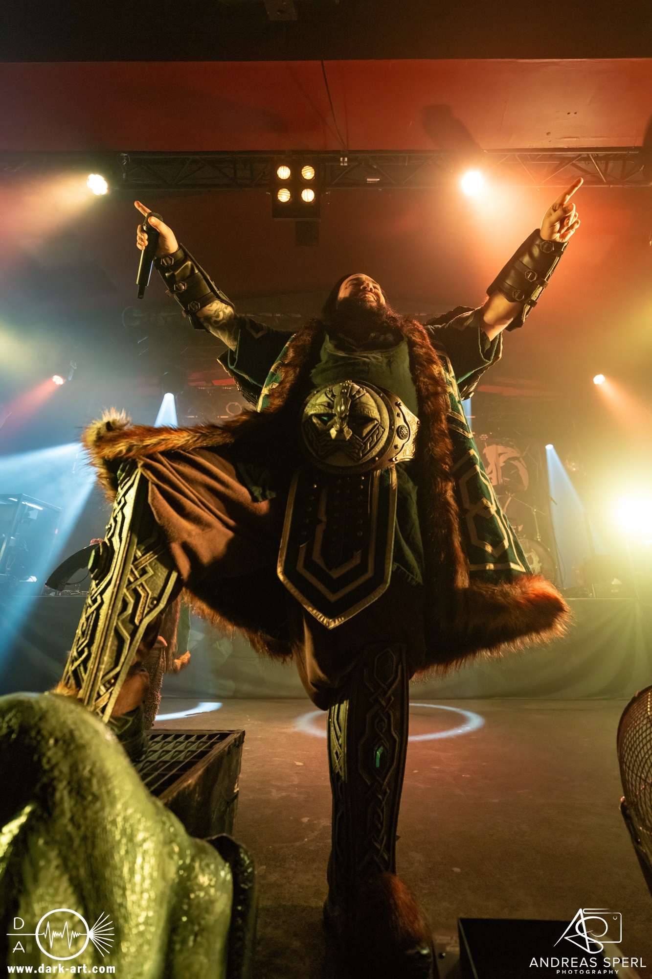 Zwischendurch gibt es immer wieder fröhliche Ansagen von der Bühne, garniert mit etwas Bandhistorie. So wird darauf hingewiesen, dass 2023 im Orwo Haus die erste Zwergenparty Berlins stattgefunden hat, was für Wind Rose wohl einen deutlichen Karrieresprung (in den Worten des Sängers: „Success“) bedeutete. Ob man jedoch einen Auftritt im ZDF-Fernsehgarten mit ihrem wohl bekanntesten Track als Erfolg bezeichnen kann, darf sich jeder selbst in den Zwergenbart murmeln. Zum Dragonslayer wird wieder ordentlich abgehottet und fast ohne Aufforderung der faustschwingende „Hey“-Ruf zelebriert. Zeit sich das Horn neu befüllen zu lassen, und Lob durch die Bardame für mein Outfit zu kassieren, während sich die Halle zu The Returning Race wieder einen ab-circled.