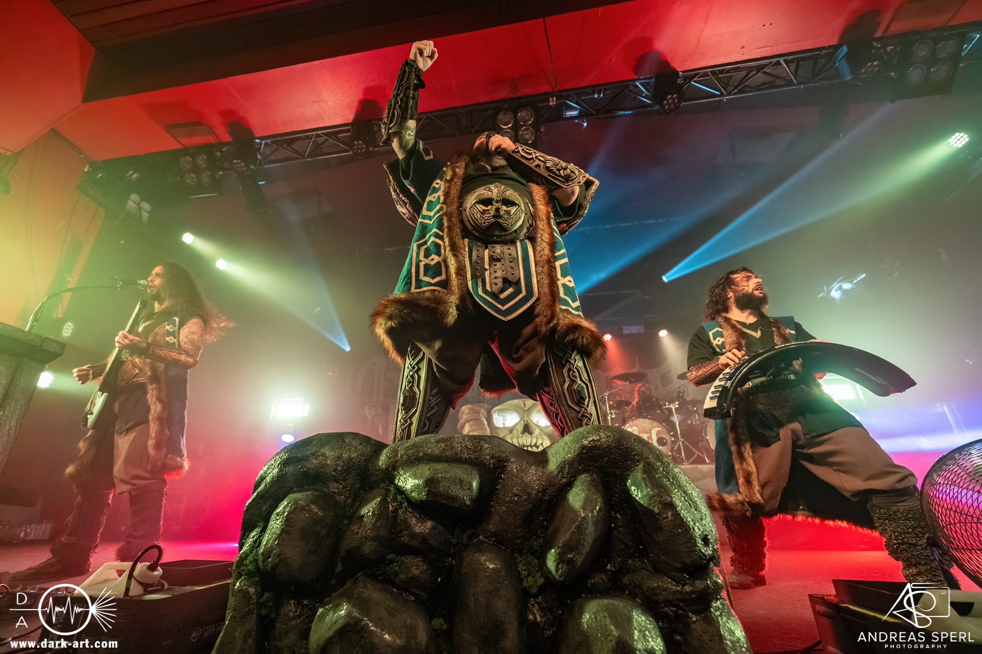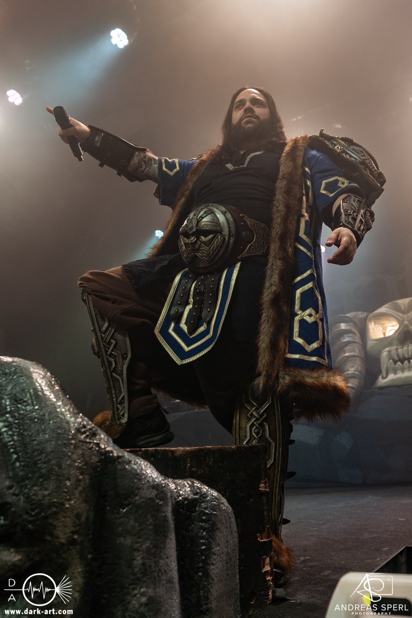 Das fulminante Army of Stone vom Vorgängeralbum Warfront markiert den Einstieg und es werden die ersten, bzw alle aufblasbaren 10€-Spitzhacken geschwenkt und Berlin durchtanzt bereits die von der Bühne flutenden Nebelschwaden. Zu The great Feast Underground wird bereits der erste Circle Pit gezündet, denn „we drink Alcohol“. Das Motiv des dazugehörigen Shirts spricht mich dermaßen an, dass ich es mir nach dem Konzert sogar zulege, auch deshalb, weil das andere Shirt, dass ich eher haben wollte, nicht mehr in meiner Größe vorhanden war. Army of Stone kommt für mich als Tolkien-Fan sowieso immer gut und auch Berlin hüpft berauscht und sogar das komplette nachfolgende Mine, Mine, Mine! durchweg mit.