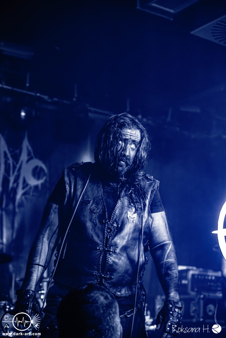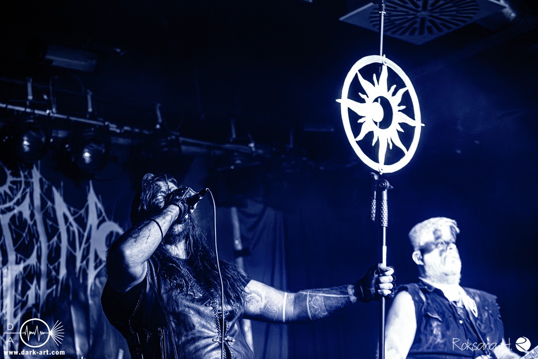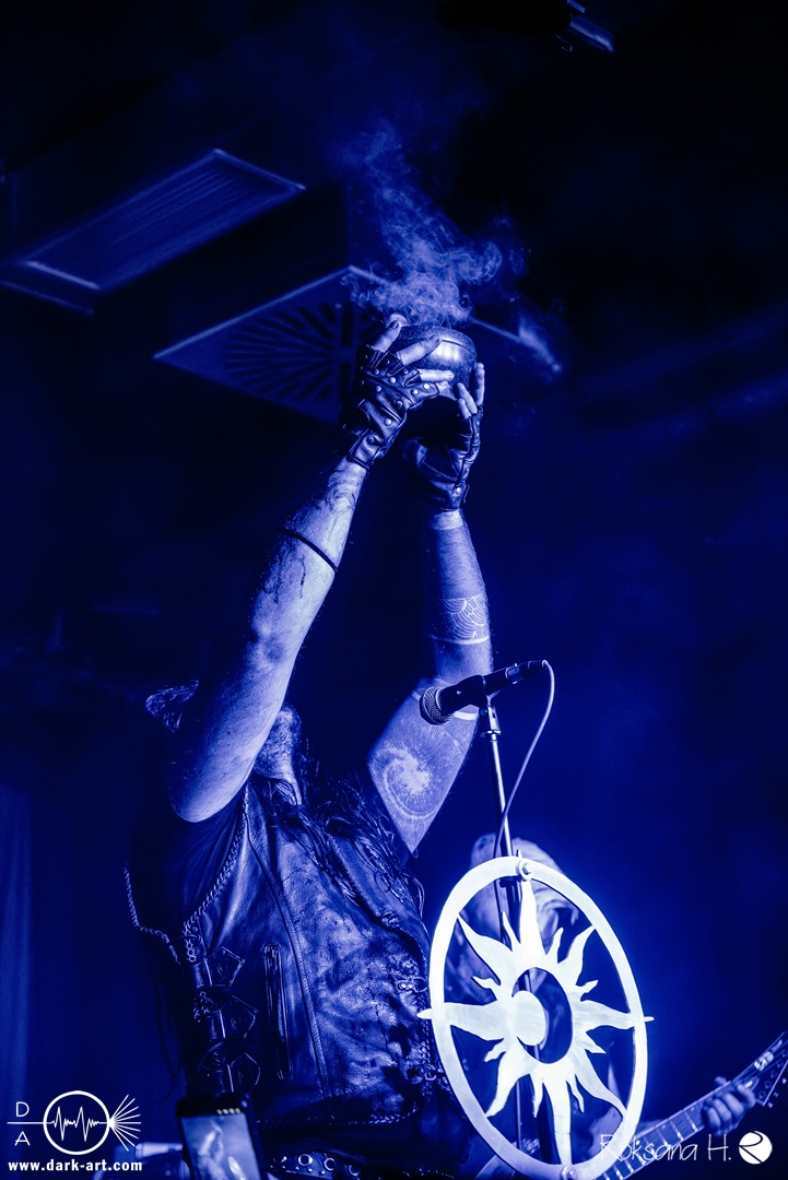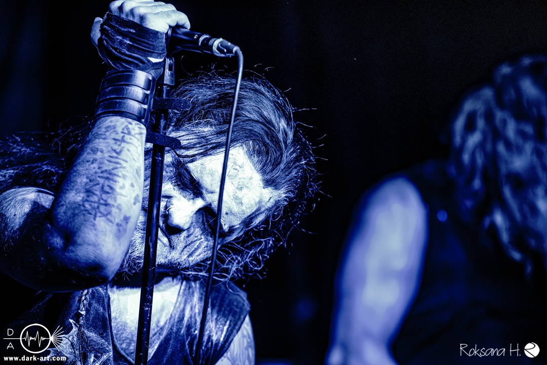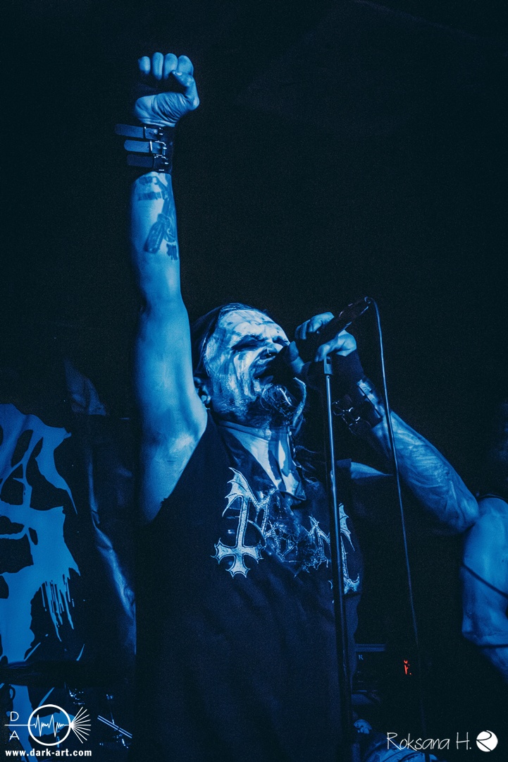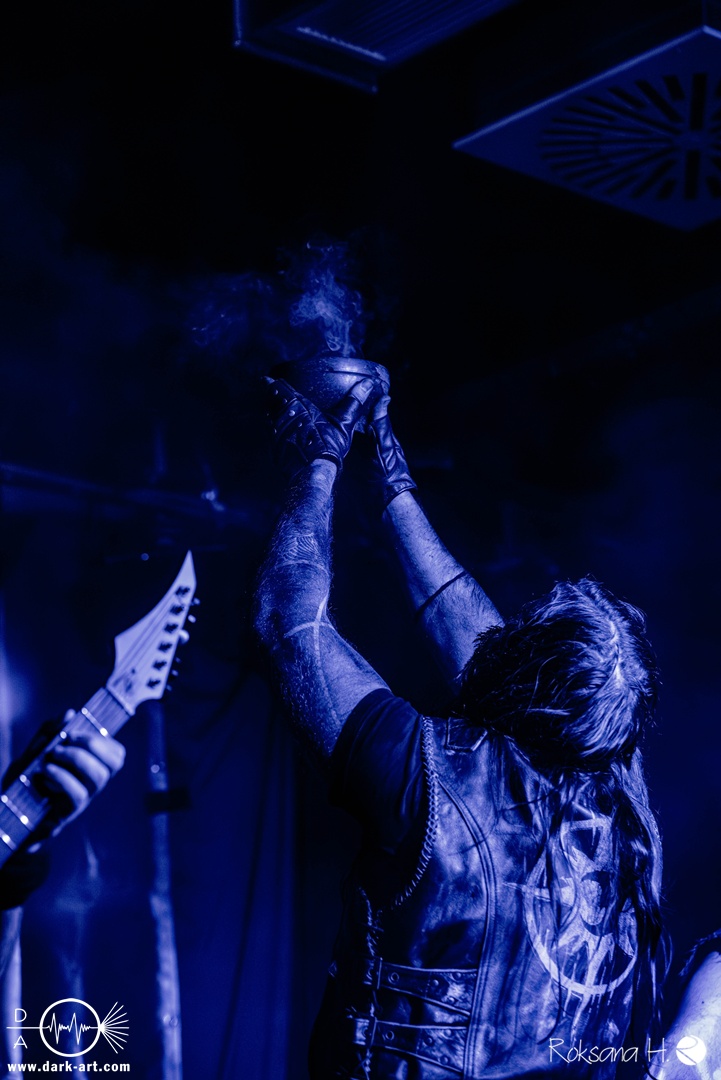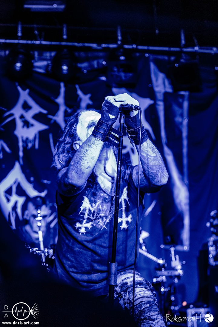 Aber kommen wir erst einmal zum Anfang,  den machten nämlich Morbus Dei. Die vierköpfige Band durfte die Black Metal Bastion eröffnen und das Publikum auf den weiteren Abend einstimmen. „Einstimmen“ ist dabei ein spannendes Wort, die Band trägt sich in erster Linie durch den intensiven Gesang vom Sänger Pain. Während es musikalisch mal doomiger, mal grooviger und mal einfach nach einem Paradebeispiel des rohen und gnadenlosen Black Metals klang, öffnete Pain mit jedem Ton ein neues Tor zur Hölle. Dabei hüllte eisblaues Licht durchgehend gleichbleibend die Bühne ein, was damit nicht nur ein entspannter Auftakt für den Lichttechniker war,  sondern für so manchen auch ein sehr eintöniges visuelles Erlebnis. Als die Band sich nach 20 Minuten vom Publikum abwandte,  das Licht gleich blieb und leise Musik im Hintergrund anlief, reagierte das Publikum teils verwirrt dreinblickend, teils startete man Gespräche, bis die Band dann wieder loslegte. Es stellte sich heraus: Die bis hierhin gehörten Klänge waren ein Intro gewesen. Als dann zum nachfolgenden Lied ein Scheinwerfer von Blau auf Lila wechselte und mitten im Song wieder zurück, wurde zumindest klar, dass die Lichtsituation nicht einem Defekt der Anlage zugrunde lag. Oder doch? Nach gut 35 Minuten war das Set zu Ende.