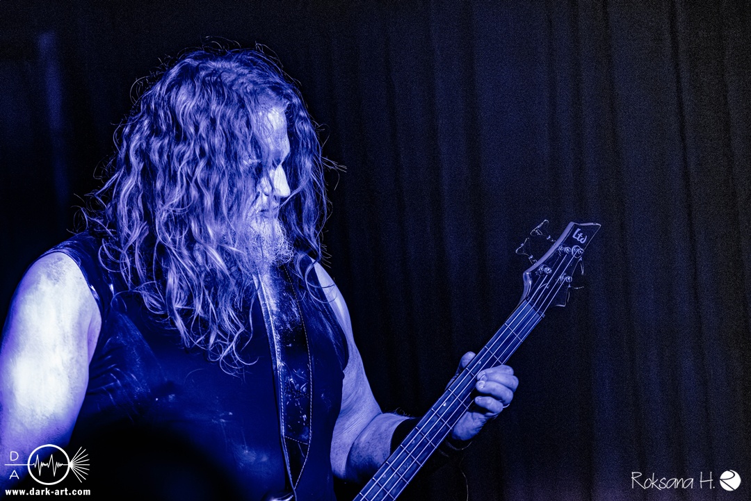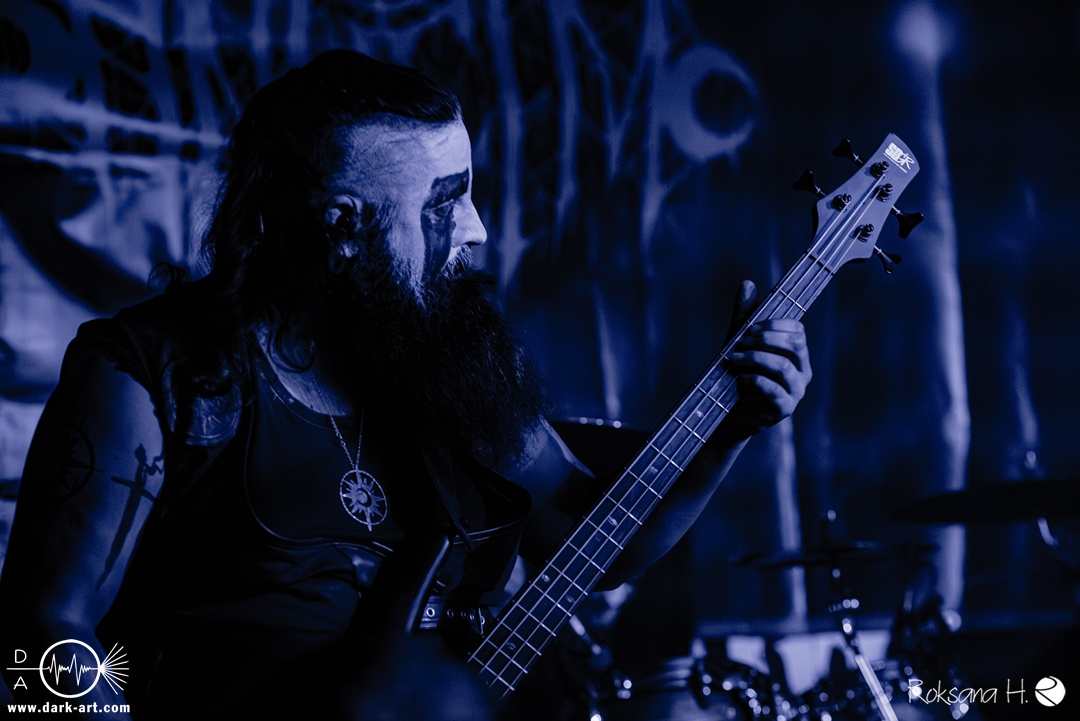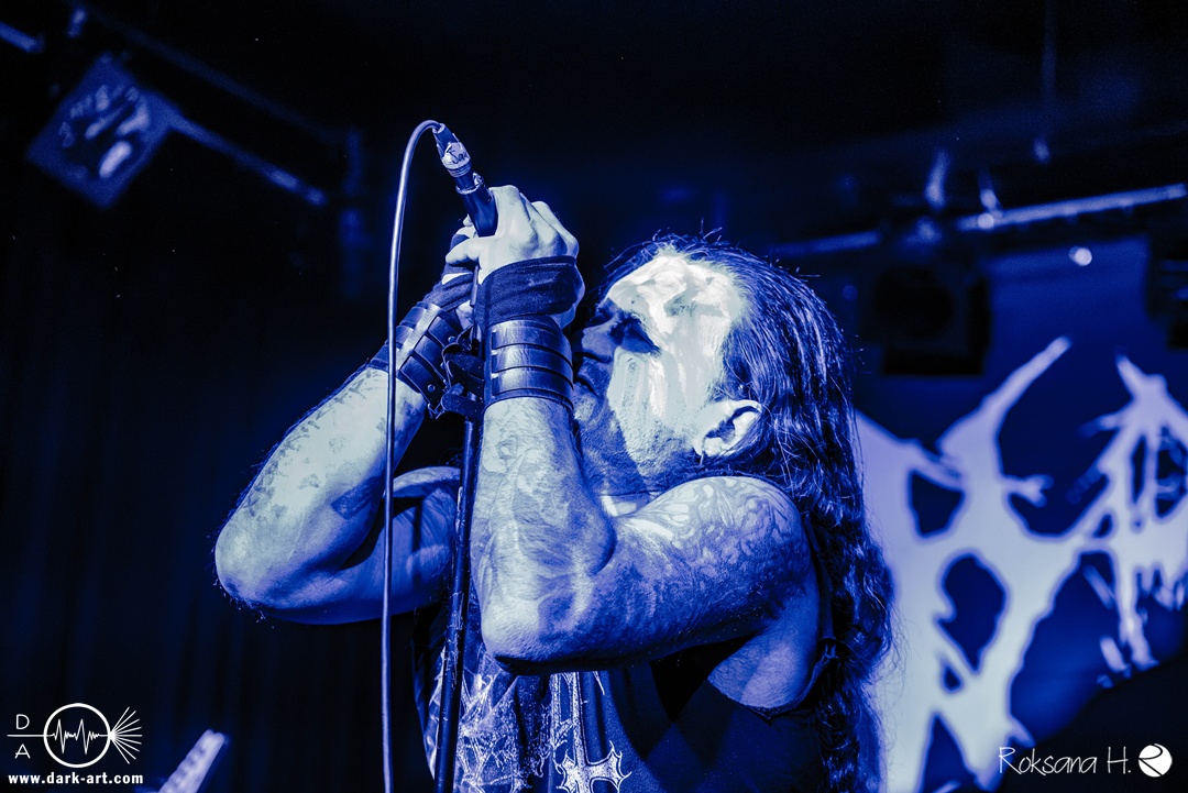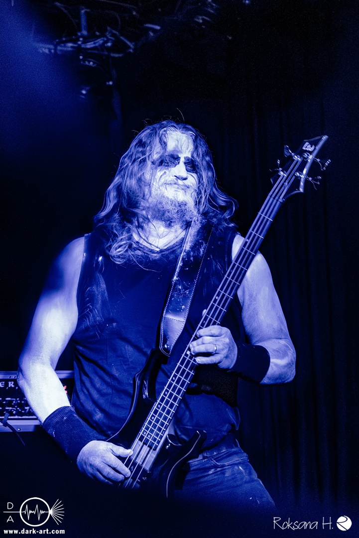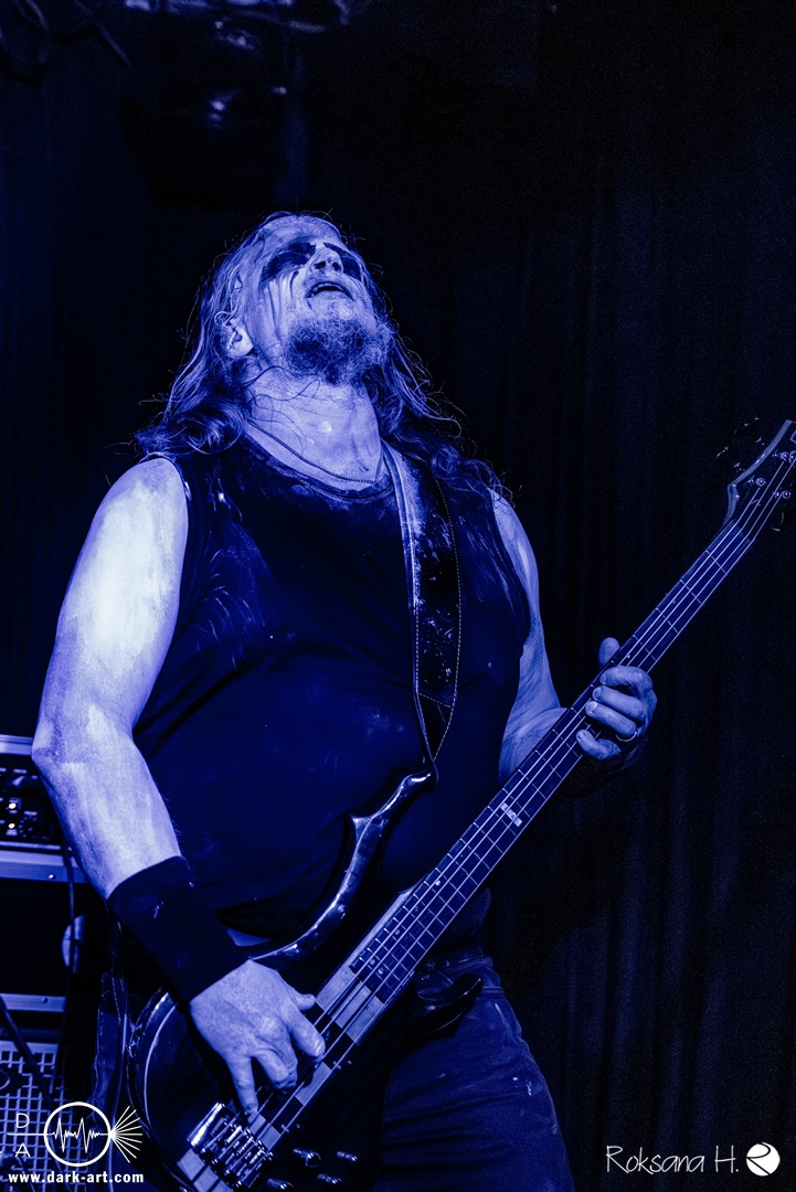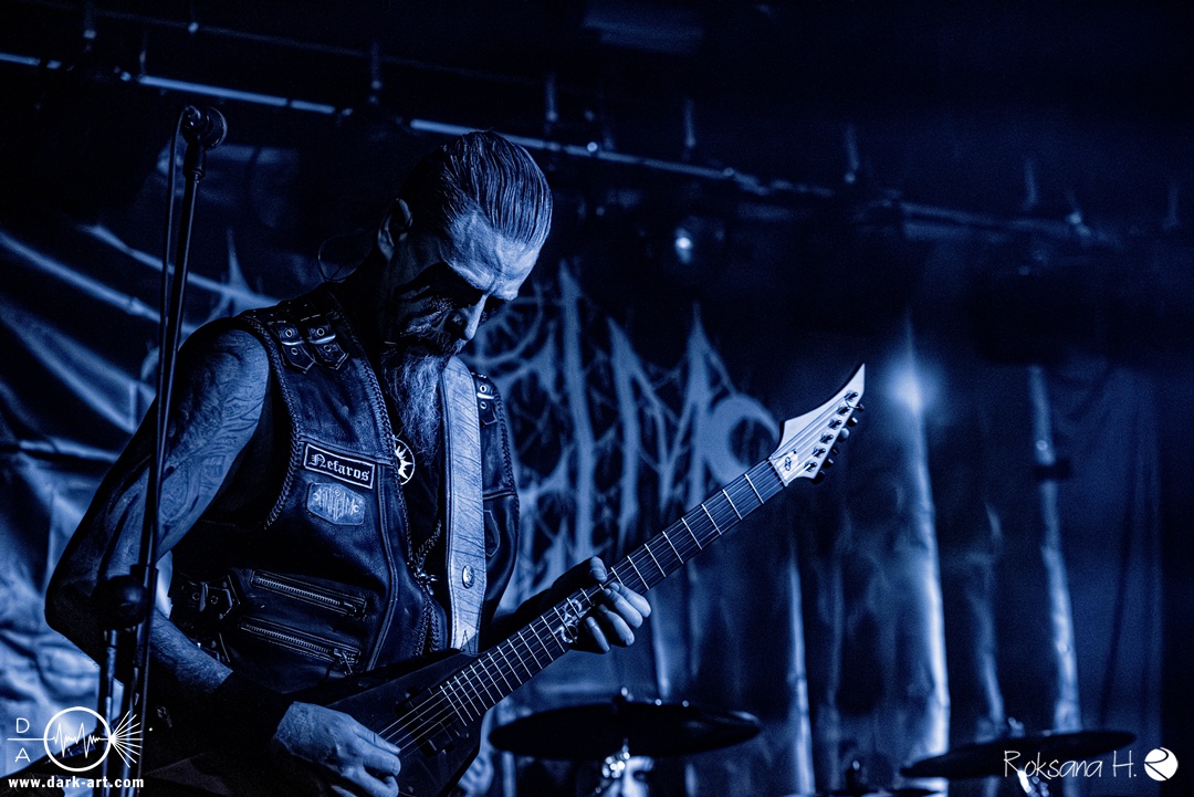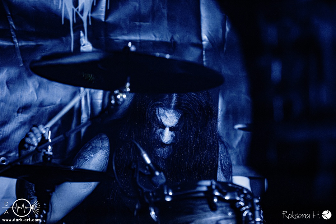 Aber kommen wir erst einmal zum Anfang,  den machten nämlich Morbus Dei. Die vierköpfige Band durfte die Black Metal Bastion eröffnen und das Publikum auf den weiteren Abend einstimmen. „Einstimmen“ ist dabei ein spannendes Wort, die Band trägt sich in erster Linie durch den intensiven Gesang vom Sänger Pain. Während es musikalisch mal doomiger, mal grooviger und mal einfach nach einem Paradebeispiel des rohen und gnadenlosen Black Metals klang, öffnete Pain mit jedem Ton ein neues Tor zur Hölle. Dabei hüllte eisblaues Licht durchgehend gleichbleibend die Bühne ein, was damit nicht nur ein entspannter Auftakt für den Lichttechniker war,  sondern für so manchen auch ein sehr eintöniges visuelles Erlebnis. Als die Band sich nach 20 Minuten vom Publikum abwandte,  das Licht gleich blieb und leise Musik im Hintergrund anlief, reagierte das Publikum teils verwirrt dreinblickend, teils startete man Gespräche, bis die Band dann wieder loslegte. Es stellte sich heraus: Die bis hierhin gehörten Klänge waren ein Intro gewesen. Als dann zum nachfolgenden Lied ein Scheinwerfer von Blau auf Lila wechselte und mitten im Song wieder zurück, wurde zumindest klar, dass die Lichtsituation nicht einem Defekt der Anlage zugrunde lag. Oder doch? Nach gut 35 Minuten war das Set zu Ende.
