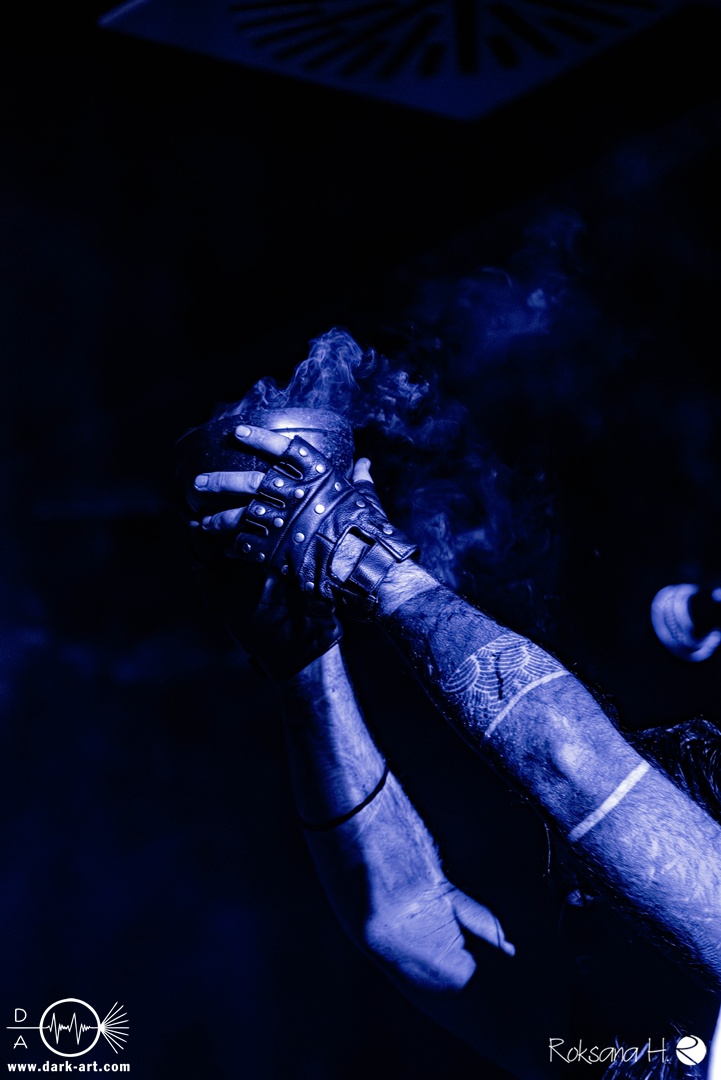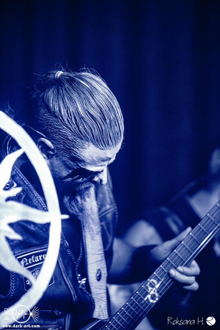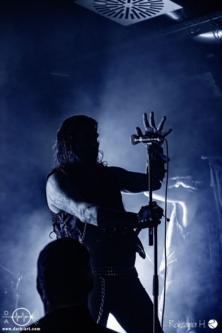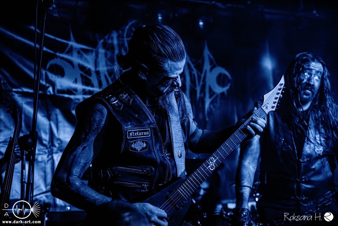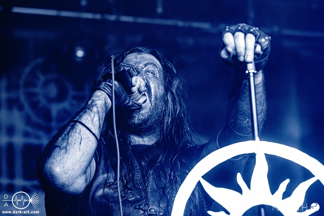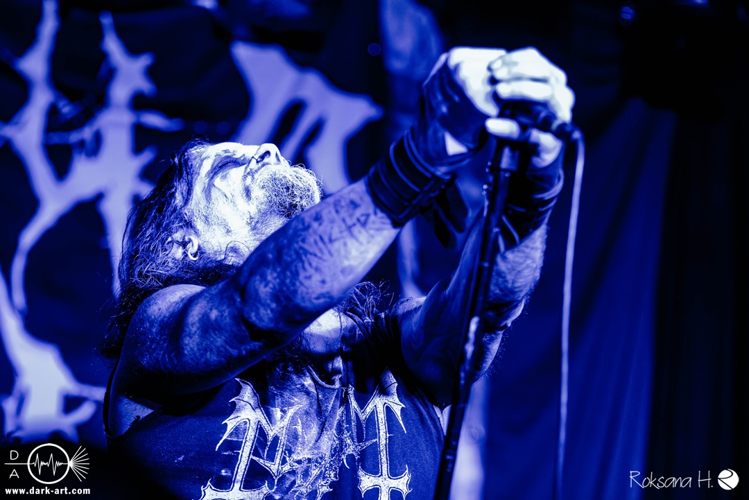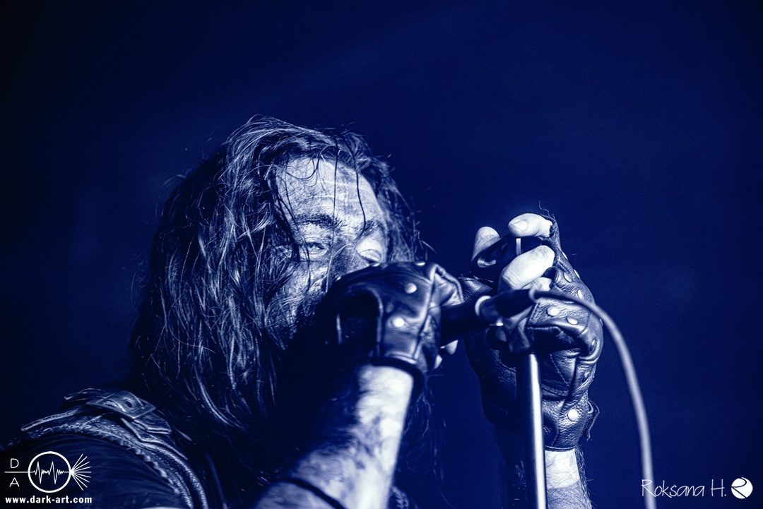 Aber kommen wir erst einmal zum Anfang,  den machten nämlich Morbus Dei. Die vierköpfige Band durfte die Black Metal Bastion eröffnen und das Publikum auf den weiteren Abend einstimmen. „Einstimmen“ ist dabei ein spannendes Wort, die Band trägt sich in erster Linie durch den intensiven Gesang vom Sänger Pain. Während es musikalisch mal doomiger, mal grooviger und mal einfach nach einem Paradebeispiel des rohen und gnadenlosen Black Metals klang, öffnete Pain mit jedem Ton ein neues Tor zur Hölle. Dabei hüllte eisblaues Licht durchgehend gleichbleibend die Bühne ein, was damit nicht nur ein entspannter Auftakt für den Lichttechniker war,  sondern für so manchen auch ein sehr eintöniges visuelles Erlebnis. Als die Band sich nach 20 Minuten vom Publikum abwandte,  das Licht gleich blieb und leise Musik im Hintergrund anlief, reagierte das Publikum teils verwirrt dreinblickend, teils startete man Gespräche, bis die Band dann wieder loslegte. Es stellte sich heraus: Die bis hierhin gehörten Klänge waren ein Intro gewesen. Als dann zum nachfolgenden Lied ein Scheinwerfer von Blau auf Lila wechselte und mitten im Song wieder zurück, wurde zumindest klar, dass die Lichtsituation nicht einem Defekt der Anlage zugrunde lag. Oder doch? Nach gut 35 Minuten war das Set zu Ende.