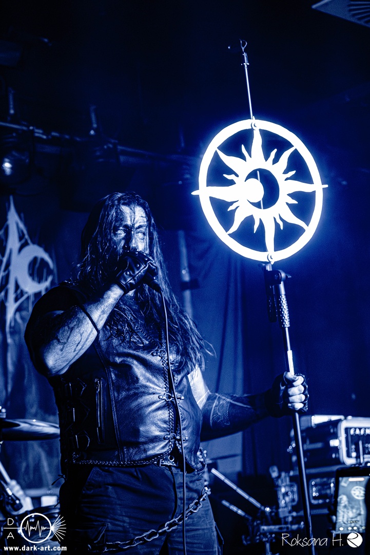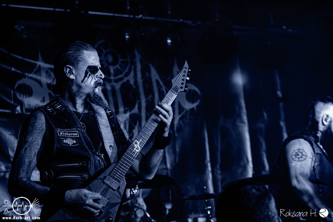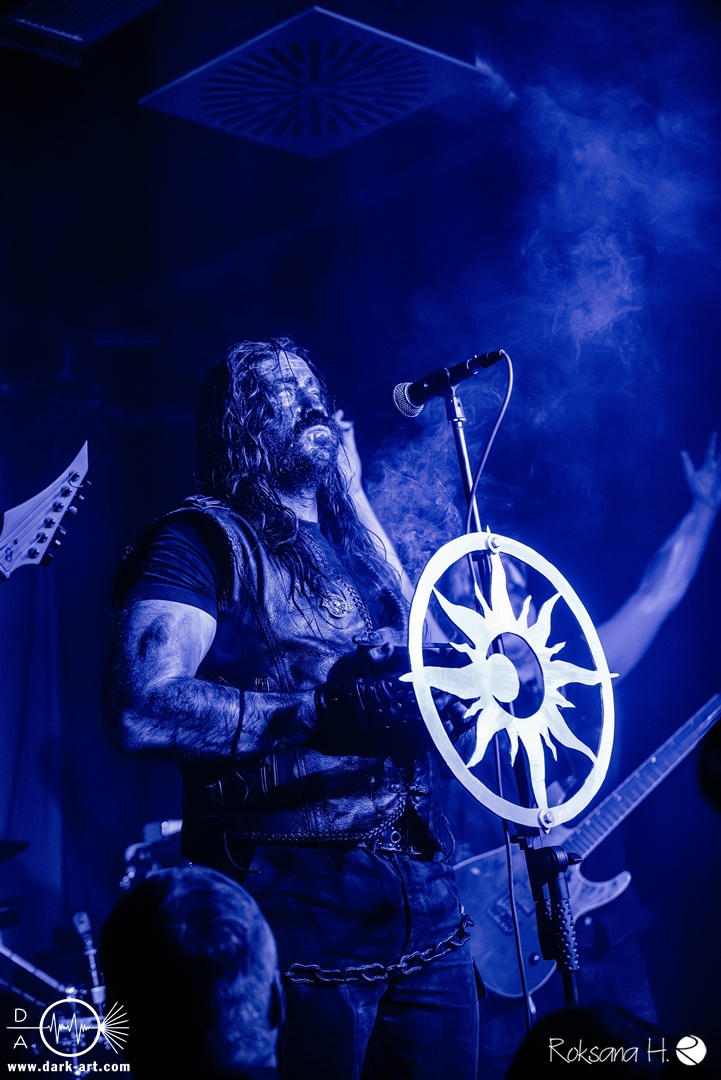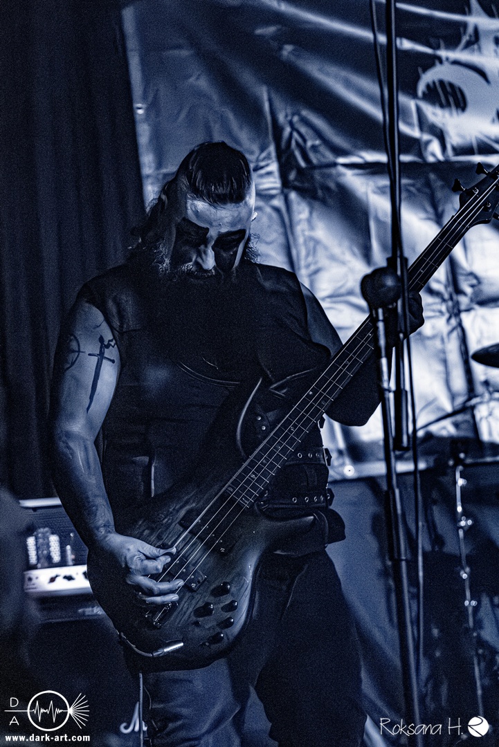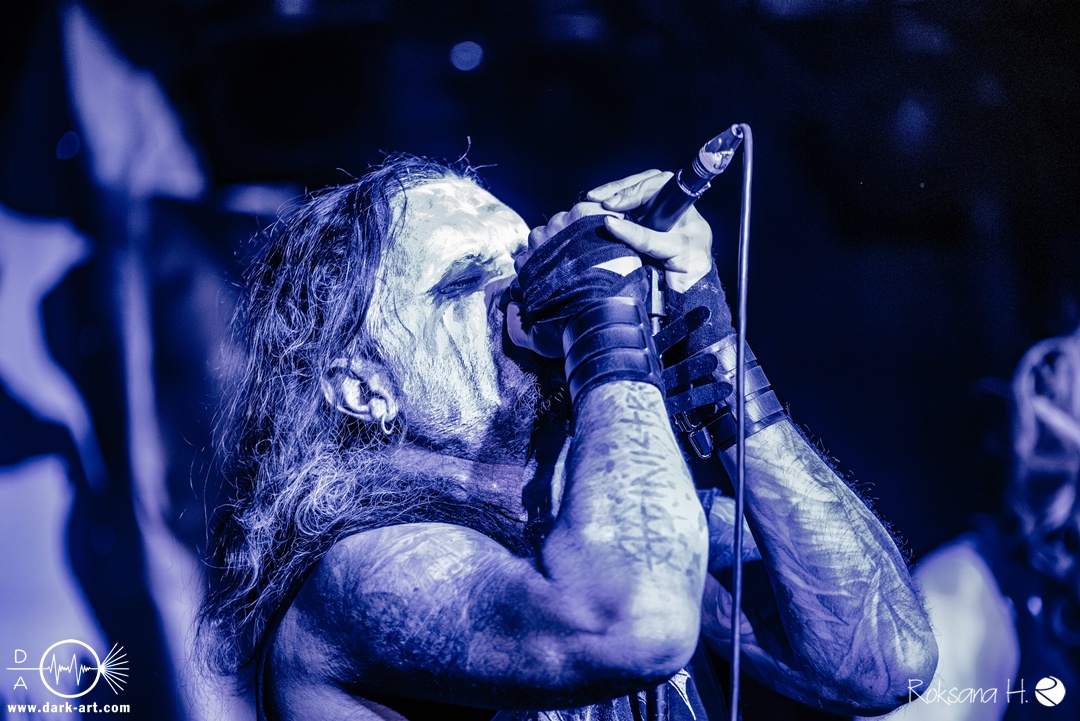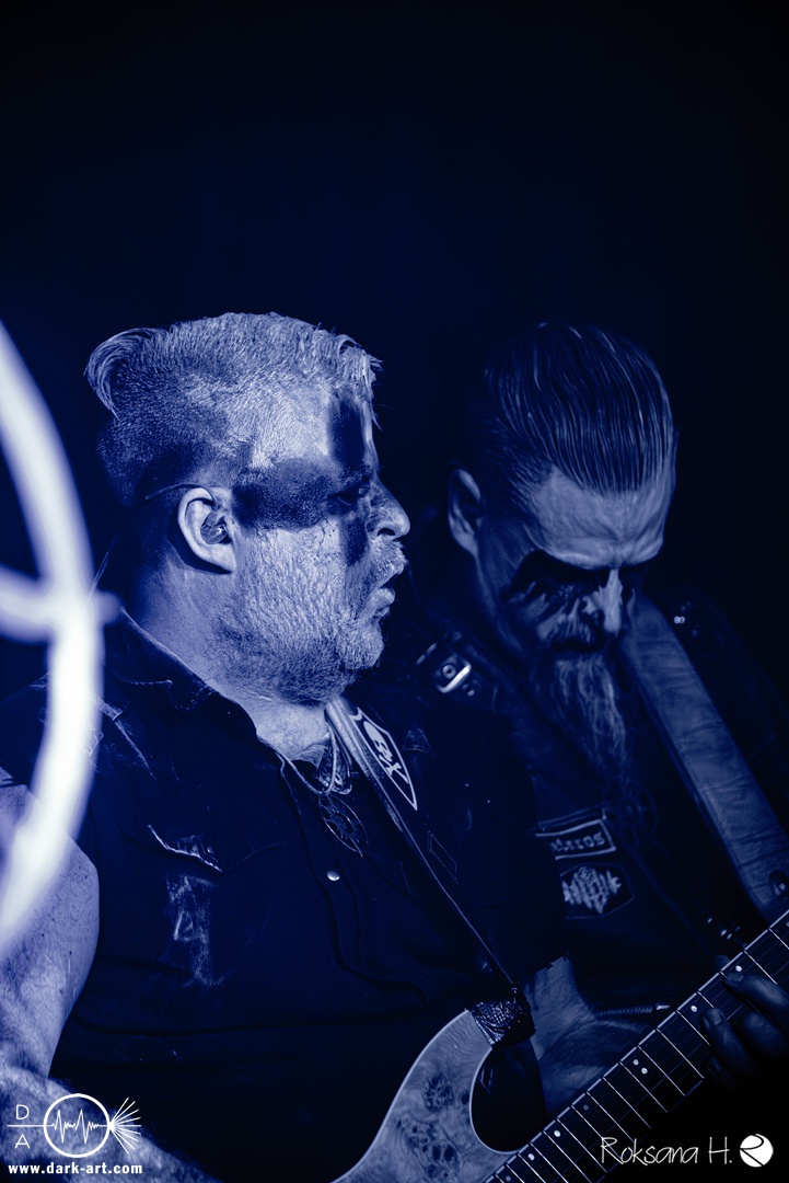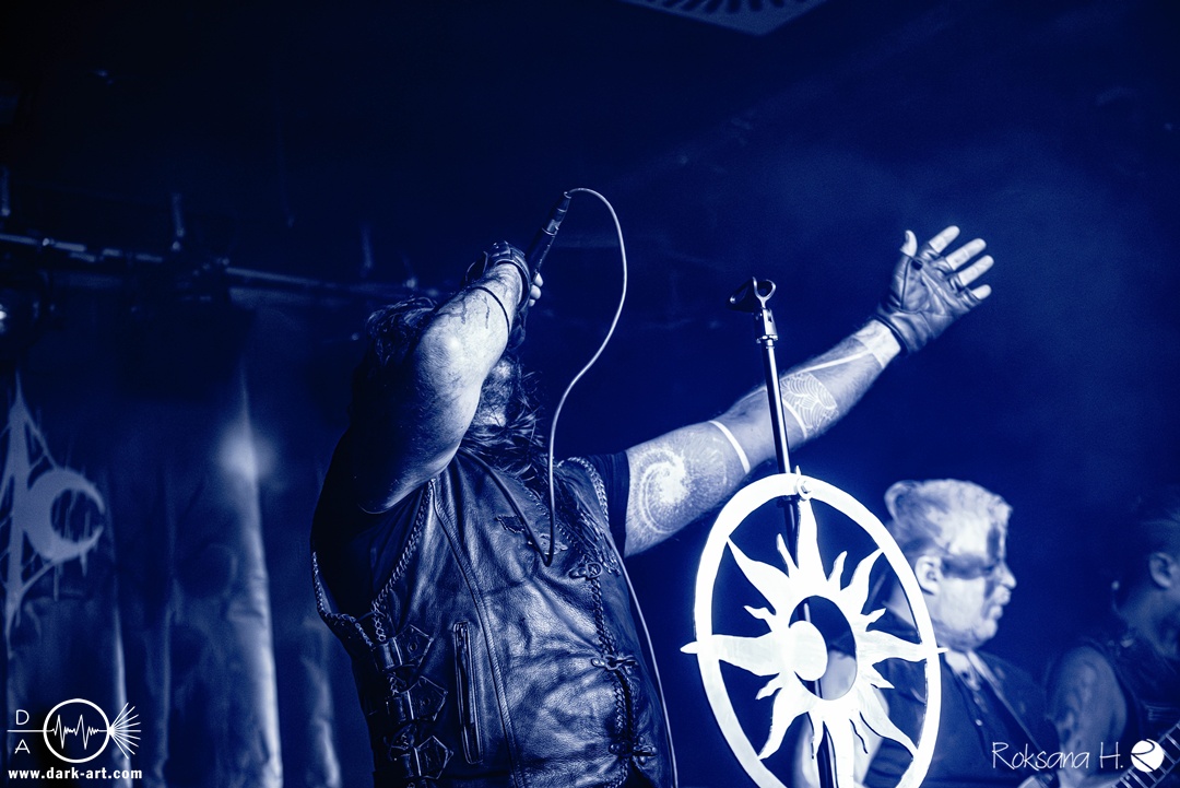 Aber kommen wir erst einmal zum Anfang,  den machten nämlich Morbus Dei. Die vierköpfige Band durfte die Black Metal Bastion eröffnen und das Publikum auf den weiteren Abend einstimmen. „Einstimmen“ ist dabei ein spannendes Wort, die Band trägt sich in erster Linie durch den intensiven Gesang vom Sänger Pain. Während es musikalisch mal doomiger, mal grooviger und mal einfach nach einem Paradebeispiel des rohen und gnadenlosen Black Metals klang, öffnete Pain mit jedem Ton ein neues Tor zur Hölle. Dabei hüllte eisblaues Licht durchgehend gleichbleibend die Bühne ein, was damit nicht nur ein entspannter Auftakt für den Lichttechniker war,  sondern für so manchen auch ein sehr eintöniges visuelles Erlebnis. Als die Band sich nach 20 Minuten vom Publikum abwandte,  das Licht gleich blieb und leise Musik im Hintergrund anlief, reagierte das Publikum teils verwirrt dreinblickend, teils startete man Gespräche, bis die Band dann wieder loslegte. Es stellte sich heraus: Die bis hierhin gehörten Klänge waren ein Intro gewesen. Als dann zum nachfolgenden Lied ein Scheinwerfer von Blau auf Lila wechselte und mitten im Song wieder zurück, wurde zumindest klar, dass die Lichtsituation nicht einem Defekt der Anlage zugrunde lag. Oder doch? Nach gut 35 Minuten war das Set zu Ende.