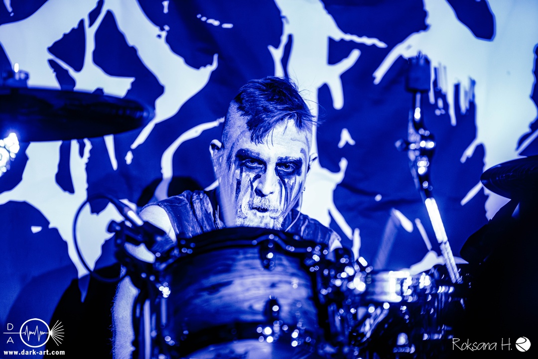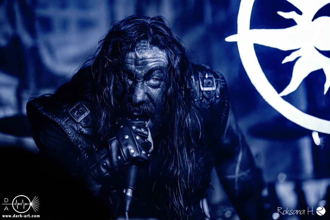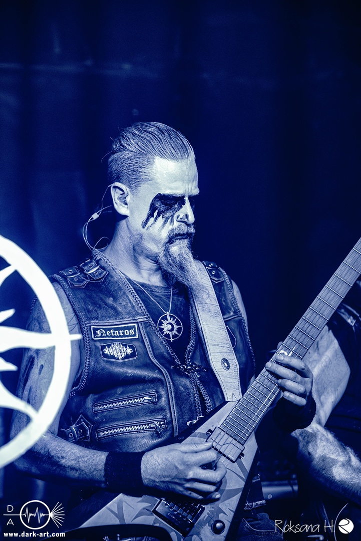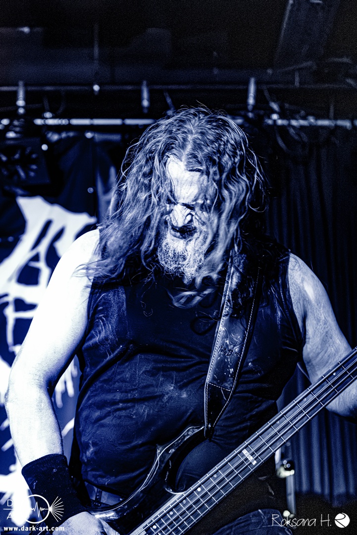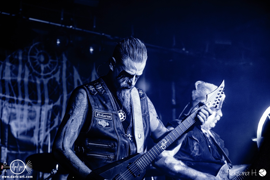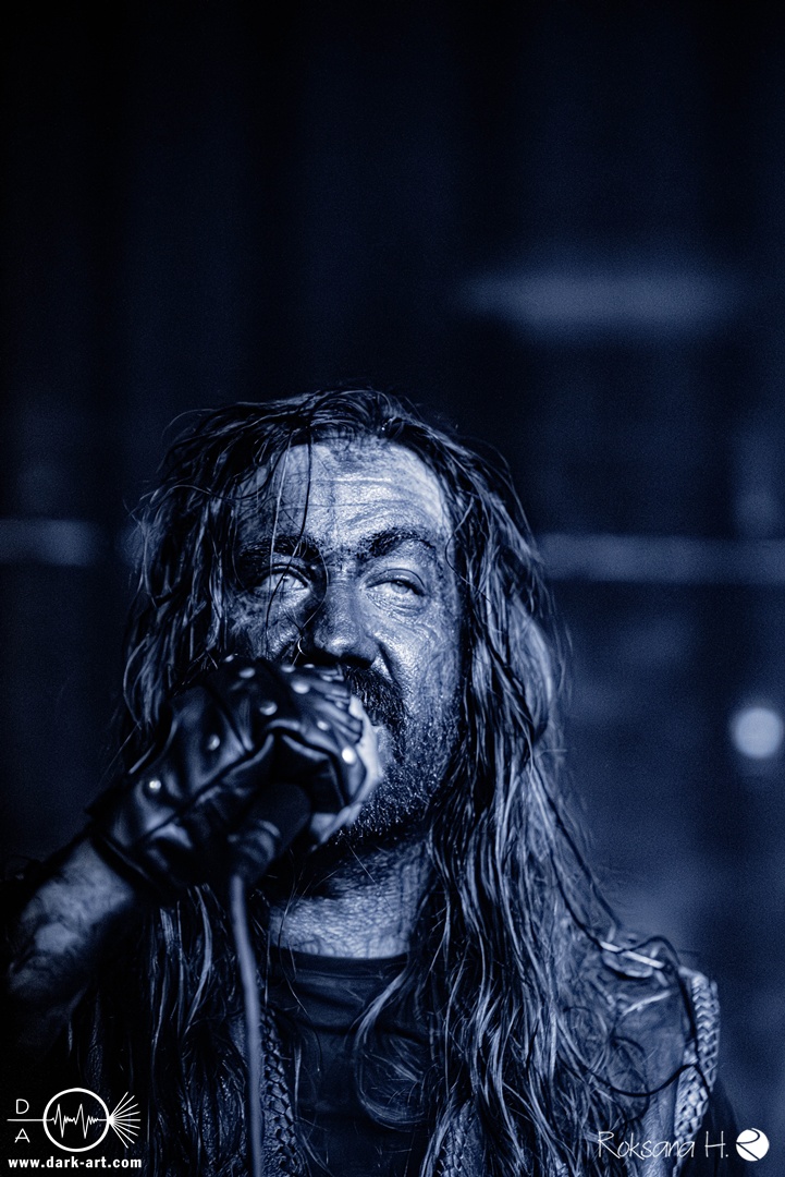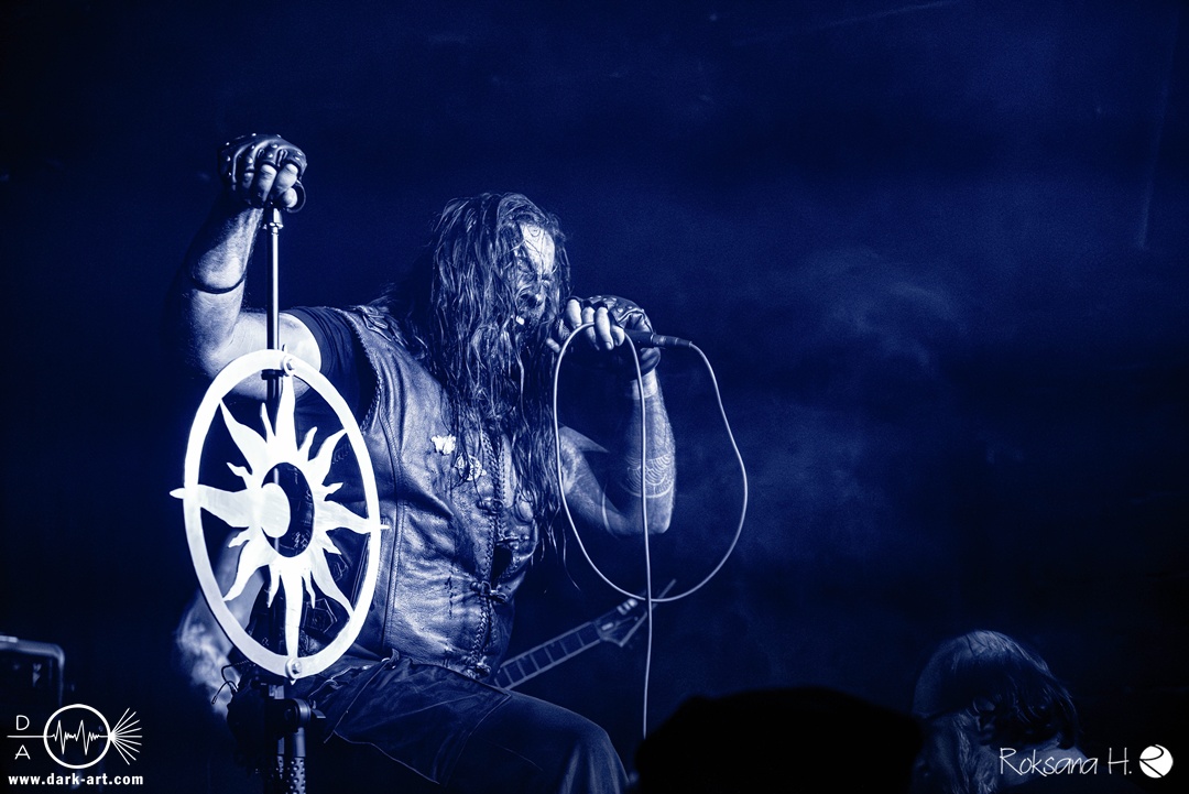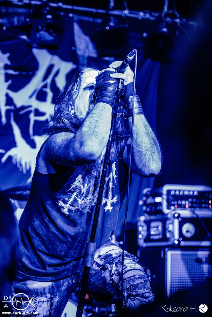 Aber kommen wir erst einmal zum Anfang,  den machten nämlich Morbus Dei. Die vierköpfige Band durfte die Black Metal Bastion eröffnen und das Publikum auf den weiteren Abend einstimmen. „Einstimmen“ ist dabei ein spannendes Wort, die Band trägt sich in erster Linie durch den intensiven Gesang vom Sänger Pain. Während es musikalisch mal doomiger, mal grooviger und mal einfach nach einem Paradebeispiel des rohen und gnadenlosen Black Metals klang, öffnete Pain mit jedem Ton ein neues Tor zur Hölle. Dabei hüllte eisblaues Licht durchgehend gleichbleibend die Bühne ein, was damit nicht nur ein entspannter Auftakt für den Lichttechniker war,  sondern für so manchen auch ein sehr eintöniges visuelles Erlebnis. Als die Band sich nach 20 Minuten vom Publikum abwandte,  das Licht gleich blieb und leise Musik im Hintergrund anlief, reagierte das Publikum teils verwirrt dreinblickend, teils startete man Gespräche, bis die Band dann wieder loslegte. Es stellte sich heraus: Die bis hierhin gehörten Klänge waren ein Intro gewesen. Als dann zum nachfolgenden Lied ein Scheinwerfer von Blau auf Lila wechselte und mitten im Song wieder zurück, wurde zumindest klar, dass die Lichtsituation nicht einem Defekt der Anlage zugrunde lag. Oder doch? Nach gut 35 Minuten war das Set zu Ende.