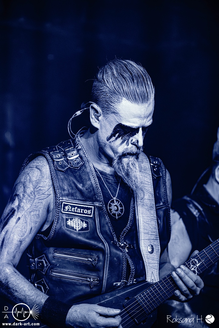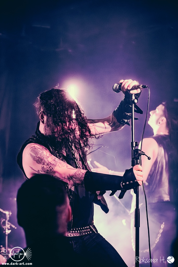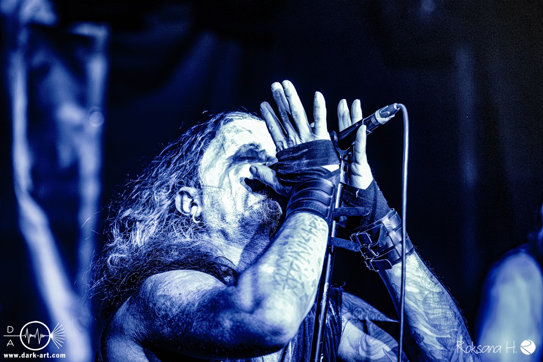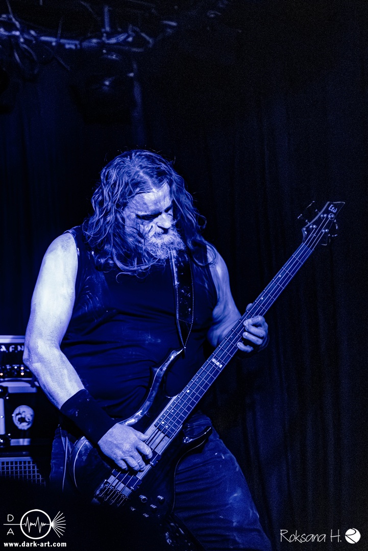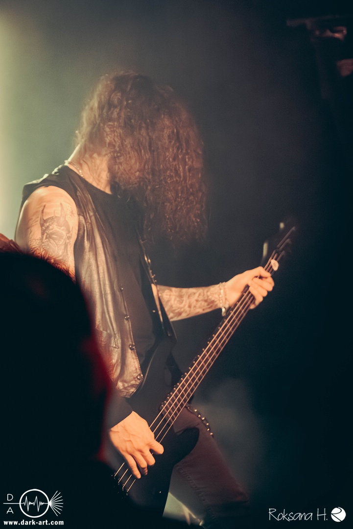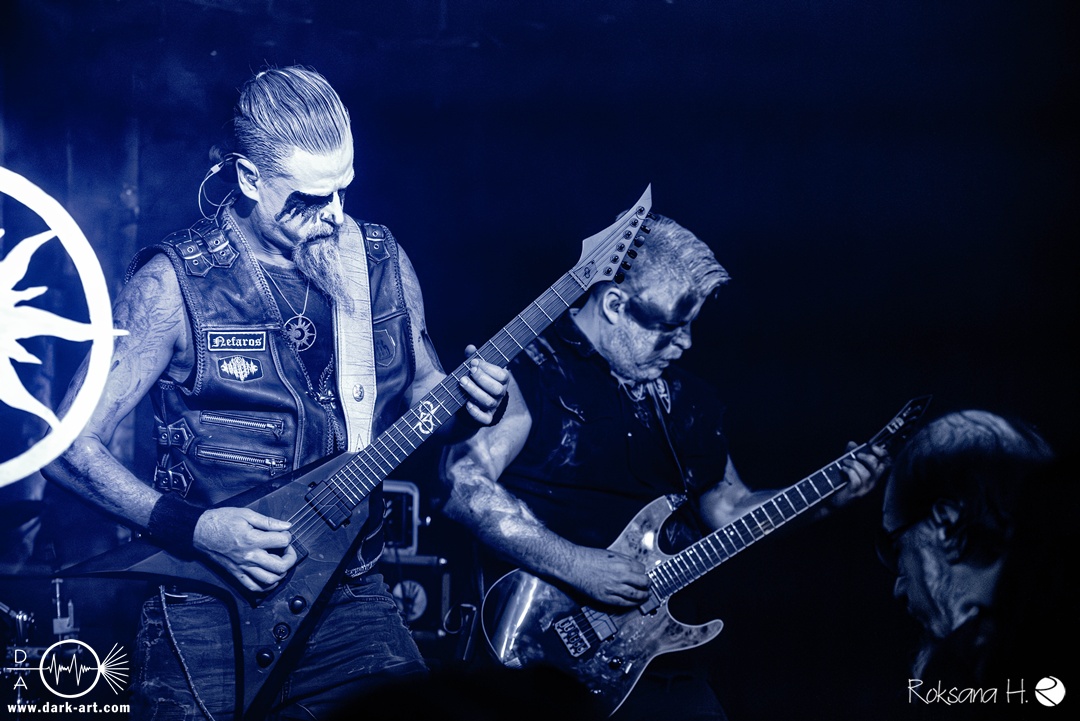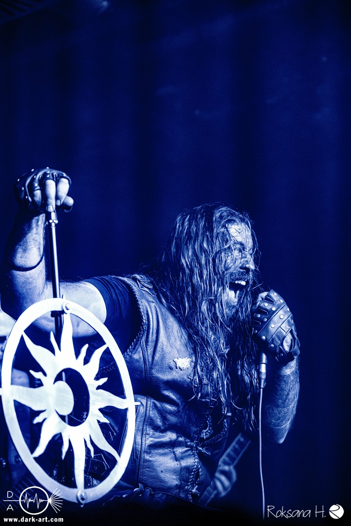 Aber kommen wir erst einmal zum Anfang,  den machten nämlich Morbus Dei. Die vierköpfige Band durfte die Black Metal Bastion eröffnen und das Publikum auf den weiteren Abend einstimmen. „Einstimmen“ ist dabei ein spannendes Wort, die Band trägt sich in erster Linie durch den intensiven Gesang vom Sänger Pain. Während es musikalisch mal doomiger, mal grooviger und mal einfach nach einem Paradebeispiel des rohen und gnadenlosen Black Metals klang, öffnete Pain mit jedem Ton ein neues Tor zur Hölle. Dabei hüllte eisblaues Licht durchgehend gleichbleibend die Bühne ein, was damit nicht nur ein entspannter Auftakt für den Lichttechniker war,  sondern für so manchen auch ein sehr eintöniges visuelles Erlebnis. Als die Band sich nach 20 Minuten vom Publikum abwandte,  das Licht gleich blieb und leise Musik im Hintergrund anlief, reagierte das Publikum teils verwirrt dreinblickend, teils startete man Gespräche, bis die Band dann wieder loslegte. Es stellte sich heraus: Die bis hierhin gehörten Klänge waren ein Intro gewesen. Als dann zum nachfolgenden Lied ein Scheinwerfer von Blau auf Lila wechselte und mitten im Song wieder zurück, wurde zumindest klar, dass die Lichtsituation nicht einem Defekt der Anlage zugrunde lag. Oder doch? Nach gut 35 Minuten war das Set zu Ende.