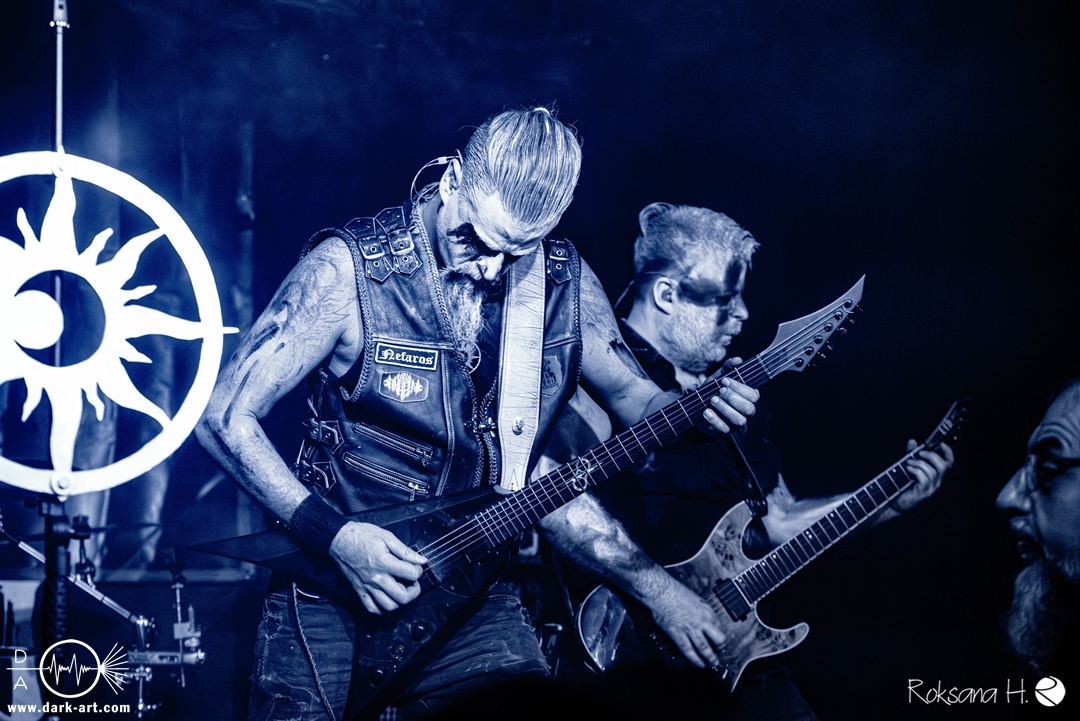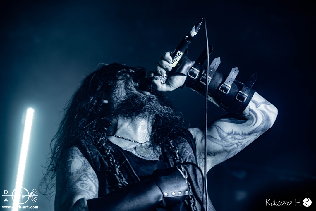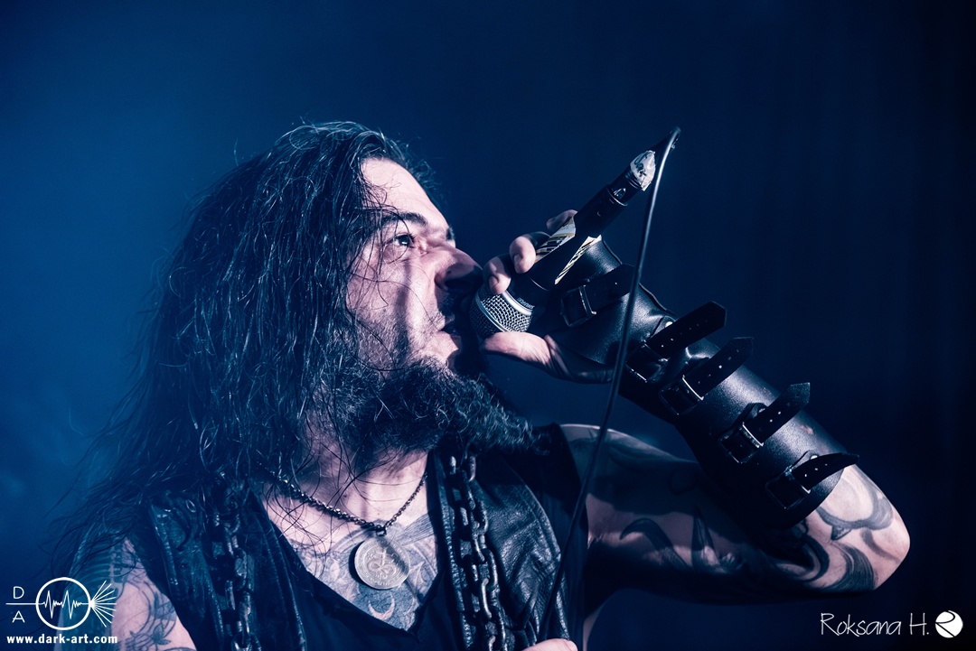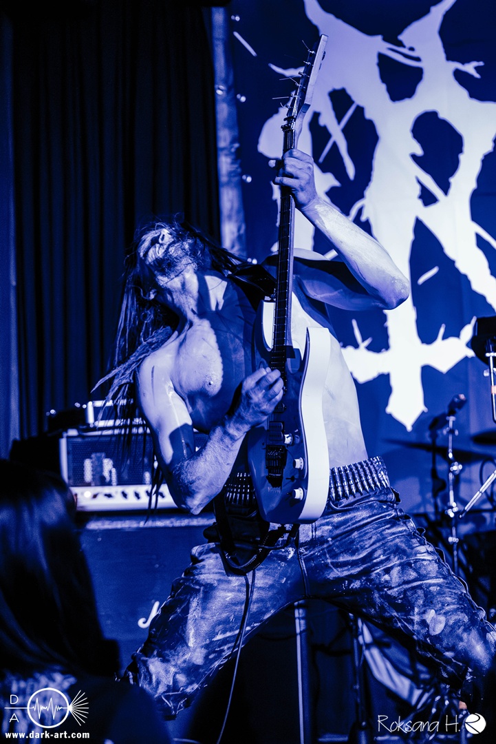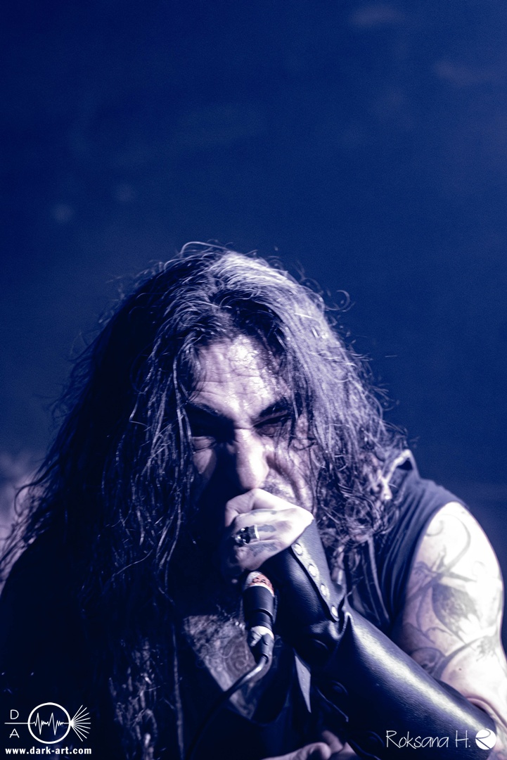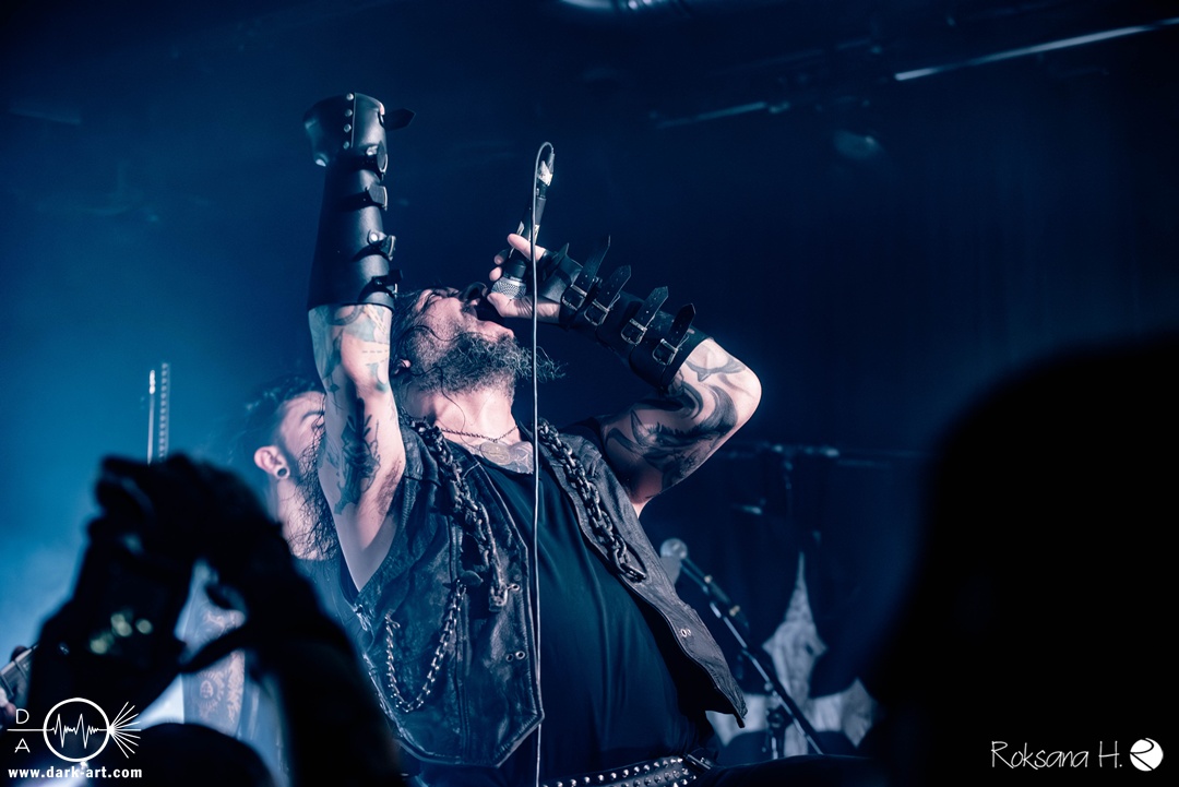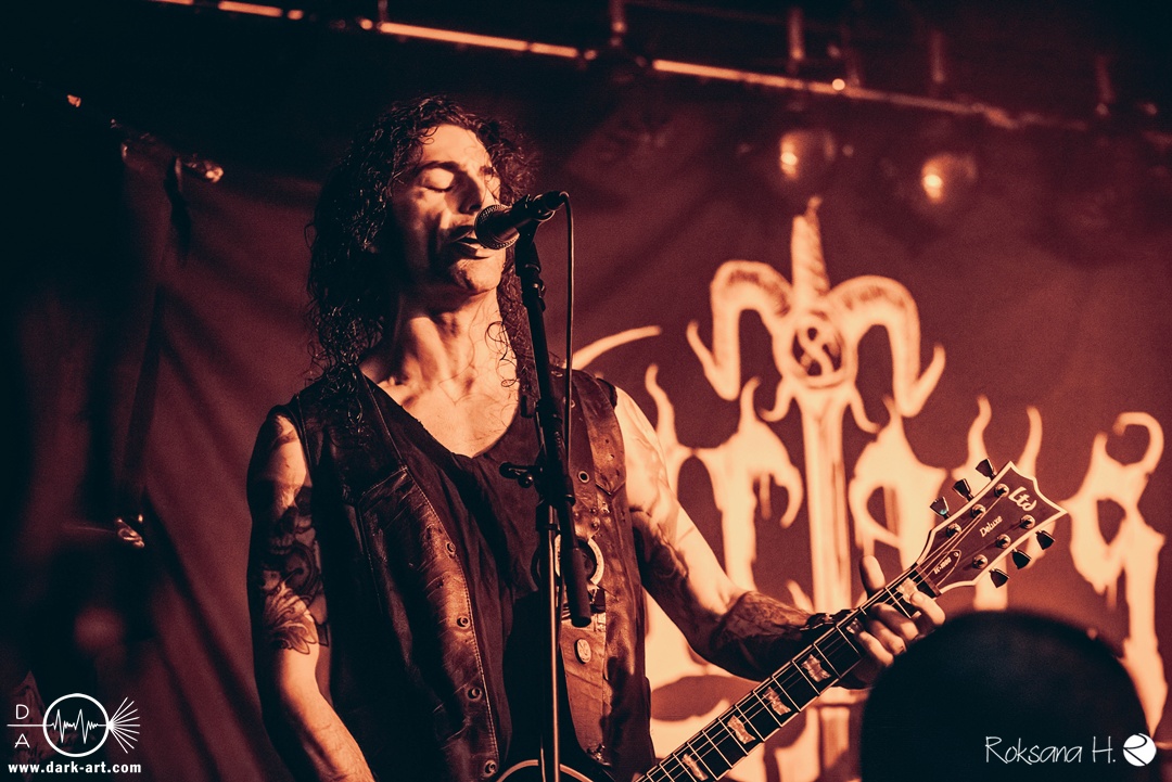 Aber kommen wir erst einmal zum Anfang,  den machten nämlich Morbus Dei. Die vierköpfige Band durfte die Black Metal Bastion eröffnen und das Publikum auf den weiteren Abend einstimmen. „Einstimmen“ ist dabei ein spannendes Wort, die Band trägt sich in erster Linie durch den intensiven Gesang vom Sänger Pain. Während es musikalisch mal doomiger, mal grooviger und mal einfach nach einem Paradebeispiel des rohen und gnadenlosen Black Metals klang, öffnete Pain mit jedem Ton ein neues Tor zur Hölle. Dabei hüllte eisblaues Licht durchgehend gleichbleibend die Bühne ein, was damit nicht nur ein entspannter Auftakt für den Lichttechniker war,  sondern für so manchen auch ein sehr eintöniges visuelles Erlebnis. Als die Band sich nach 20 Minuten vom Publikum abwandte,  das Licht gleich blieb und leise Musik im Hintergrund anlief, reagierte das Publikum teils verwirrt dreinblickend, teils startete man Gespräche, bis die Band dann wieder loslegte. Es stellte sich heraus: Die bis hierhin gehörten Klänge waren ein Intro gewesen. Als dann zum nachfolgenden Lied ein Scheinwerfer von Blau auf Lila wechselte und mitten im Song wieder zurück, wurde zumindest klar, dass die Lichtsituation nicht einem Defekt der Anlage zugrunde lag. Oder doch? Nach gut 35 Minuten war das Set zu Ende.