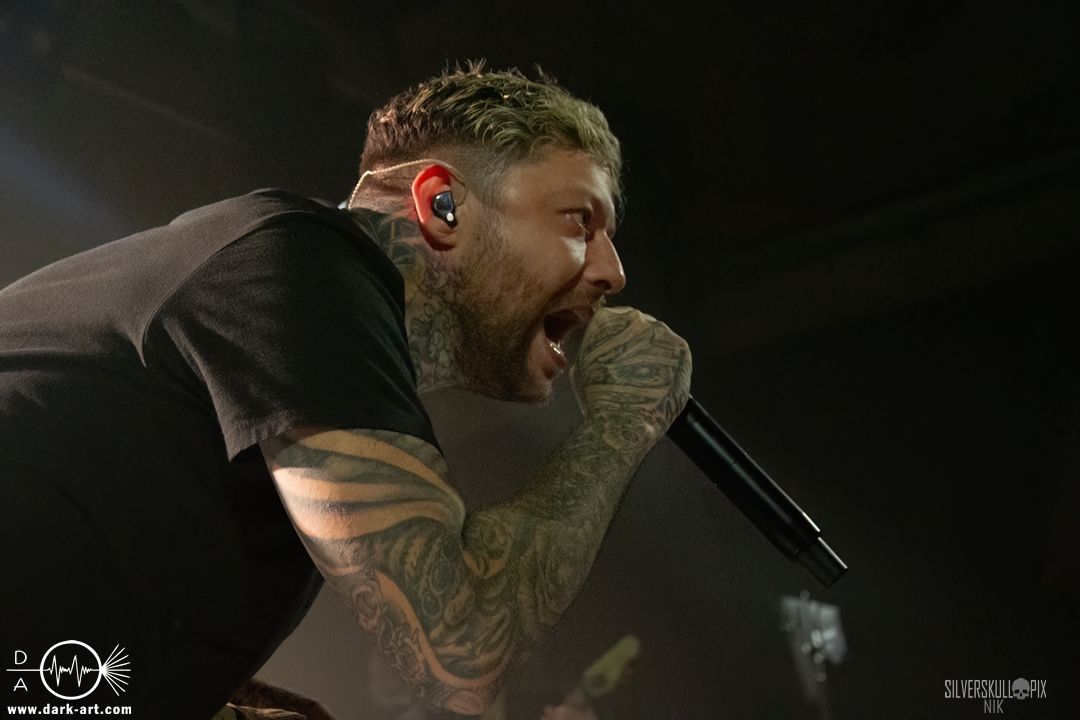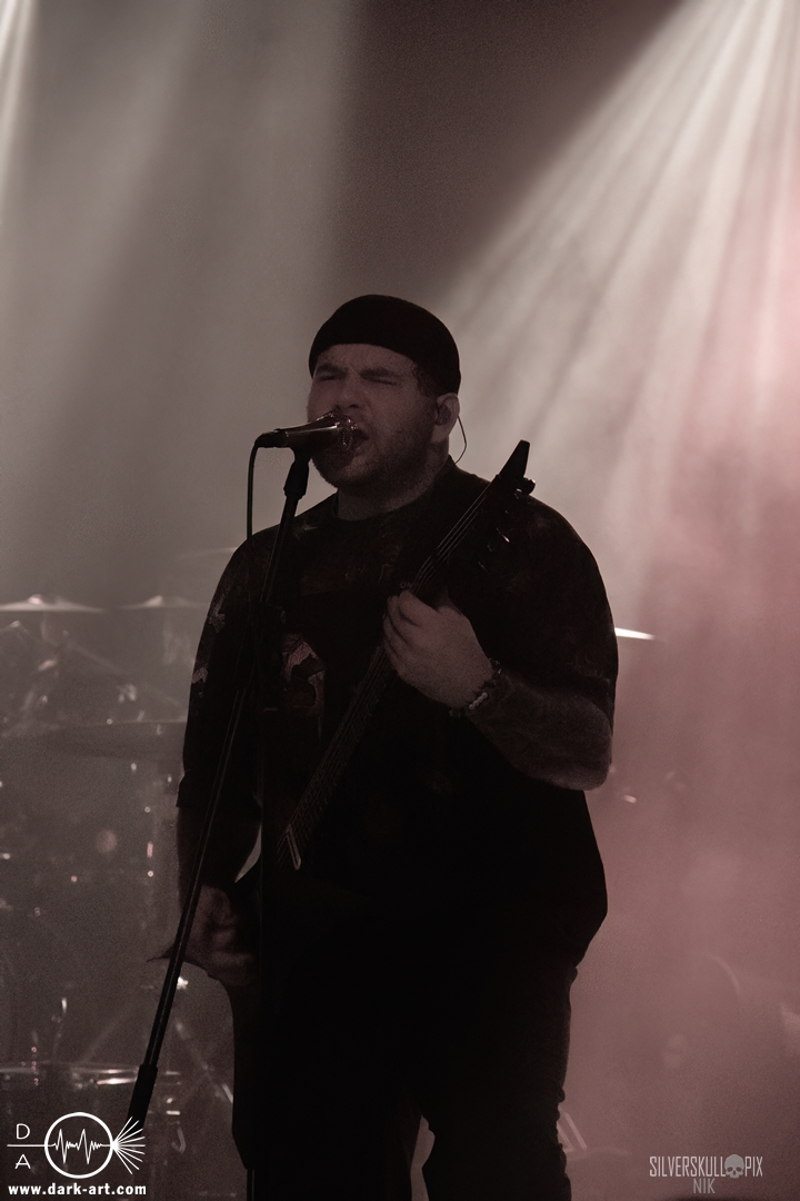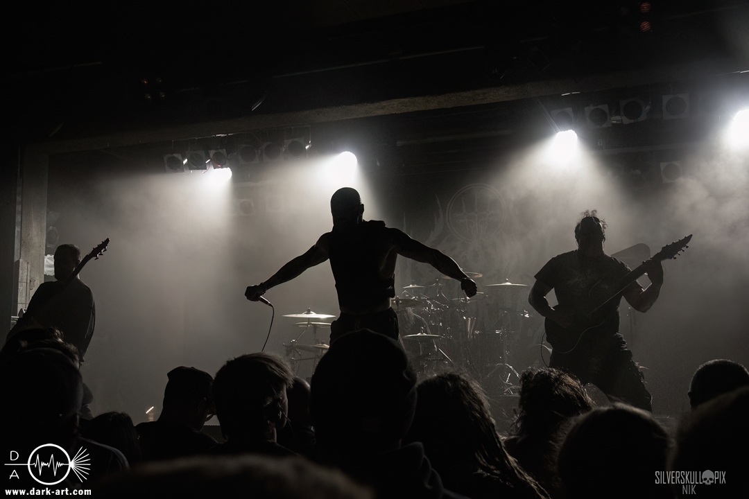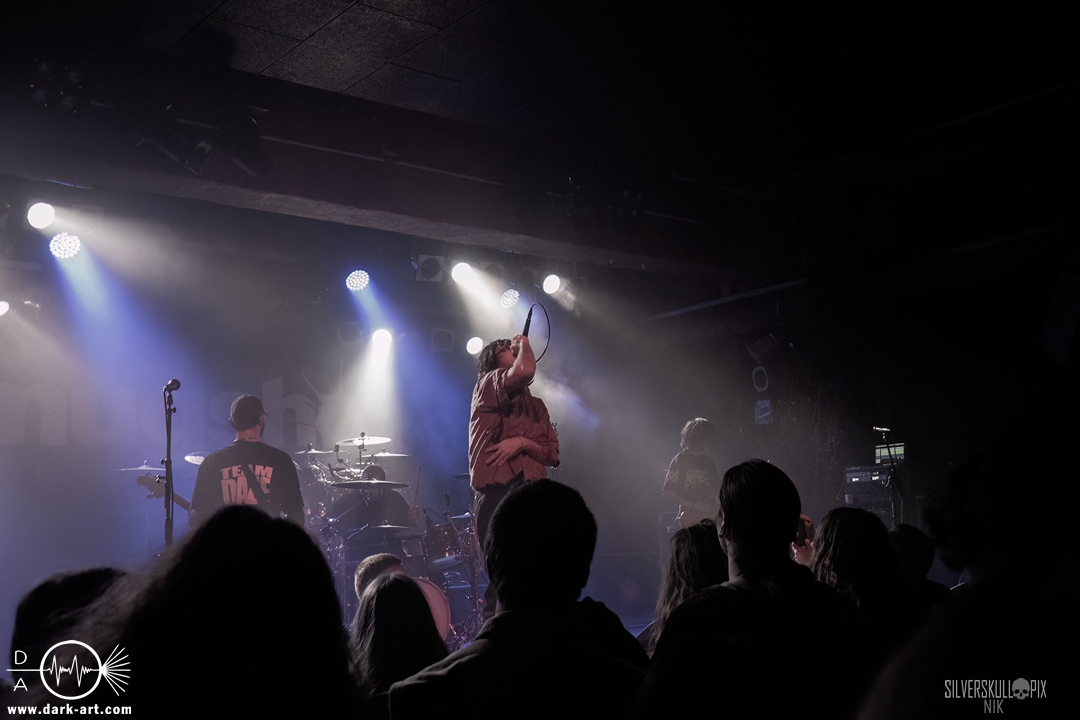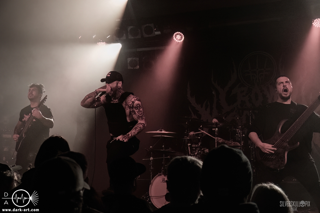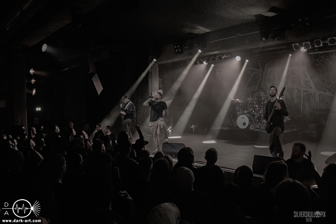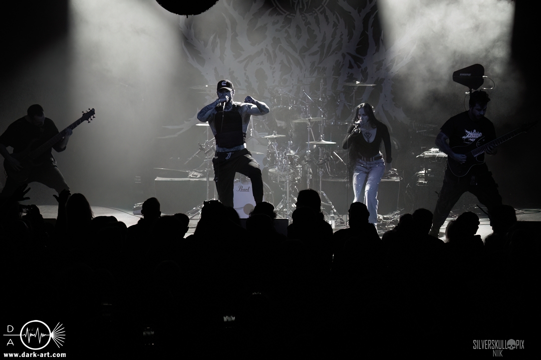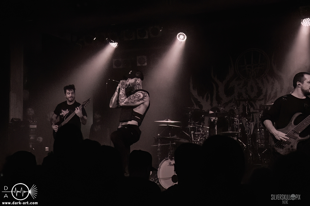 Eröffnet wurde das fröhliche Weihnachtssingen von Crown Magnetar aus Colorado, und der Vierer hatte direkt so richtig Bock. Schon zum zweiten Song, Full Spectrum Hatred wurden die Crowdsurfer animiert und auch der Pit kam direkt in Fahrt. Natürlich durfte auch ihre neueste Single Desecrate Infinte nicht fehlen. Musikalisch bekamen wir unglaublich fiesen Deathcore serviert, ein Downtempo-Breakdown jagte den nächsten. Frontman Dan Tucker gab bestialische Geräusche von sich und performte ein Feature mit seiner Ehefrau Yasmine, die selbst Sängerin der Band Face Yourself ist und heizte das Publikum immer weiter an. Wir sahen schon früh am Abend die erste Wall of Death und auch immer mehr Crowdsurfer fanden ihren Weg nach vorn. Zum abschließenden Black Lotus drehte auch ein ordentlicher Circle Pit seine Runden. Alles in allem machten Crown Magnetar wirklich sehr viel richtig und waren ein grandioser Opener. Dan lobte zum Schluss das Publikum als die beste Crowd der Tour.