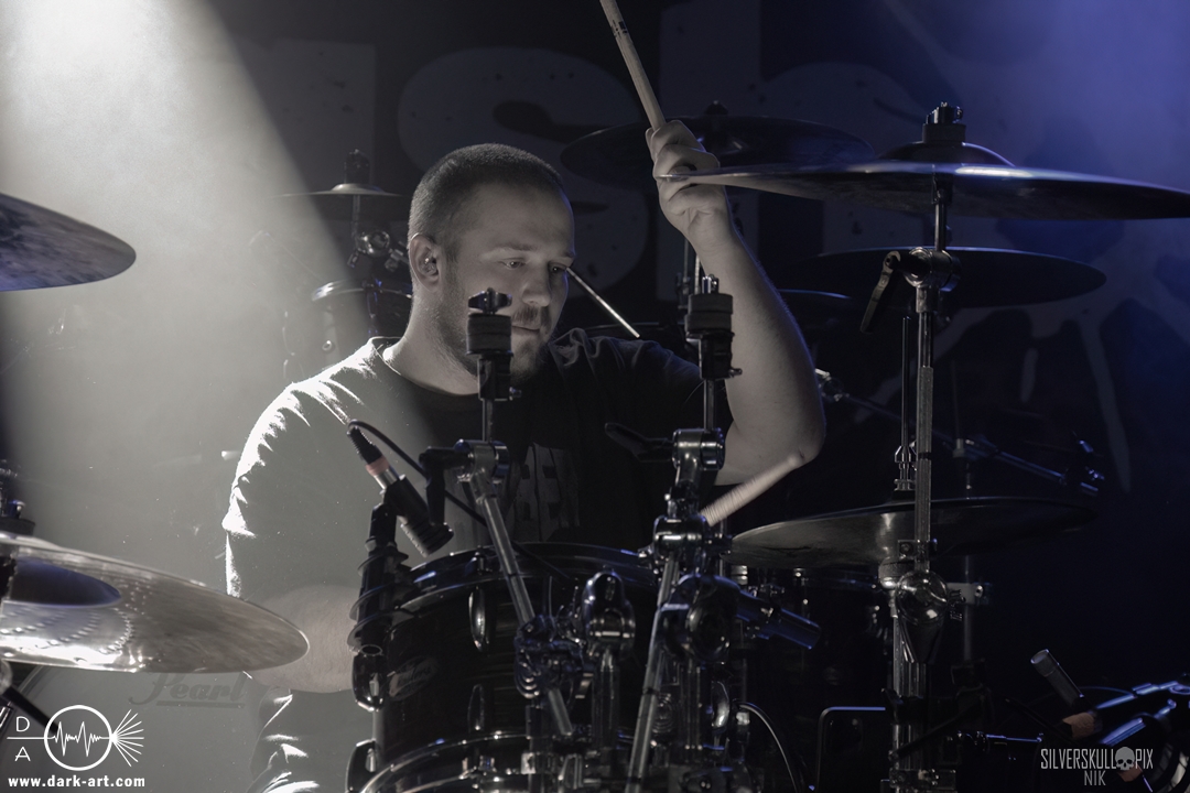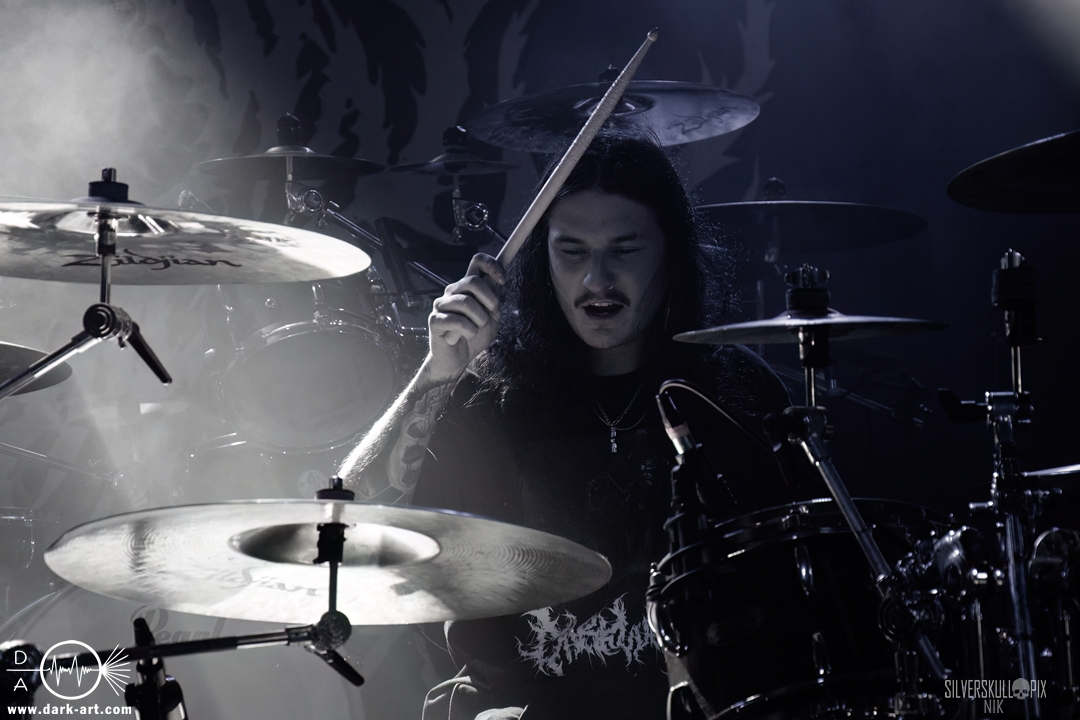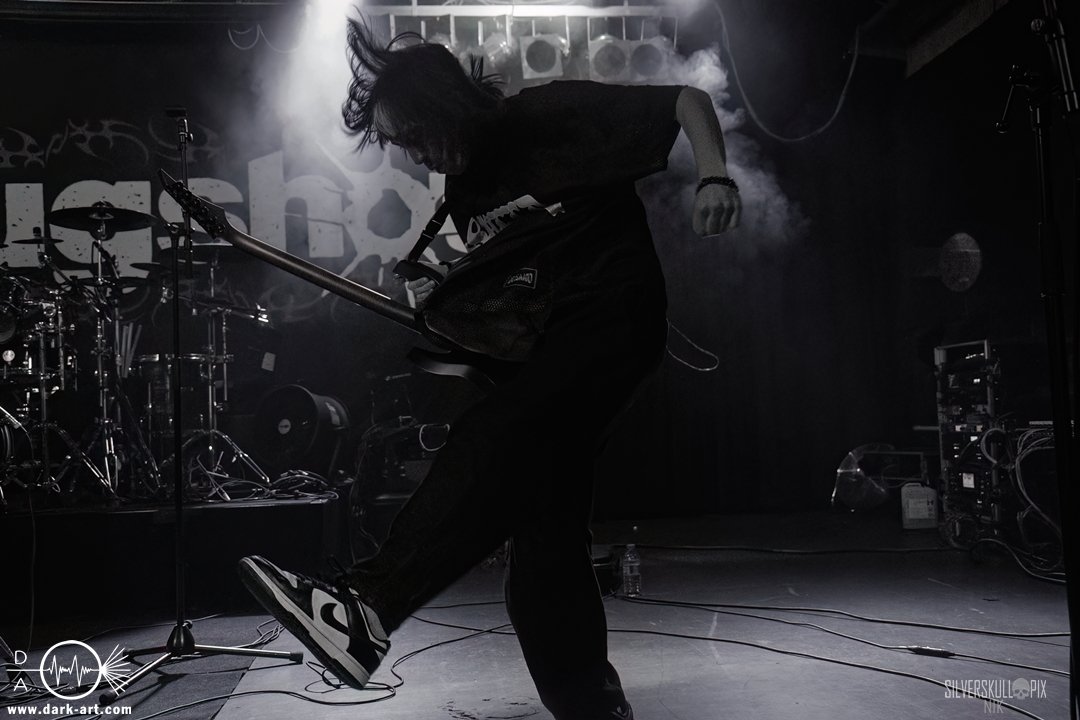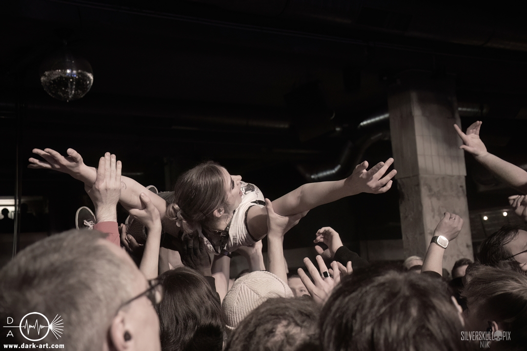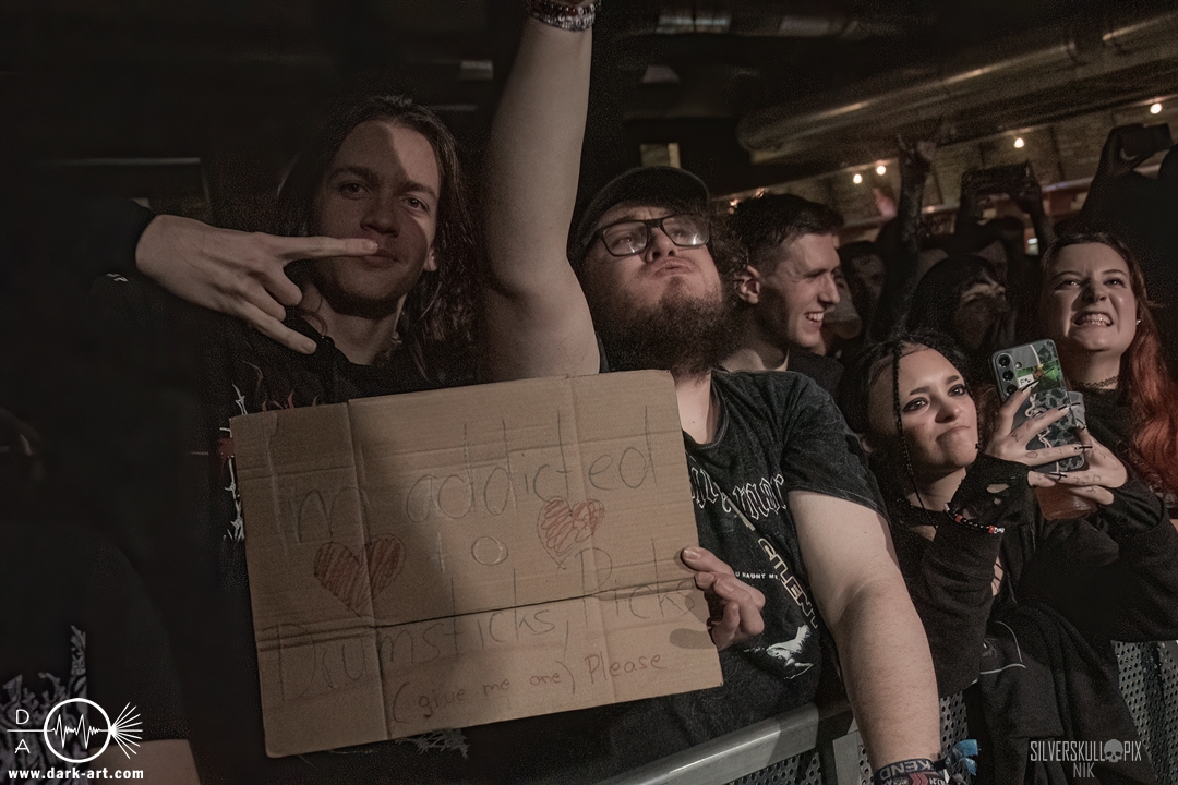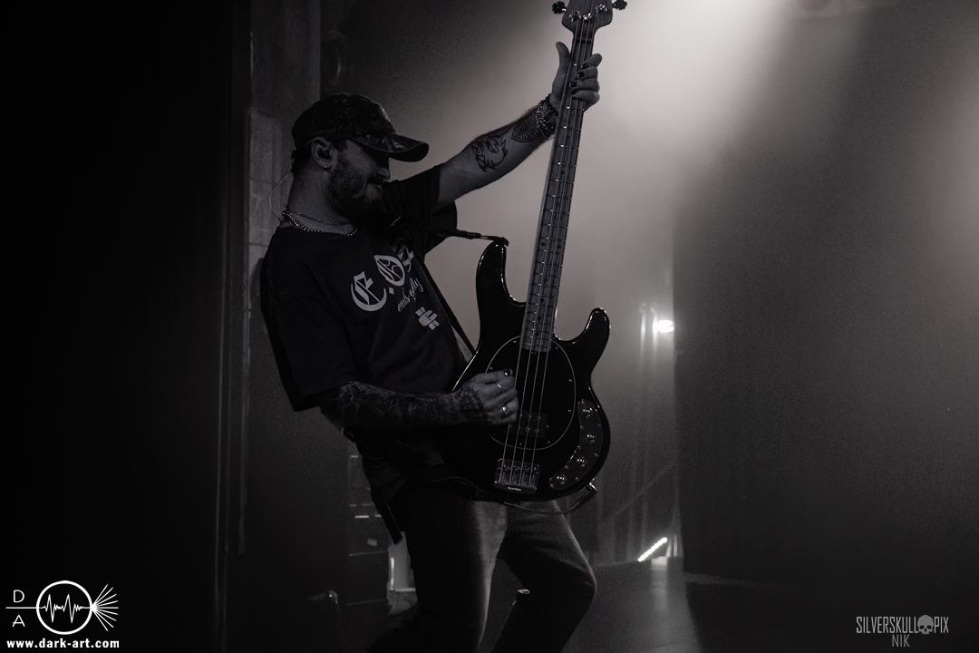 Diesen Abend der Besinnlichkeit krönten dann Chelsea Grin, die verstärkt auf ältere Songs setzten. Schon das einleitende Recreant war ein großartiger Start ins Set, und auch im Anschluss bestach die Band durch eine große Menge an Sympathie. Was wäre ein Tourfinale ohne eine Menge Highlights? Zu Playing With Fire bekam Tom Barber Verstärkung von Ringo, der zuvor mit Mugshot auf der Bühne stand. Crown Magnetar’s Dan Tucker durfte My Damnation featuren und nur einen Song später schnappten sie sich Bassist Kyle von Signs of the Swarm. Vor der Bühne war nochmals eine Menge geboten, Wall of Death und Crowdsurfer wechselten sich gekonnt ab, hier kam jeder erneut auf seine Kosten. Stephen Rutihauser glänzte mit einer technischen Raffinesse an der Gitarre und auch David Flinn spielte den Bass wie gewohnt ausdrucksstark. An den Drums gab auch Josh Miller ordentlich Gas, der 2024 als Letzter zur aktuellen Besetzung stieß. Doch natürlich durften auch neuere Songs wie Suffer in Hell Suffer in Heaven oder Sing to the Grave nicht fehlen. Das große Finale stieg dann mit dem Song Hostage, für den Dave von Signs of the Swarm auf die Bühne kam und gemeinsam mit Tom und Co. die Bühne abriss. Im Hintergrund kamen weitere Mitglieder der Band dazu, die kurzerhand das Schlagzeug auseinanderbauten und kräftig mittrommelten. So wurde das Ganze zu einem absolut würdigen Abschluss dieser Tour. Nach der Show warfen die Musiker den kompletten Restbestand an Drumsticks in die Menge. Im Anschluss kam Tom Barber in den Graben runter und nahm sich viel Zeit für Gespräche und Fotowünsche der Fans. Ein sehr sympathisches Ende eines gelungenen Abends.