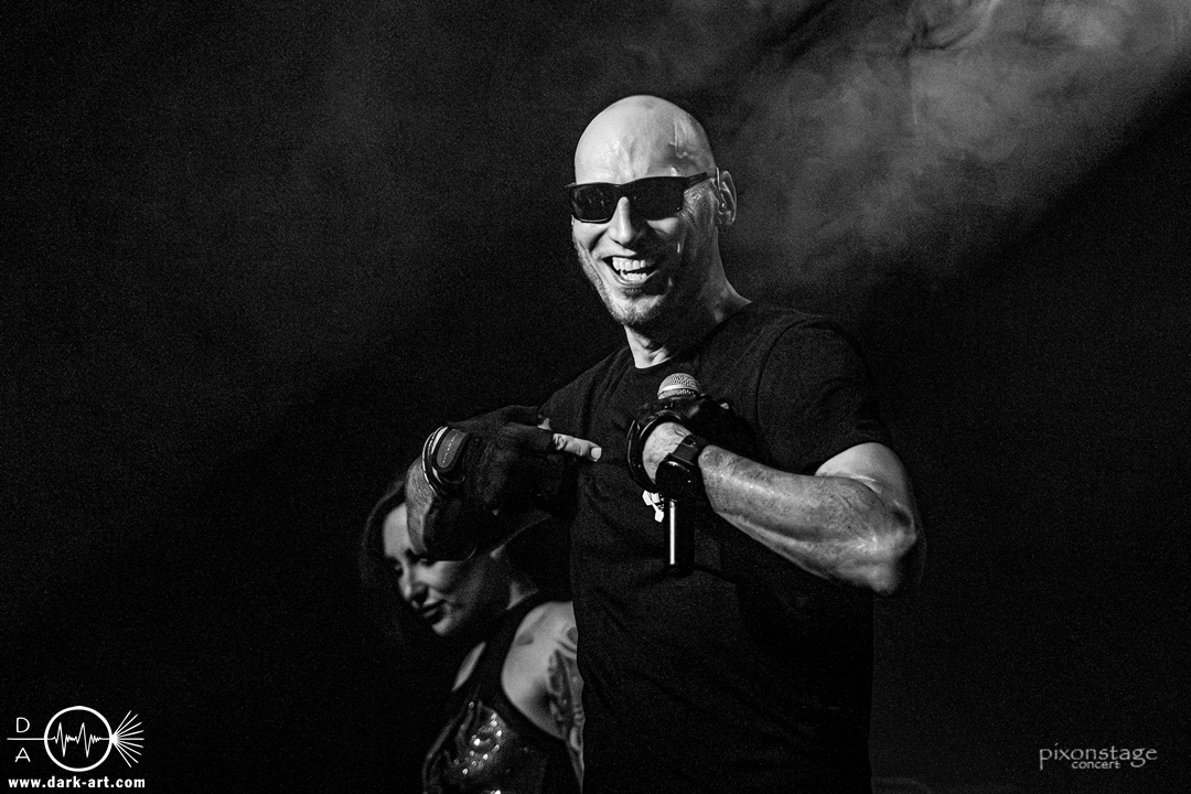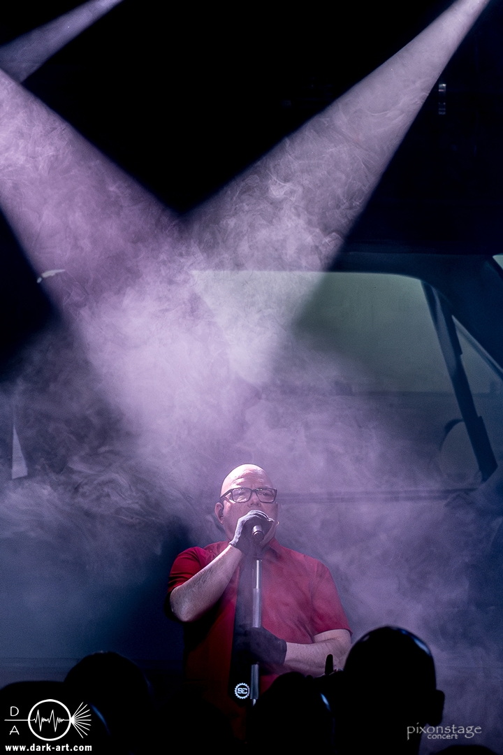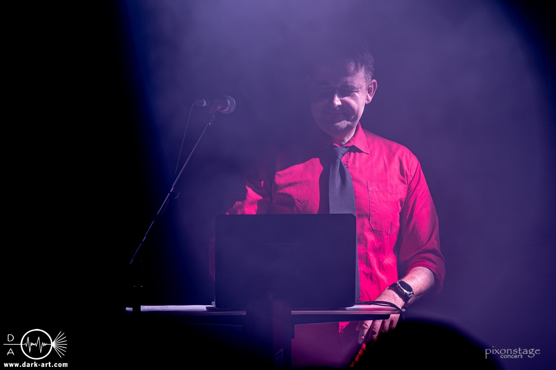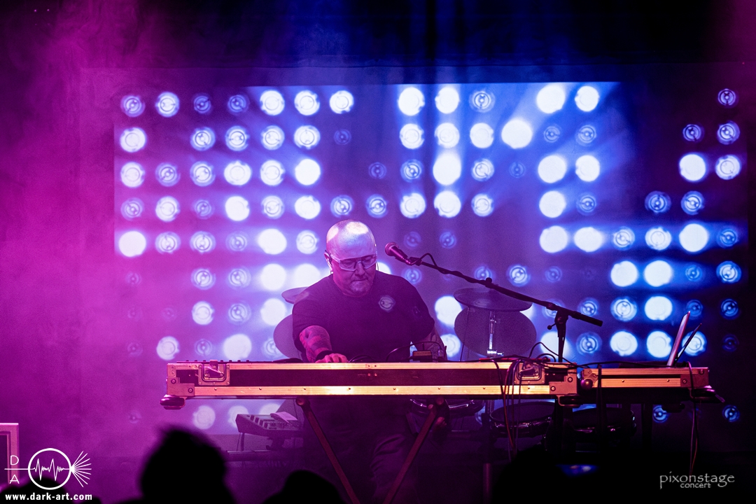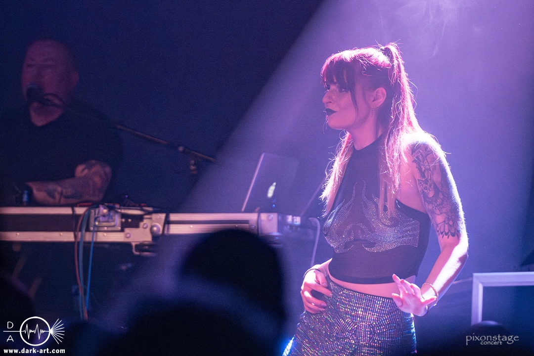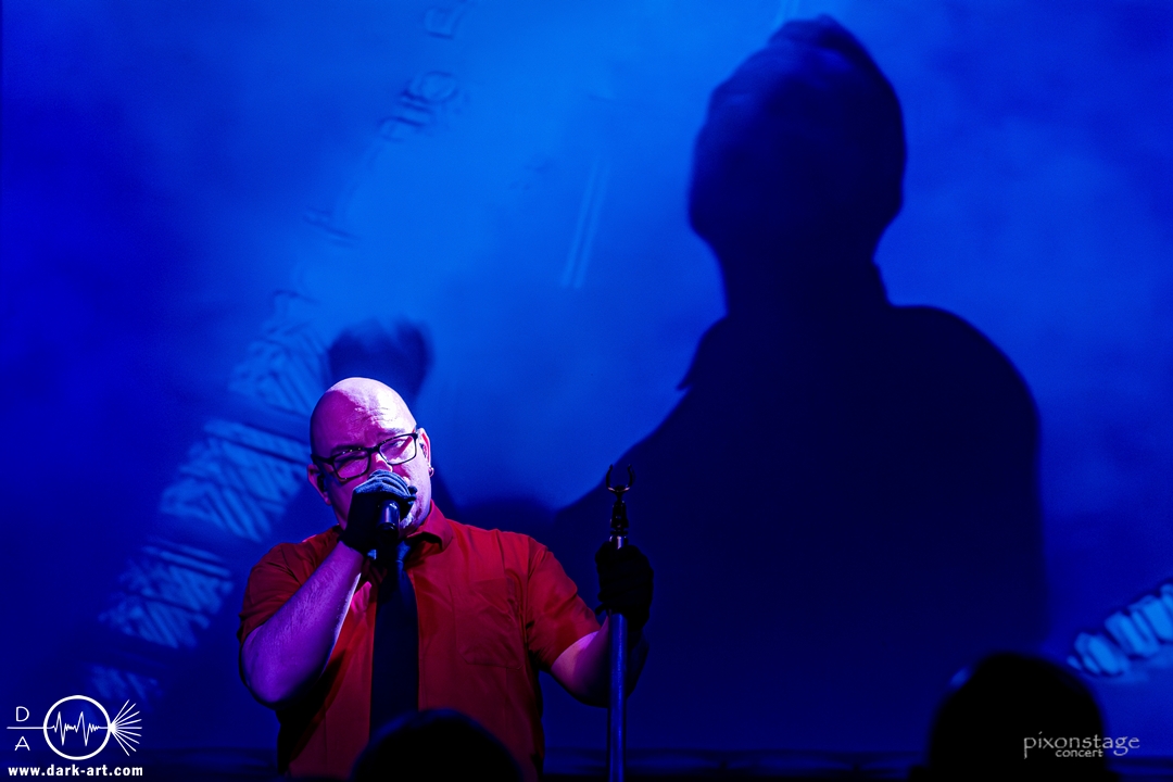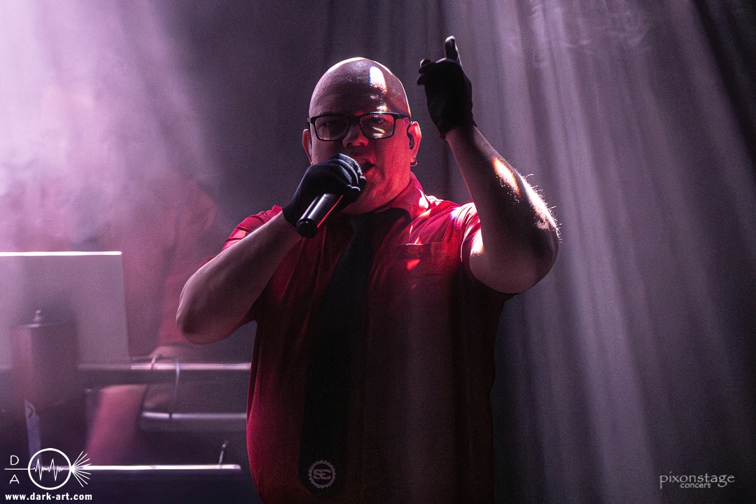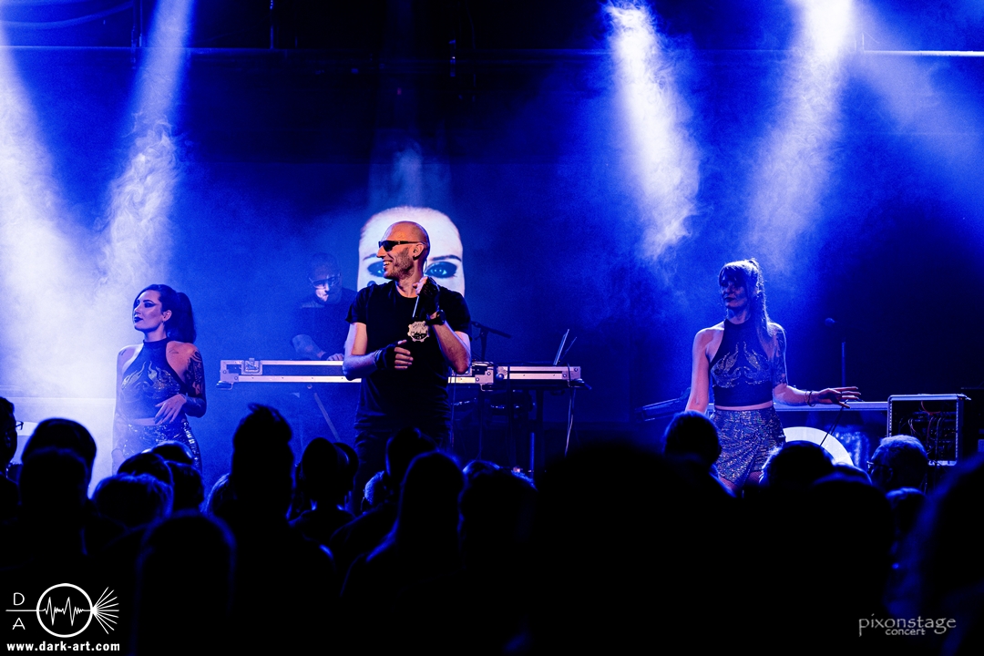 Die Synthie-Pop Band aus Chemnitz ist seit 1996 unter dem Namen Accessory unterwegs. Zuerst betrat Mike flankiert von zwei Flaggen schwingenden Tänzerinnen die Bühne und ließ das Intro erklingen. Nun kam auch Sänger Dirk dazu, mit der Frage „Seid ihr alle da, macht die Hände hoch“ legte er los und tanzte über die Bühne. Er begrüßte das Publikum „Einen wunderschönen guten Abend Frankfurt, ihr seht wunderschön aus, schön, dass ihr da seid, uns gibt es fast 30 Jahre“. Weiter ging es mit Tanz Richtung Vorwärts, was man sich im Saal nicht zweimal sagen ließ. Obwohl Das Bett ausverkauft war, fanden die Anwesenden dennoch genug Platz dafür. Es folgte ein Mix aus drei Jahrzehnten Musikgeschichte von Accessory, wie War of Emotions, der lange im Feindflug Remix gespielt wurde, aber jetzt im neuen Gewand daher kam. Die Stimmung heizte sich auf und versprach einen schweißtreibenden Abend. Zu No Man Covers lief im Hintergrund das Video des Songs mit, immer wieder wurde die Menge aufgefordert, die Hände zu heben und mitzuklatschen. Die Tänzerinnen kamen immer mal wieder auf die Bühne und Dirk schwang selbst eine Flagge über die Köpfe der ersten Reihen. Ältere und neuere Stücke wechselten sich ab, so kam der Klassiker Future World, aber auch die letzte Auskopplung von 2024 Dark Dance of Life, mit der Ankündigung, dass nächstes Jahr etwas Neues rauskommt. Während des Lieblings-Live-Songs der Band Outrun the Gun wurden schwarze Ballons in die Menge geworfen, was natürlich von der tanzenden Meute begeistert aufgenommen wurde. Mit einem „So geil, hier gewesen zu sein, vielen Dank“ machten sie Platz für die nächste Band und sorgten für eine kurze Verschnaufpause.