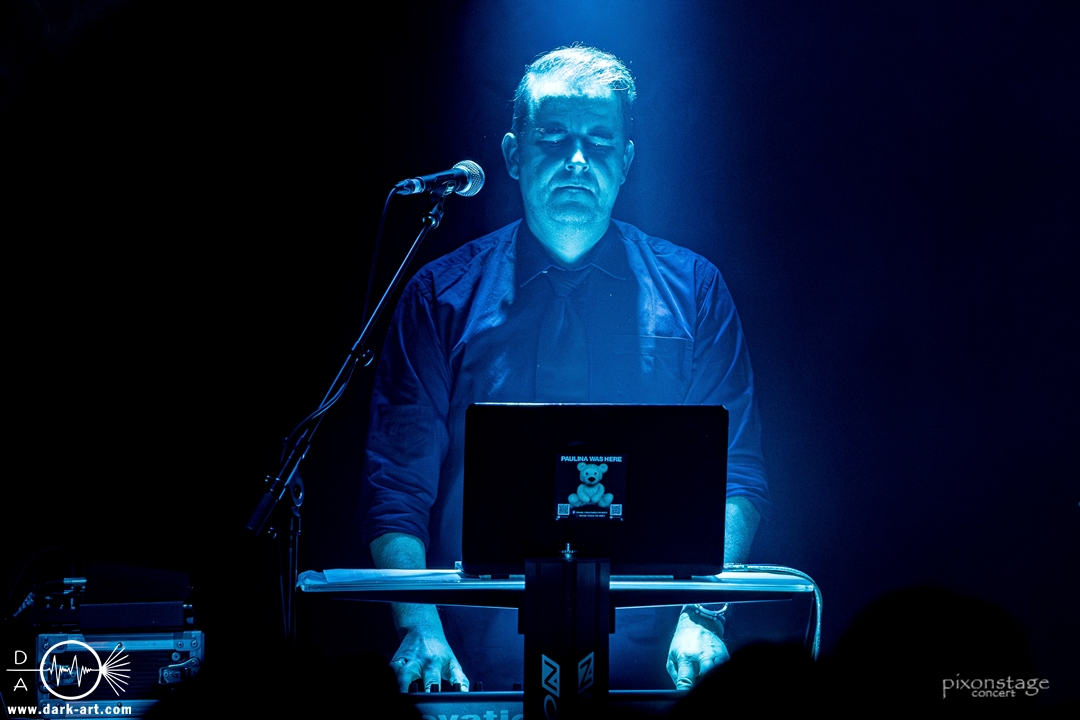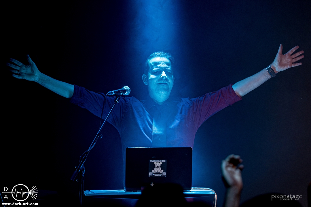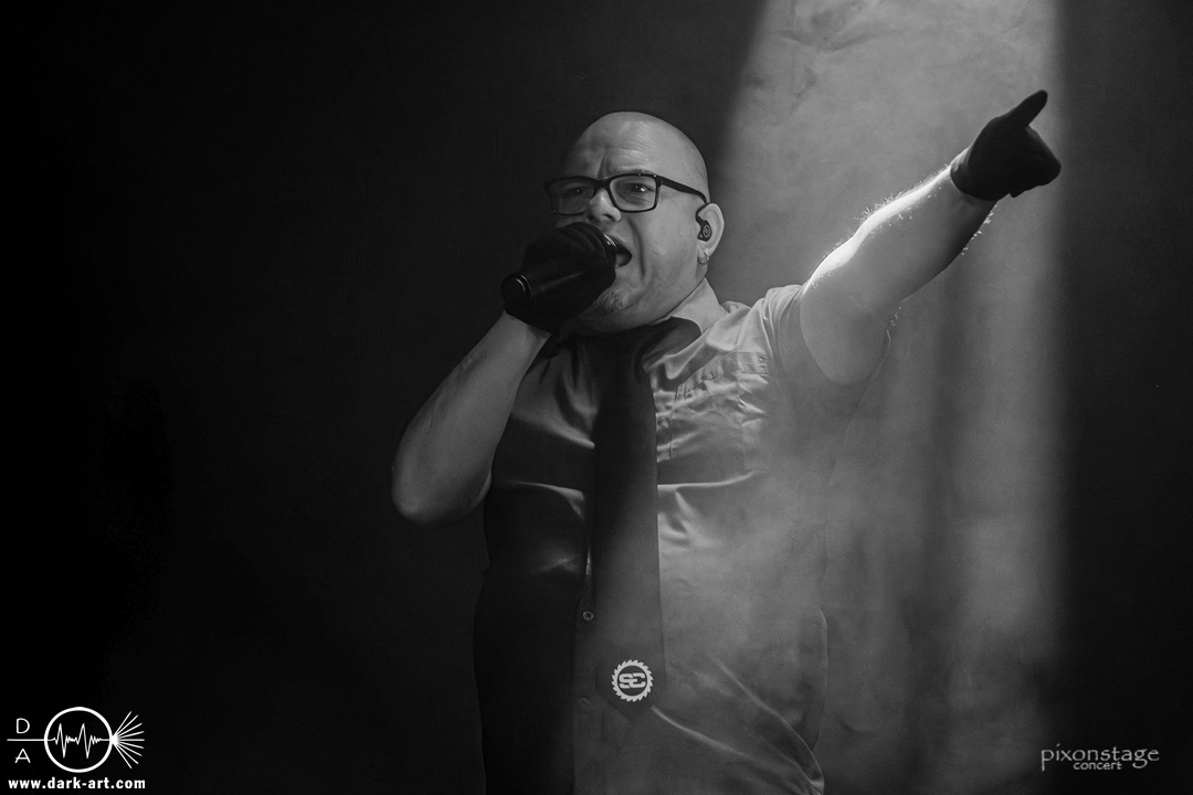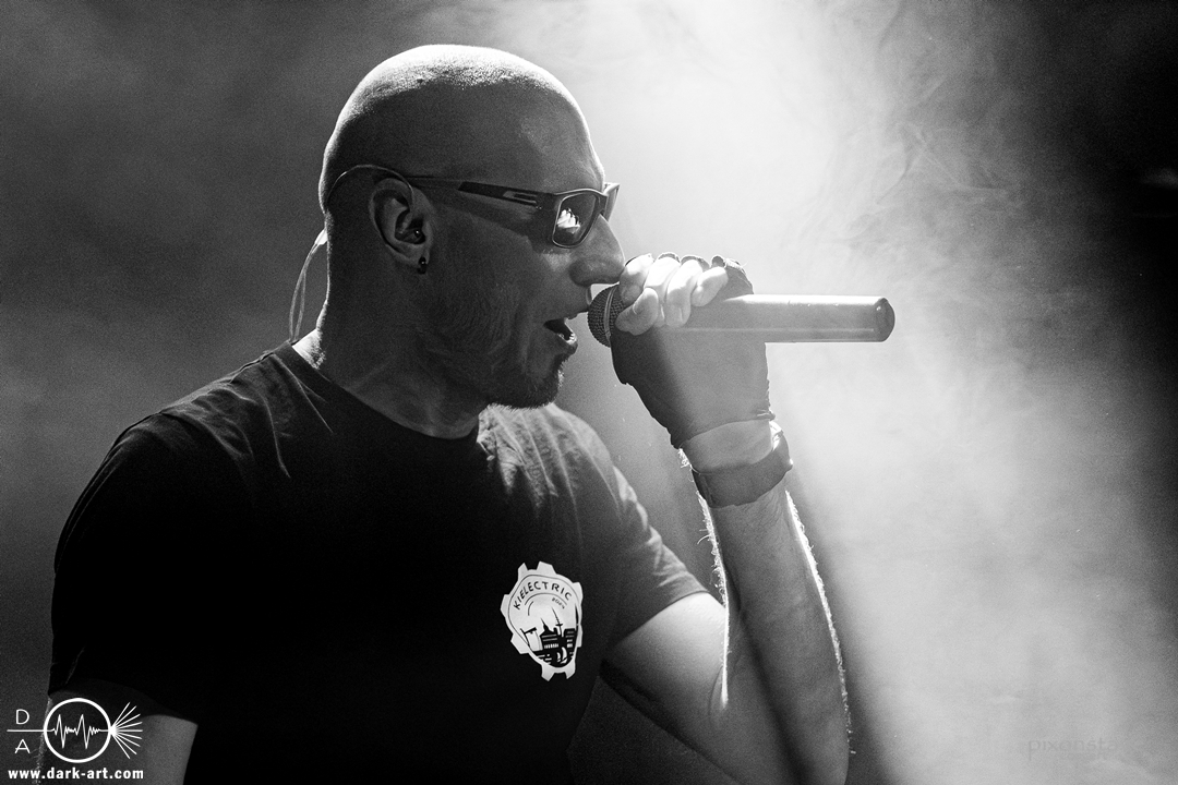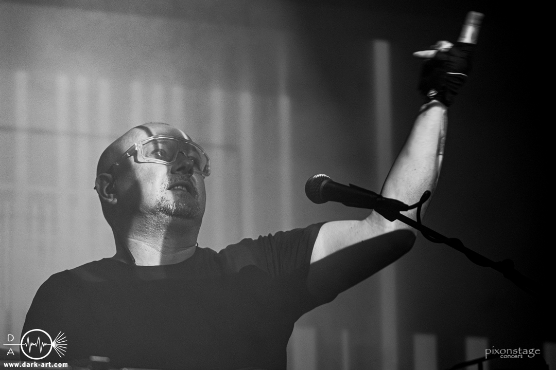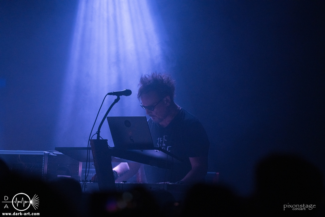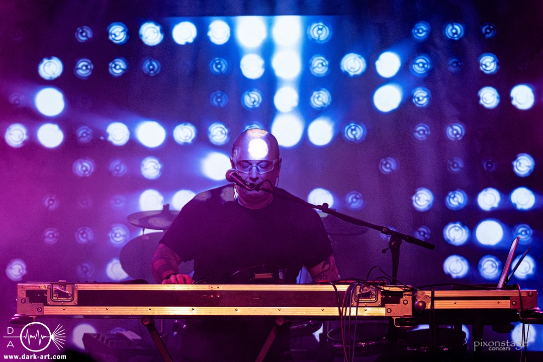 Die Synthie-Pop Band aus Chemnitz ist seit 1996 unter dem Namen Accessory unterwegs. Zuerst betrat Mike flankiert von zwei Flaggen schwingenden Tänzerinnen die Bühne und ließ das Intro erklingen. Nun kam auch Sänger Dirk dazu, mit der Frage „Seid ihr alle da, macht die Hände hoch“ legte er los und tanzte über die Bühne. Er begrüßte das Publikum „Einen wunderschönen guten Abend Frankfurt, ihr seht wunderschön aus, schön, dass ihr da seid, uns gibt es fast 30 Jahre“. Weiter ging es mit Tanz Richtung Vorwärts, was man sich im Saal nicht zweimal sagen ließ. Obwohl Das Bett ausverkauft war, fanden die Anwesenden dennoch genug Platz dafür. Es folgte ein Mix aus drei Jahrzehnten Musikgeschichte von Accessory, wie War of Emotions, der lange im Feindflug Remix gespielt wurde, aber jetzt im neuen Gewand daher kam. Die Stimmung heizte sich auf und versprach einen schweißtreibenden Abend. Zu No Man Covers lief im Hintergrund das Video des Songs mit, immer wieder wurde die Menge aufgefordert, die Hände zu heben und mitzuklatschen. Die Tänzerinnen kamen immer mal wieder auf die Bühne und Dirk schwang selbst eine Flagge über die Köpfe der ersten Reihen. Ältere und neuere Stücke wechselten sich ab, so kam der Klassiker Future World, aber auch die letzte Auskopplung von 2024 Dark Dance of Life, mit der Ankündigung, dass nächstes Jahr etwas Neues rauskommt. Während des Lieblings-Live-Songs der Band Outrun the Gun wurden schwarze Ballons in die Menge geworfen, was natürlich von der tanzenden Meute begeistert aufgenommen wurde. Mit einem „So geil, hier gewesen zu sein, vielen Dank“ machten sie Platz für die nächste Band und sorgten für eine kurze Verschnaufpause.