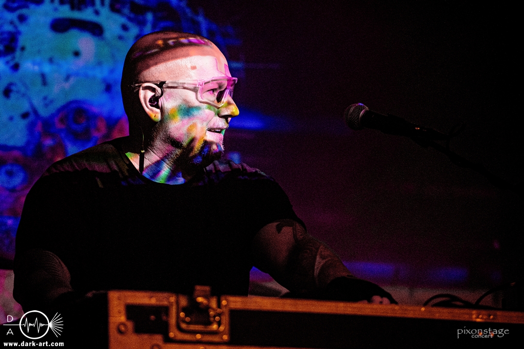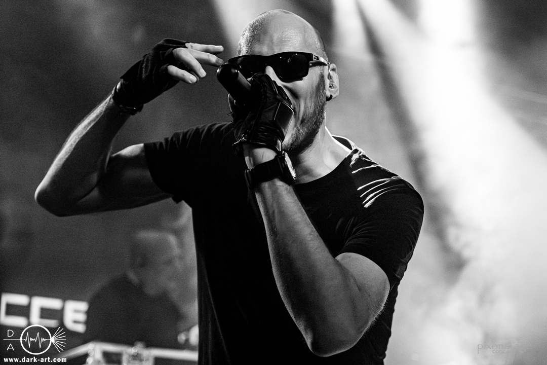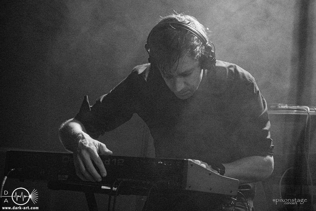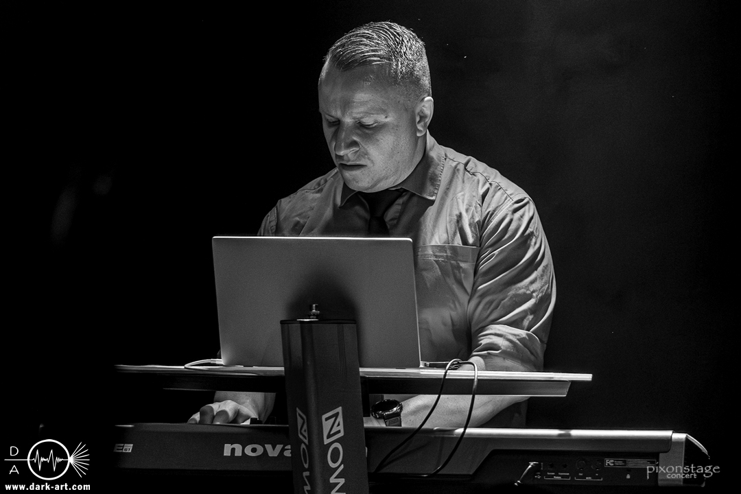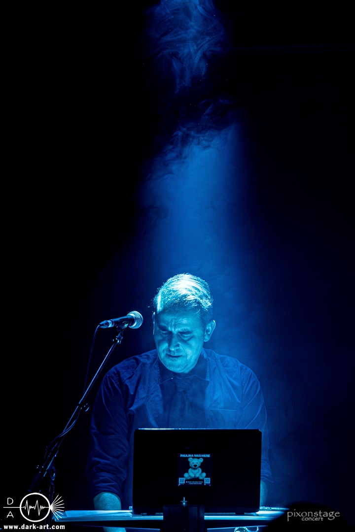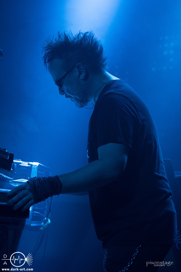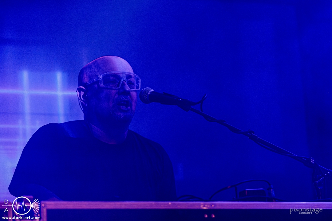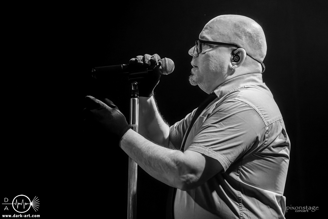 Die Synthie-Pop Band aus Chemnitz ist seit 1996 unter dem Namen Accessory unterwegs. Zuerst betrat Mike flankiert von zwei Flaggen schwingenden Tänzerinnen die Bühne und ließ das Intro erklingen. Nun kam auch Sänger Dirk dazu, mit der Frage „Seid ihr alle da, macht die Hände hoch“ legte er los und tanzte über die Bühne. Er begrüßte das Publikum „Einen wunderschönen guten Abend Frankfurt, ihr seht wunderschön aus, schön, dass ihr da seid, uns gibt es fast 30 Jahre“. Weiter ging es mit Tanz Richtung Vorwärts, was man sich im Saal nicht zweimal sagen ließ. Obwohl Das Bett ausverkauft war, fanden die Anwesenden dennoch genug Platz dafür. Es folgte ein Mix aus drei Jahrzehnten Musikgeschichte von Accessory, wie War of Emotions, der lange im Feindflug Remix gespielt wurde, aber jetzt im neuen Gewand daher kam. Die Stimmung heizte sich auf und versprach einen schweißtreibenden Abend. Zu No Man Covers lief im Hintergrund das Video des Songs mit, immer wieder wurde die Menge aufgefordert, die Hände zu heben und mitzuklatschen. Die Tänzerinnen kamen immer mal wieder auf die Bühne und Dirk schwang selbst eine Flagge über die Köpfe der ersten Reihen. Ältere und neuere Stücke wechselten sich ab, so kam der Klassiker Future World, aber auch die letzte Auskopplung von 2024 Dark Dance of Life, mit der Ankündigung, dass nächstes Jahr etwas Neues rauskommt. Während des Lieblings-Live-Songs der Band Outrun the Gun wurden schwarze Ballons in die Menge geworfen, was natürlich von der tanzenden Meute begeistert aufgenommen wurde. Mit einem „So geil, hier gewesen zu sein, vielen Dank“ machten sie Platz für die nächste Band und sorgten für eine kurze Verschnaufpause.