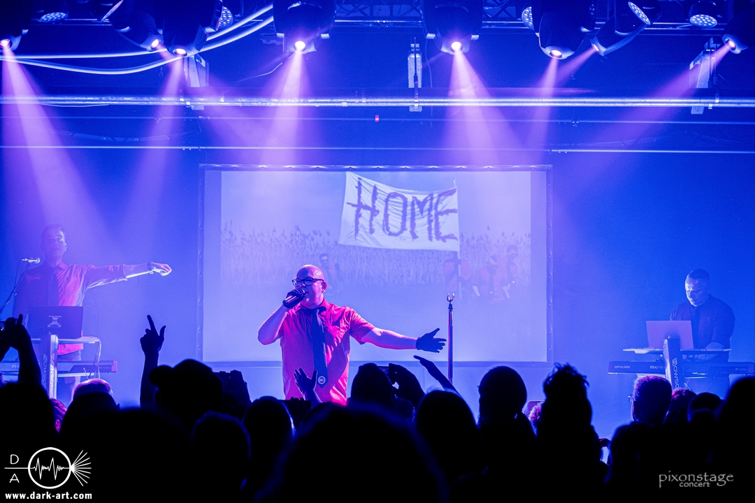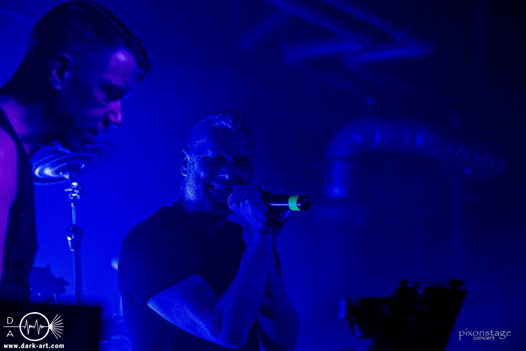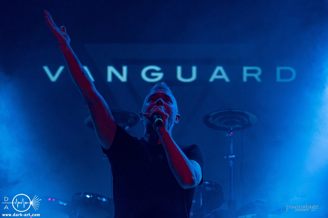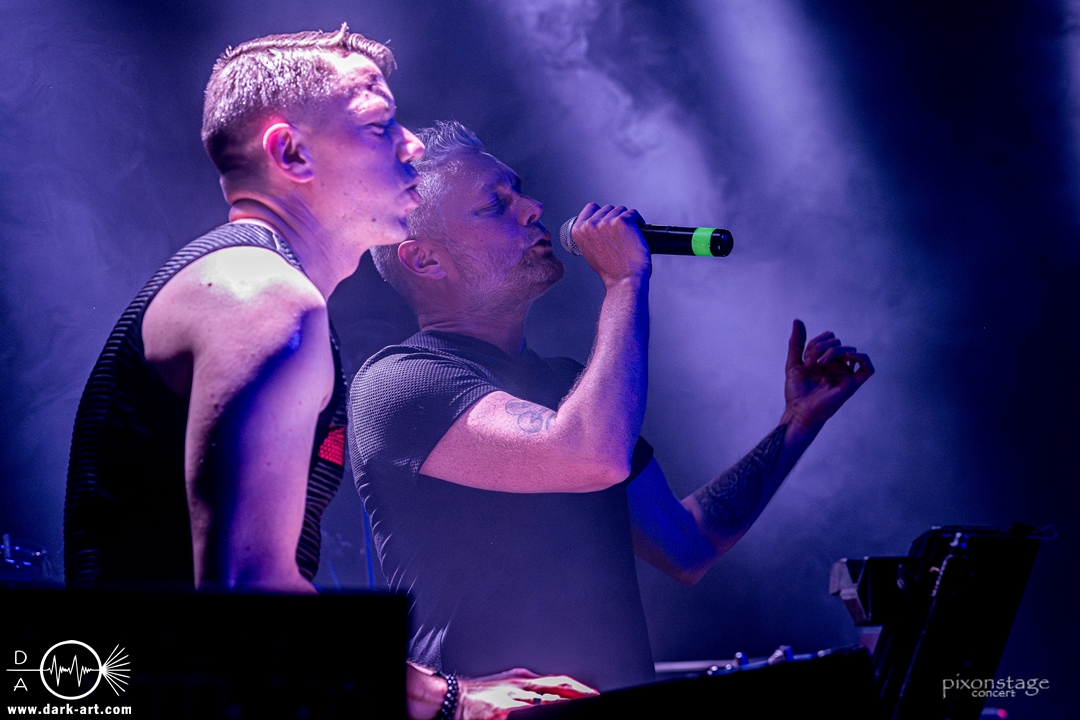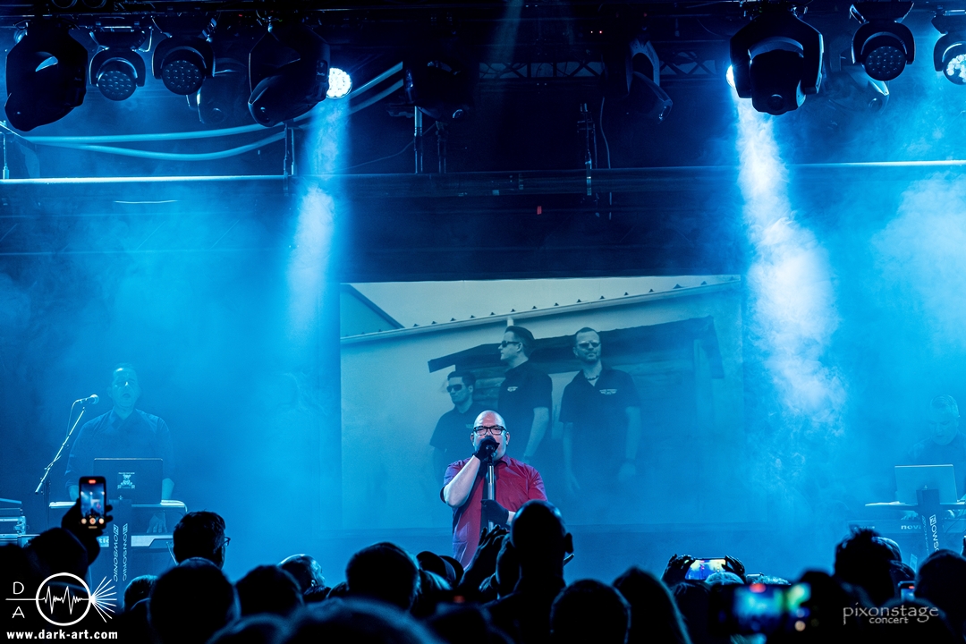 Als nächstes eroberten Vanguard die Bühne. Die schwedischen Vanguard wohlgemeint. Es gibt ja mehrere Bands gleichen Namens. Das schwedische Electronic-Duo bestehend aus Jonas Olofsson und Patrik Hansson veröffentlichte 2012 mit Sancutuary das Debütalbum und spielte sich seitdem in die Herzen der wachsenden Fans. Im November 2025 kam Venom auf den Markt. Kraftvoll starteten sie in die schon aufgeheizte Stimmung der Besucher. Jonas am Drumkit schäumte über vor Energie und animierte, springend, mit erhobenen Armen die Leute dazu, zu klatschen. Zu Punches wechselt er ans Keyboard und die Menge sang den Refrain „Your lie“ lauthals mit. Patrik, der Sänger, nutzte die ganze Bühne aus, ging immer wieder bis vorne zum Rand und immer mehr Leute kamen in Bewegung. Patrik bedankte sich nach jedem Song und auch ein Dankeschön auf Deutsch, während er sich sonst in Englisch verständigte. Jonas wechselte mehrfach zwischen Keyboard und Drumkit, oder unterstützte mit einer Flüstertüte den Gesang von Patrik. Was natürlich nicht fehlen durfte, war der Song Unz, der von durch getanzten Nächten, die in Clubs zum Tag werden, in Deutschland handelt. Dass „Unz, zwei, drei, vier“ vom Publikum aufgegriffen wurde, bedurfte keiner Aufforderung zum Mitmachen und wenn Frankfurt nicht schon im Text vorkommen würde, hätte es an diesem Abend seinen Weg gefunden. Nach dem Song kam von Patrik ein „Frankfurt in my Heart, thank you“. Die neue Single Venom, wurde von den Besuchern ebenso gut angenommen, wie Move on, ein etwas älterer Titel. Vor dem letzten Song bedankten sie sich nochmal „You are so wonderful, thank you so much“ und mit Save me war es vorbei. Noch schnell ein Foto mit allen und eine Verbeugung.