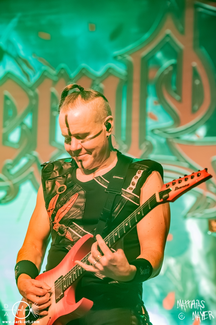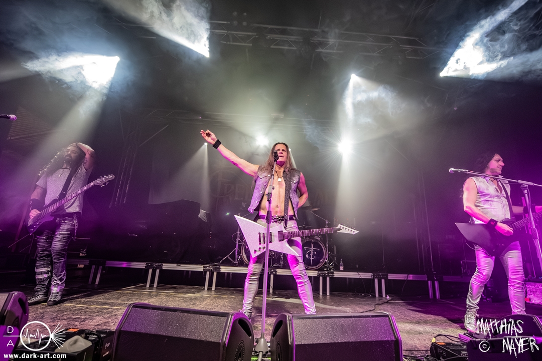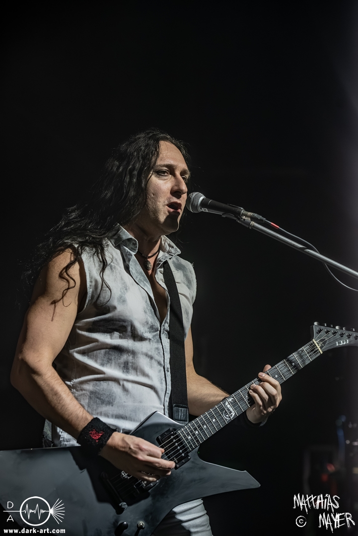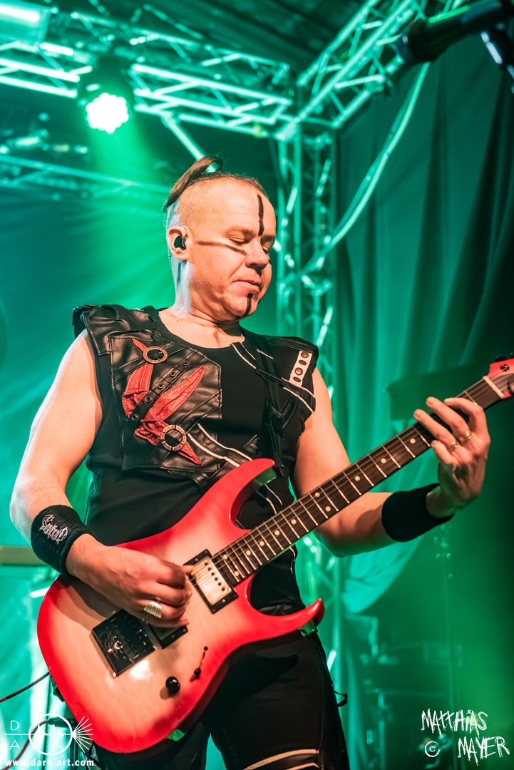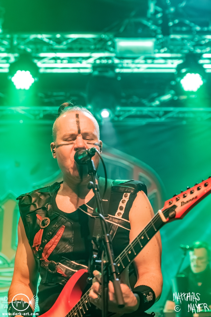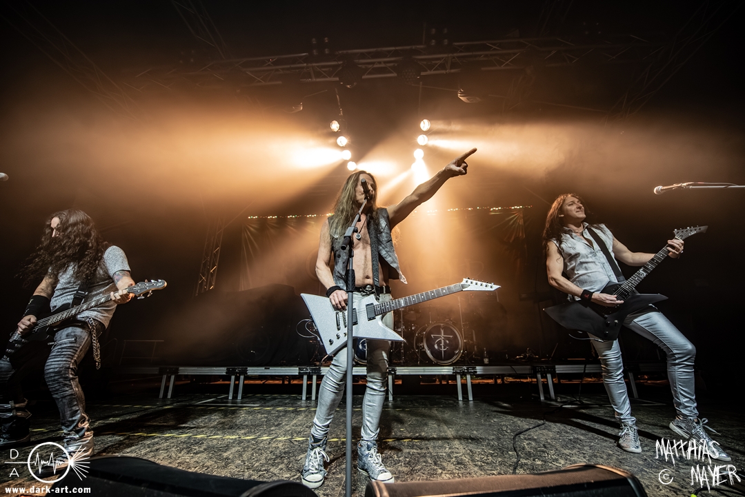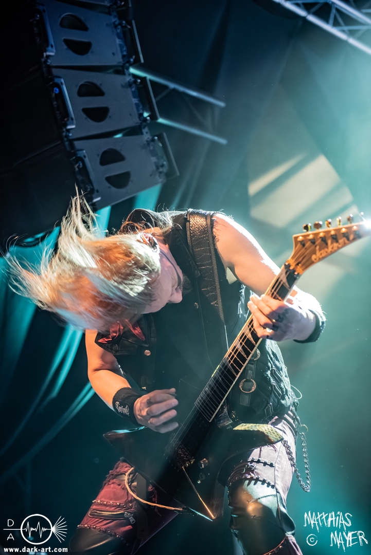 Die österreichischen Power Metaller sorgen mit ihrem melodischen und doch kraftvollen Sound für den perfekten Einstieg. Allerdings performen sie an diesem Abend in stark verminderter Mannschaftsstärke, denn die Grippewelle hat ihren Tourbus fest im Griff. So fehlte Schlagzeuger Chris bereits am Vortag und wird heute durch den Nürnberger Dario Trennert ersetzt, der über Nacht die komplette Setlist einstudiert hat und eine perfekte Show abliefert. Auch sonst sieht es auf der Bühne etwas leer aus, ohne Keyboard und Bass. Hierzu gibt es jedoch keine weitere Info von der Band.