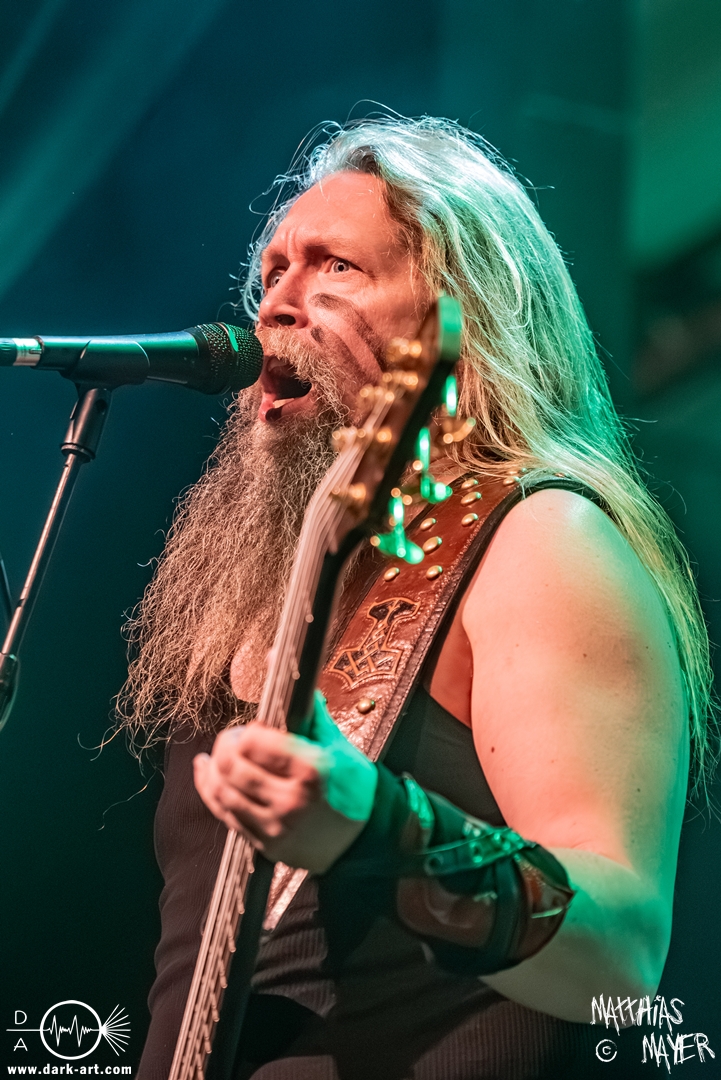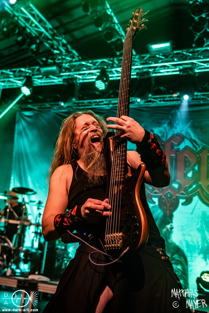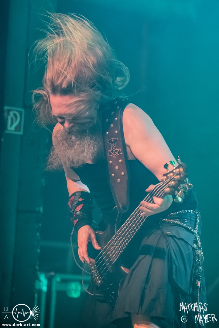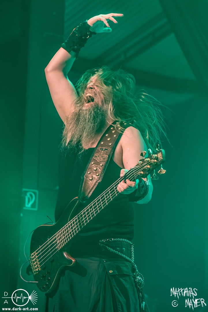 Auch wenn nicht sofort Bewegung in die Menge kommt, wird Ensiferum gefeiert, durch Headbangen, Klatschen und lautstarke Hey-Rufe. Frontmann Petri Lindroos dominiert mit gekonnten Growls und kraftvollen Vocals, während Pekka Montin am Keyboard immer wieder mit melodischen Gesangsparts für Kontraste sorgt. Dazu lässt Sami am Bass ausdauernd seine lange Mähne beim Headbangen fliegen.