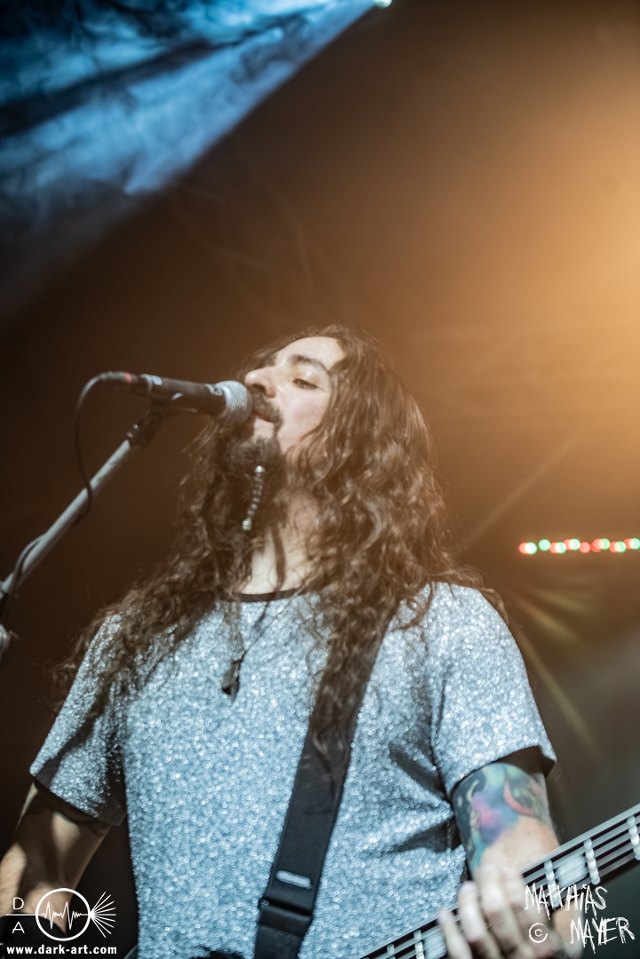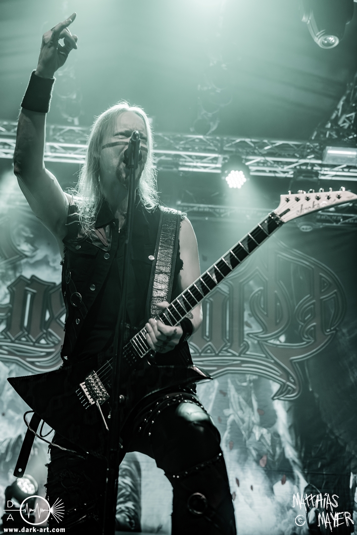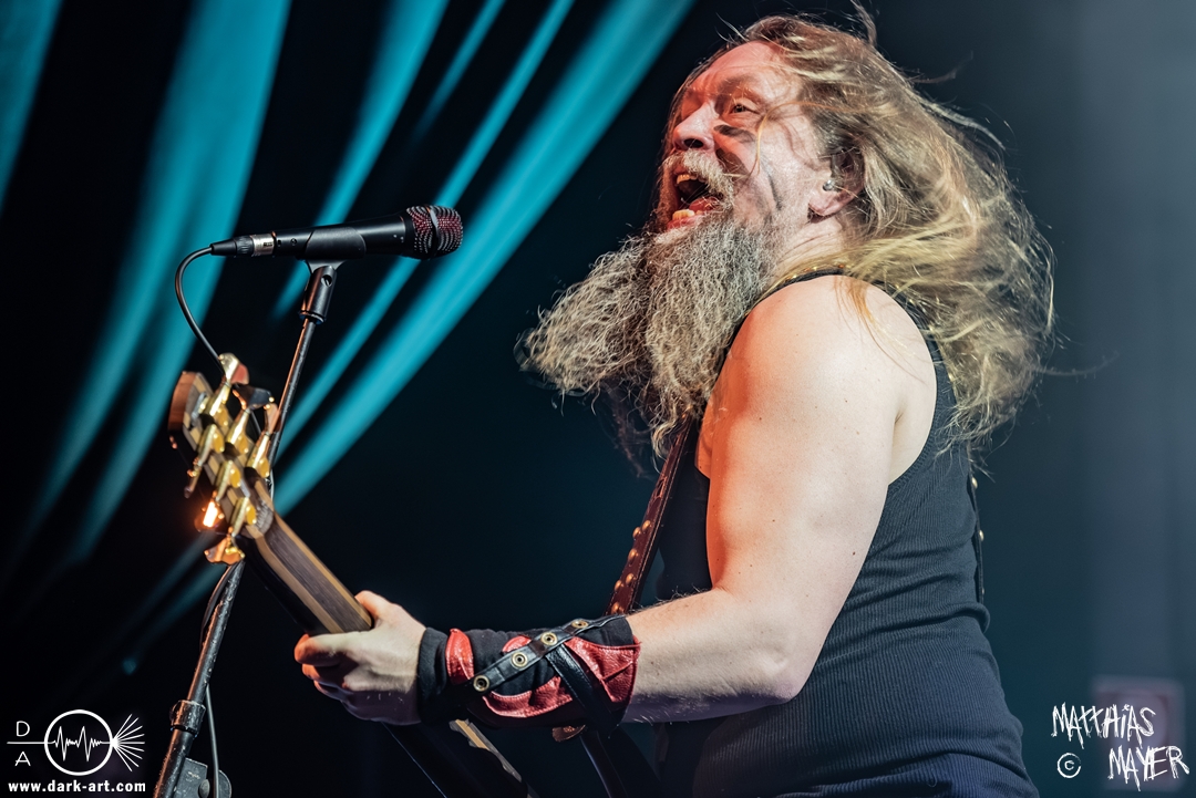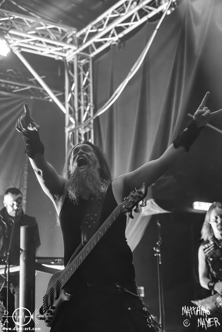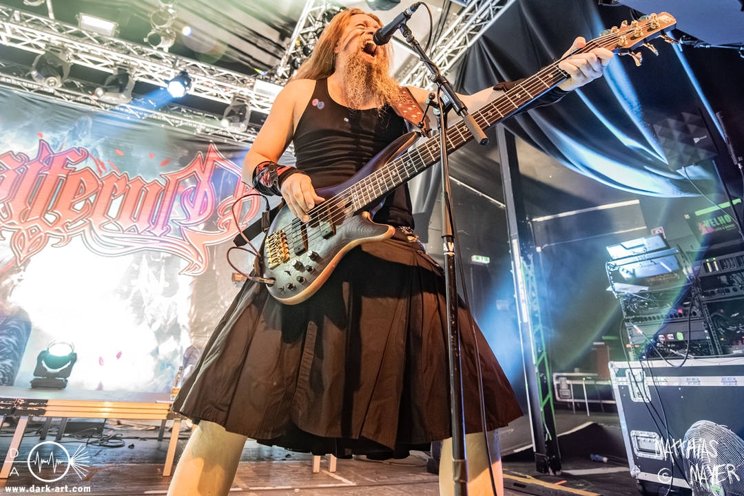 Auch wenn nicht sofort Bewegung in die Menge kommt, wird Ensiferum gefeiert, durch Headbangen, Klatschen und lautstarke Hey-Rufe. Frontmann Petri Lindroos dominiert mit gekonnten Growls und kraftvollen Vocals, während Pekka Montin am Keyboard immer wieder mit melodischen Gesangsparts für Kontraste sorgt. Dazu lässt Sami am Bass ausdauernd seine lange Mähne beim Headbangen fliegen.