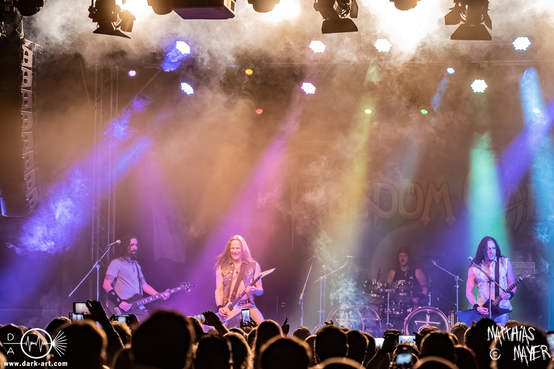 Weiter geht es mit der fröhlichsten Metal Band der Welt und dem Motto Happy Metal, performt von der Melodic Metal Formation Freedom Call. Bereits beim Intro lässt sich die Band gebührend feiern, um direkt beim ersten Song Hammer of Gods kraftvoll loszulegen. Auch das Publikum ist glücklich und springt schon beim zweiten Lied, Tears of Babylon kräftig mit. Inzwischen haben sich auch die letzten Lücken in den Zuschauerreihen geschlossen und die Happy-Metal-Party ist in vollem Gange.