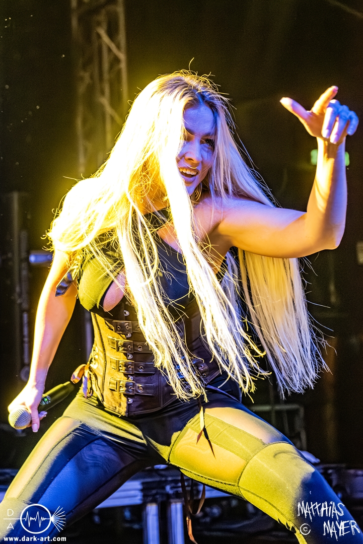 Als schließlich We salute you von AC/DC als Pausenmusik ertönt, ist es soweit und der Headliner des heutigen Abends betritt zum Intro Aurora die Bühne. Passend zum aktuellen Album Winter Storm lautet der Titel ihrer Tour Winter Storm over Europe und die Metal Macht aus Finnland macht ihrer Mission alle Ehre und nimmt die anwesenden Metalheads mit auf eine Reise voller Epik, Hymnen und Kampfgeist. Das erste Lied wird direkt headbangend und growlend eingeleitet und so soll es auch weitergehen. Die Aufforderung zum ersten Moshpit beim zweiten Lied Guardians of Fate wird zunächst nicht umgesetzt, was wohl unter anderem an einem Stehtisch liegt, der sich in den vorderen Reihen zum Abstellen von Bierbechern befindet und vermutlich nicht offiziell dort hingetragen wurde. Doch die Stimmung ist entspannt und niemand stört sich daran. Apropos Bier: Das Lied One More Magic Potion ist nun all jenen Fans gewidmet, die es lieben, viel Bier zu trinken. Da wir im Bierland Franken sind, dürfte das auf die meisten der Anwesenden zutreffen, und die nächste Bar für ein frisch gezapftes Mönchshof Bier ist auch nicht weit.