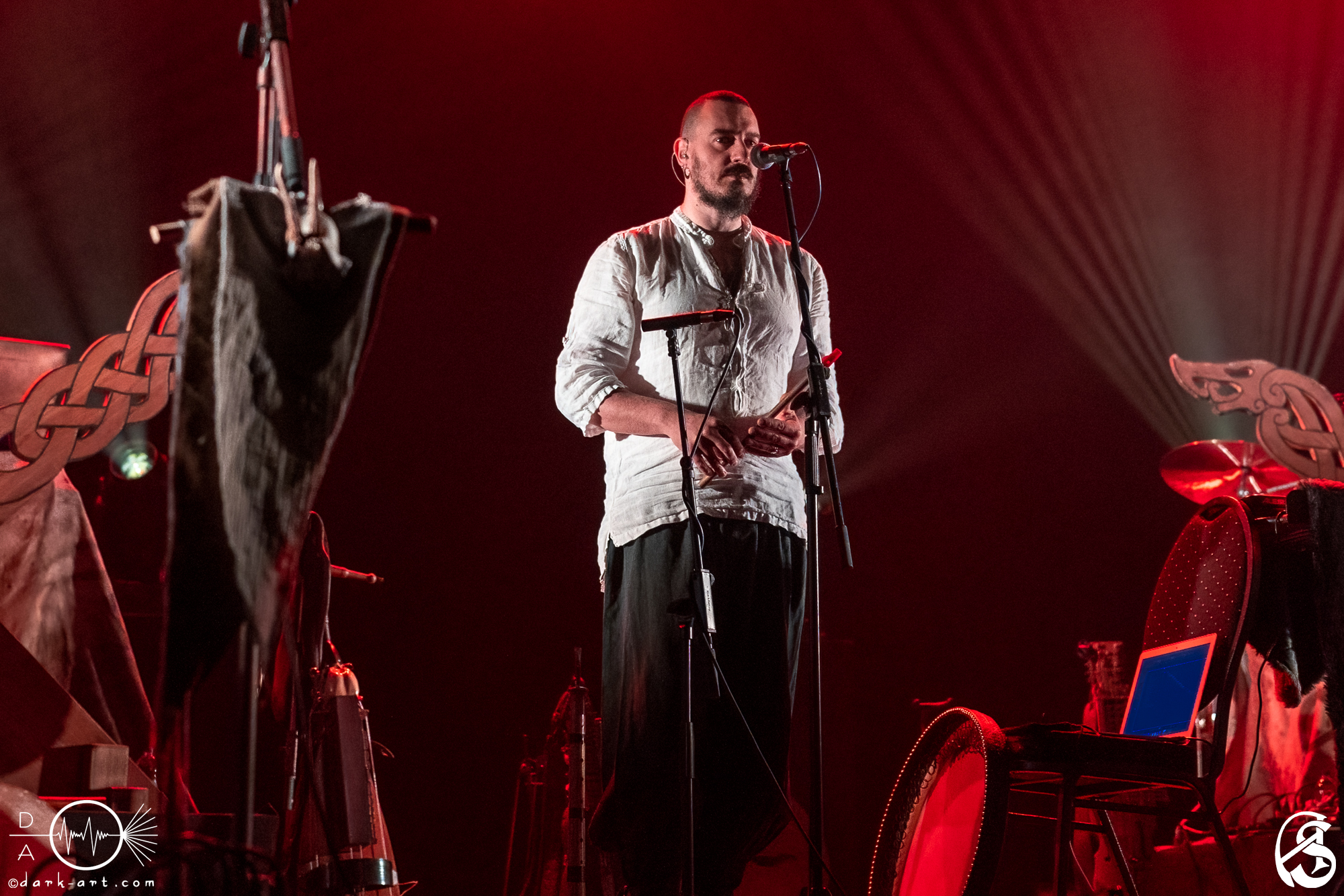Es folgten noch einmal gut 20 min Pause, in welcher sich die Gäste, ganz in Ruhe, noch ein Getränk oder eine frisch gebackene Brezel kaufen konnten. Ein Bühnenumbau fand nicht statt, da EMIAN sich auf der bereits fertig vorbereiteten Bühne des Hauptacts positioniert hatten. So konnte das Publikum bereits jetzt das volle Ausmaß der Bühnendekoration betrachten, welches lediglich aus zwei Wikinger-Kreuzen, je eines vor der Technik und eines vor dem Schlagzeug, bestand. Passend zur Location kündigte dann der Theatergong den baldigen Beginn von Faun an. Die Zuschauerreihen füllten sich nun komplett und die Türen des Saals wurden das zweite Mal geschlossen. Gegen 19:36 Uhr verdunkelte sich das Licht erneut und Oliver „SaTyr“ Pade und seine 5 Bandkollegen und -Kolleginnen betraten die Bühne. Der Konzertabend wurde mit dem Song Baldur eingeleitet. Bereits in diesem ersten Lied stellte das Sechser-Gespann sein volles musikalisches Können unter Beweis. Untermalt durch die Sampler-Sounds von Niel Mitra, kamen instrumentalisch zunächst ein Dudelsack, eine Flöte, Percussions und eine Laute zum Einsatz. Dieses harmonische Zusammenspiel wurde durch Gesang und taktvollen Tanz dann direkt zu einem kleinen Bühnenspektakel, welches die Zuschauer von Anfang an begeistern konnte. Mit dem Ausklingen der letzten Takte des Songs hieß Frontmann SaTyr das Publikum erstmal herzlich willkommen und erklärte das Ziel des Abends. Jede Person im Saal, sollte eine Einführung in die heidnischen Mythen und Rituale bekommen und es sei völlig in Ordnung, wenn den einen oder anderen die wilde Tanzlust packe, denn am Ende des Konzerts würden eh alle im Saal nackt und unbekleidet tanzen (Spoiler Alert: Es wurde zwar getanzt, das Publikum blieb jedoch bekleidet).