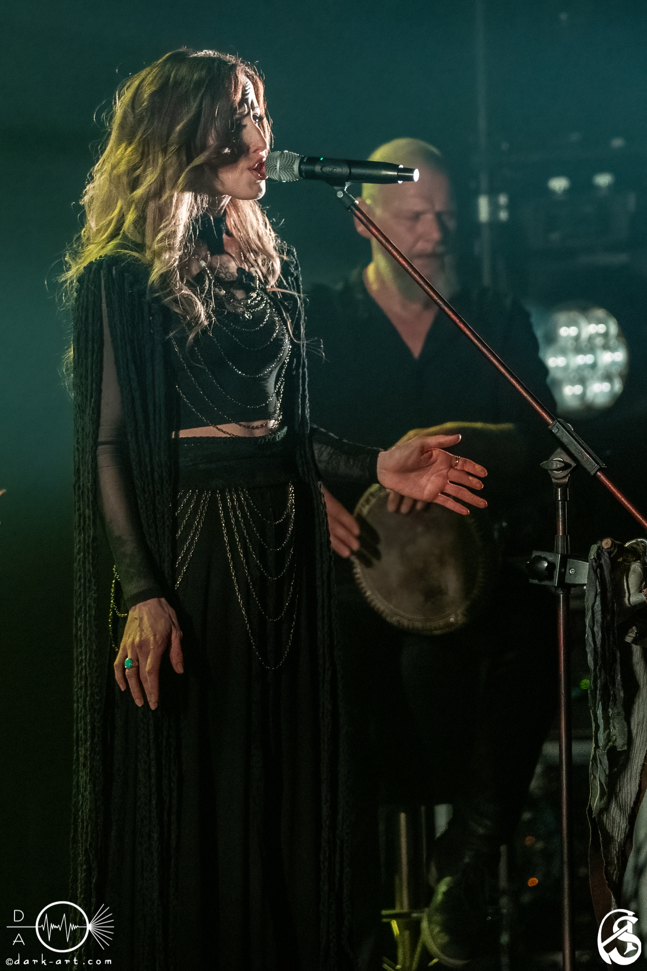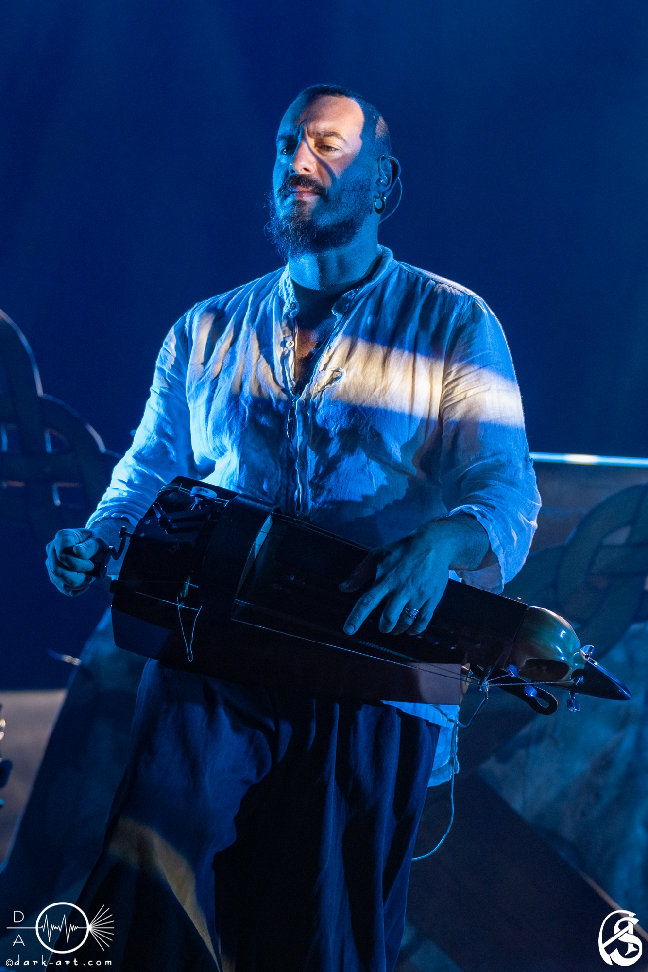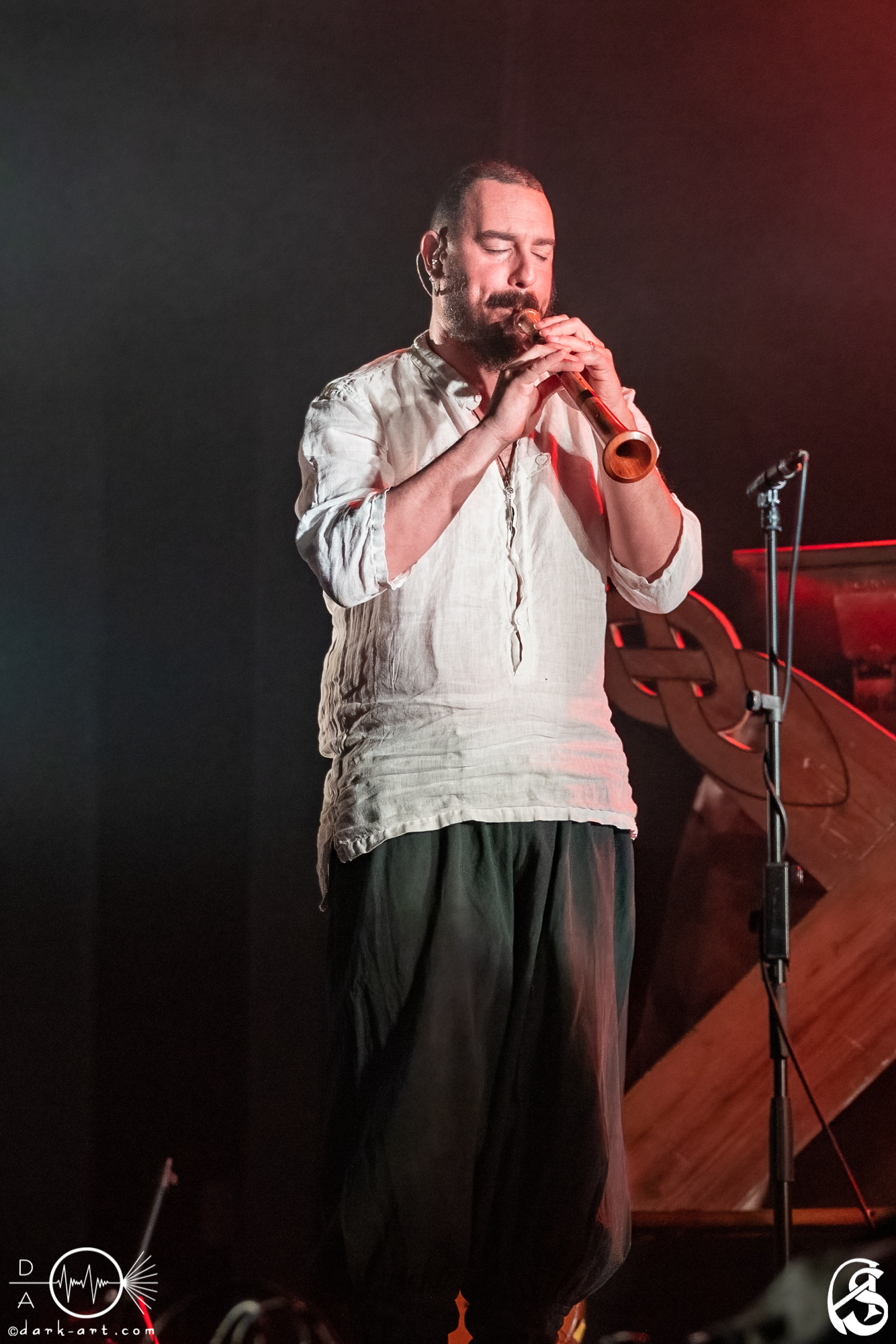 Nachdem noch kurz über den organisatorischen Punkt aufgeklärt wurde, dass es eine Pause während des Konzerts geben wird, ging es direkt weiter mit der bunt durchmixten Setlist aus geschichtsträchtigen und mythischen Balladen und fantastischen instrumentalen Parts. Nahezu jeder Song erzählte seine ganz eigene Geschichte und Oliver war auch stets darauf bedacht, diese Geschichten der Zuhörerschaft zu erklären und näherzubringen. Im Song Alba wurde zum Beispiel der Sonnenaufgang thematisiert. Dies sollte ein Zeichen der Hoffnung für einen neuen Tag oder brandaktuell, für die jetzige Zeit nach den Corona-Lockdowns, setzen. Passend zum Thema wurde die Bühne auch in rotes und blaues Licht gehüllt. Generell hielt sich die Lichtshow, während der meisten Songs, eher an dunklere Farben, wie Rot, Blau und teilweise auch Grün. Das Lied Walpurgisnacht löste im Publikum ganz besonders viel Freude aus. Die Menge klatschte und jubelte und die ersten Tanzwütigen begaben sich an die Ränder des Theaters, um sich dem Rhythmus der Musik hinzugeben. Auf Niel Mitras Fingerzeig hin, sang der gesamte Saal im Refrain laut „HEHIOOOH“. Außerdem begeisterte Adaya Lancha de Baïracli Levy die Menge mit einem stimmungsvollen Flöten-Solo. Der Titel Gwydion handelte von einem sehr mächtigen keltischen Zauberer, welcher in eine große Schlacht ziehen musste. Hierfür bediente er sich der Bäume, die er zum Leben erwachen ließ, als unterstützende Armee.